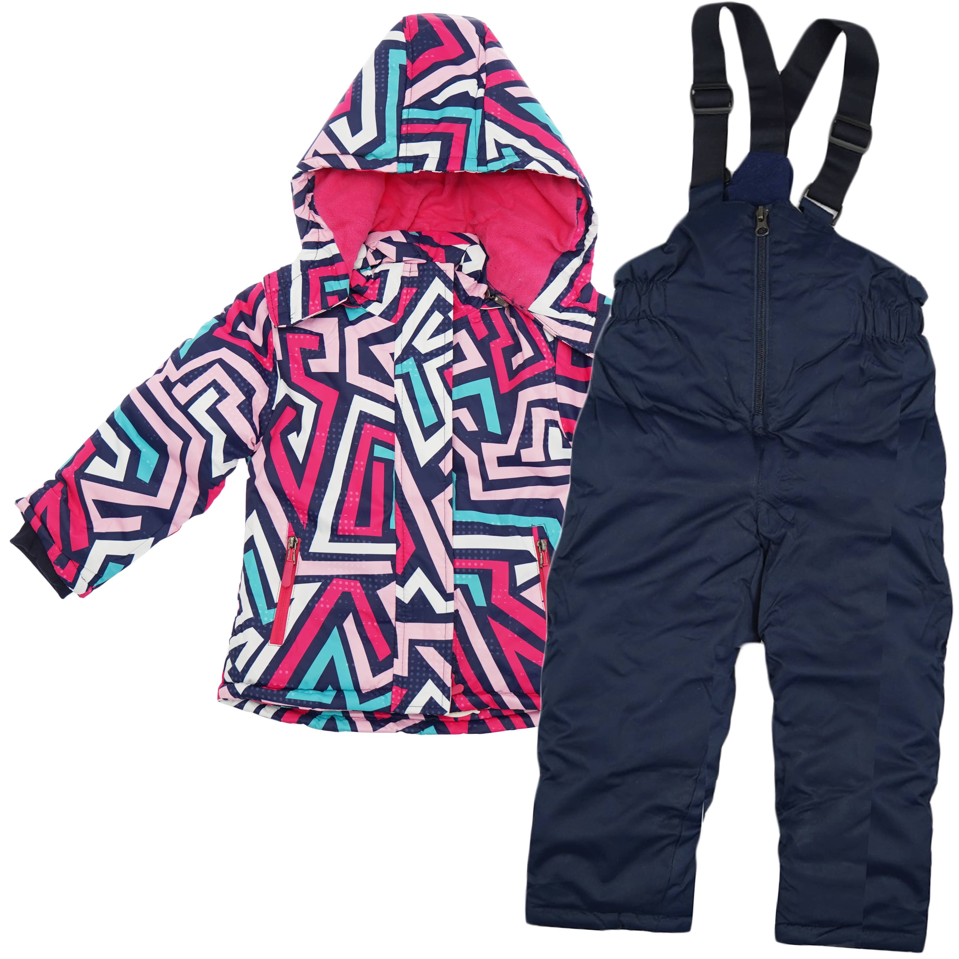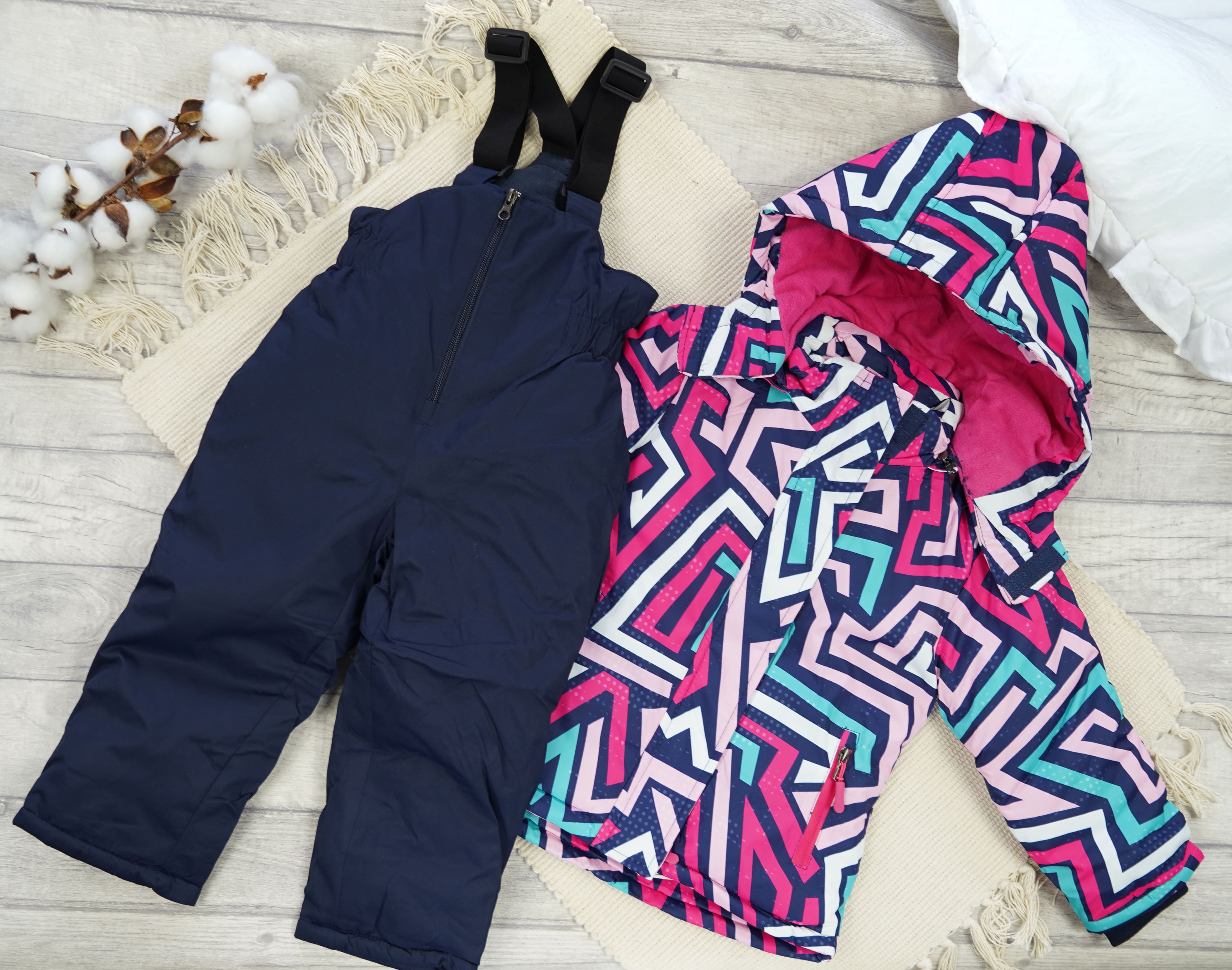 Kombinezon zimowy dla dziecka, w skład którego wchodzą: zapinana na suwak i rzepy ciepła, granatowa kurtka zimowa we wzory oraz granatowe spodnie typu narciarskiego.