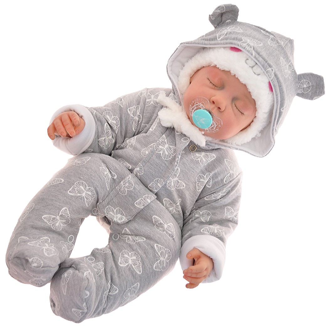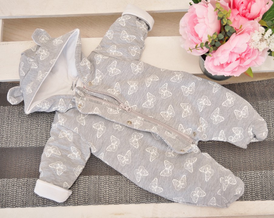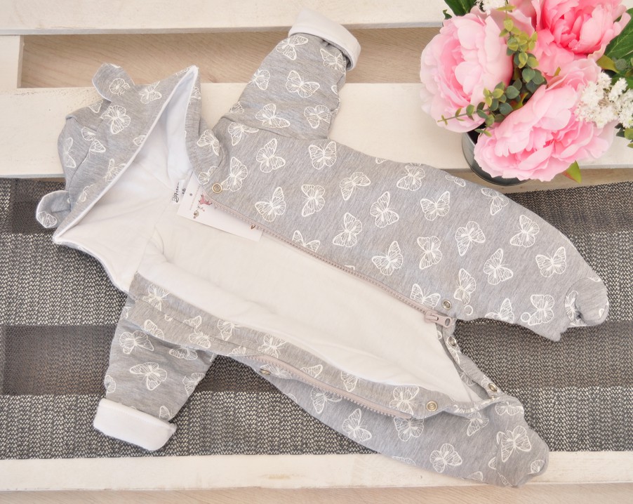 Wiosenno-jesienny pajacyk z kapturkiem i wesołymi uszkami. Zasuwany od kroku pod samą szyję na wygodny zamek ukryty pod ozdobną klapką zapinaną na napki. Posiada dodatkowo napki w kroku umożliwiające całkowite rozpięcie kombinezonu co znacznie ułatwia szybkie ubieranie dziecka. Kombinezon uszyty z 2 warstw bawełny, z zewnątrz szara bawełna drukowana w białe motylki, od wewnątrz bawełna w kolorze białym. Kaptur z zabawnymi uszkami obszyty od wewnątrz bawełnianą podszewką osłoni głowę dziecka przed zimnymi podmuchami wiatru.