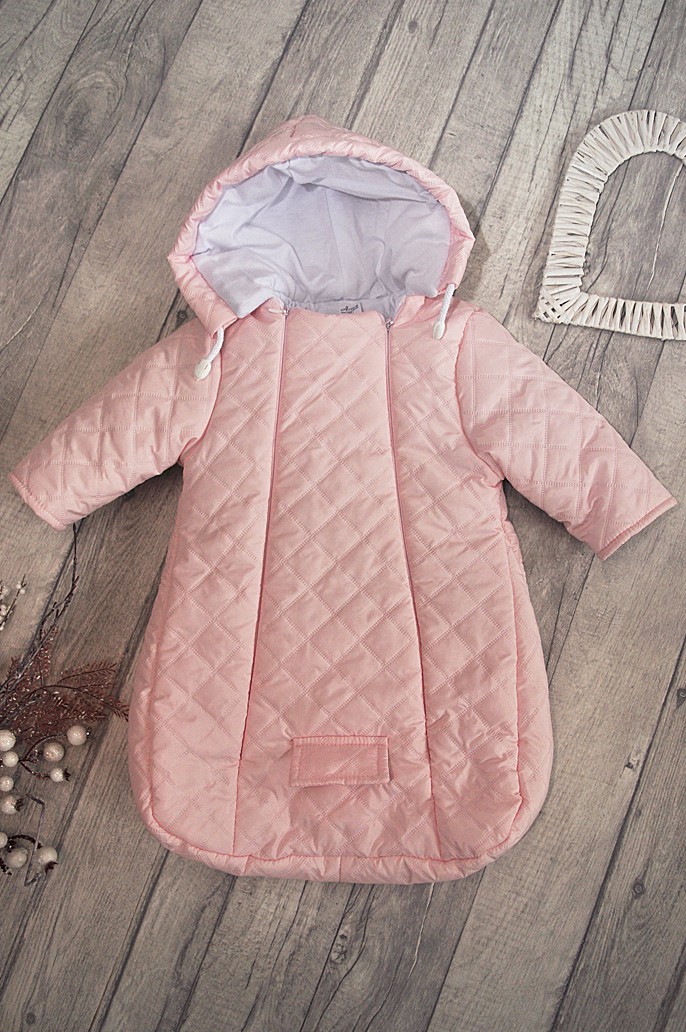 Śliczny pikowany śpiworek w kolorze różowym.