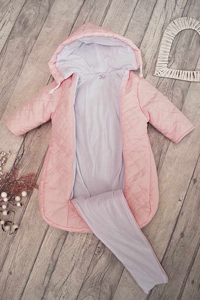 Różowy kombinezon niemowlęcy w formie śpiworka dla tych rodziców, którzy nie lubią władać nóżek do kombinezonów.