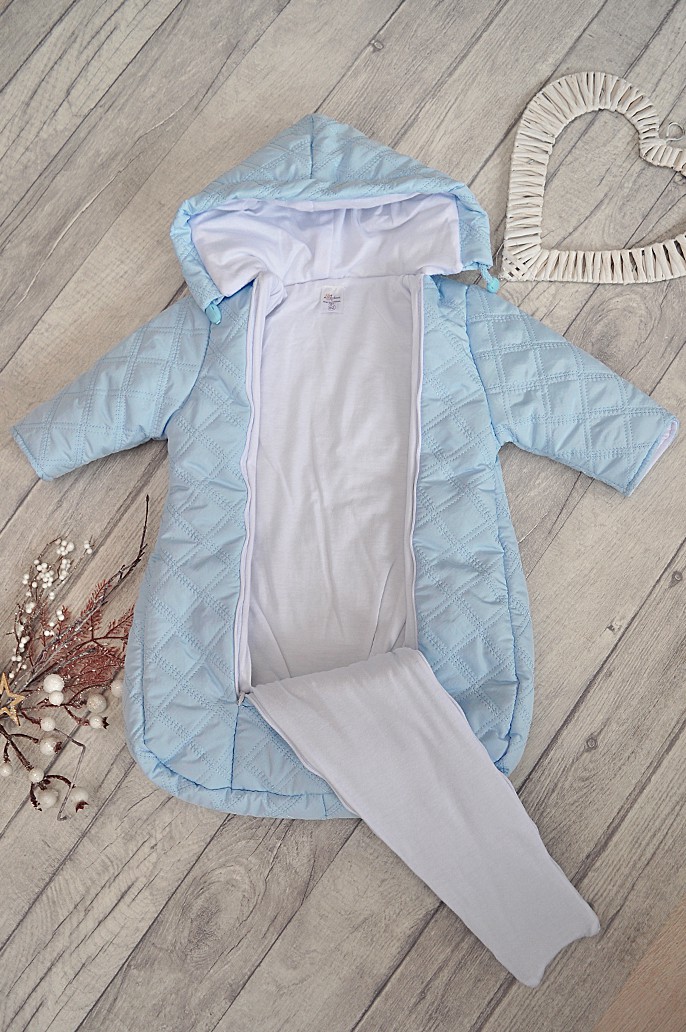 Niebieski kombinezon niemowlęcy w formie śpiworka dla tych rodziców, którzy nie lubią władać nóżek do kombinezonów.