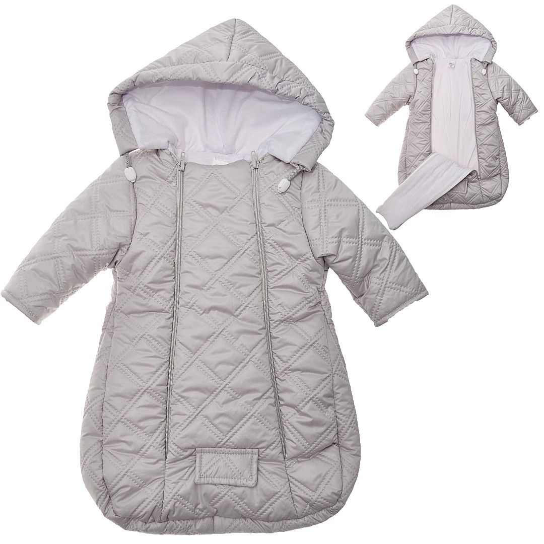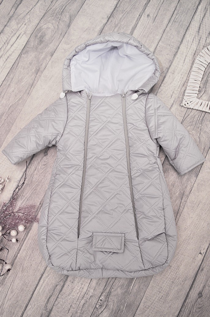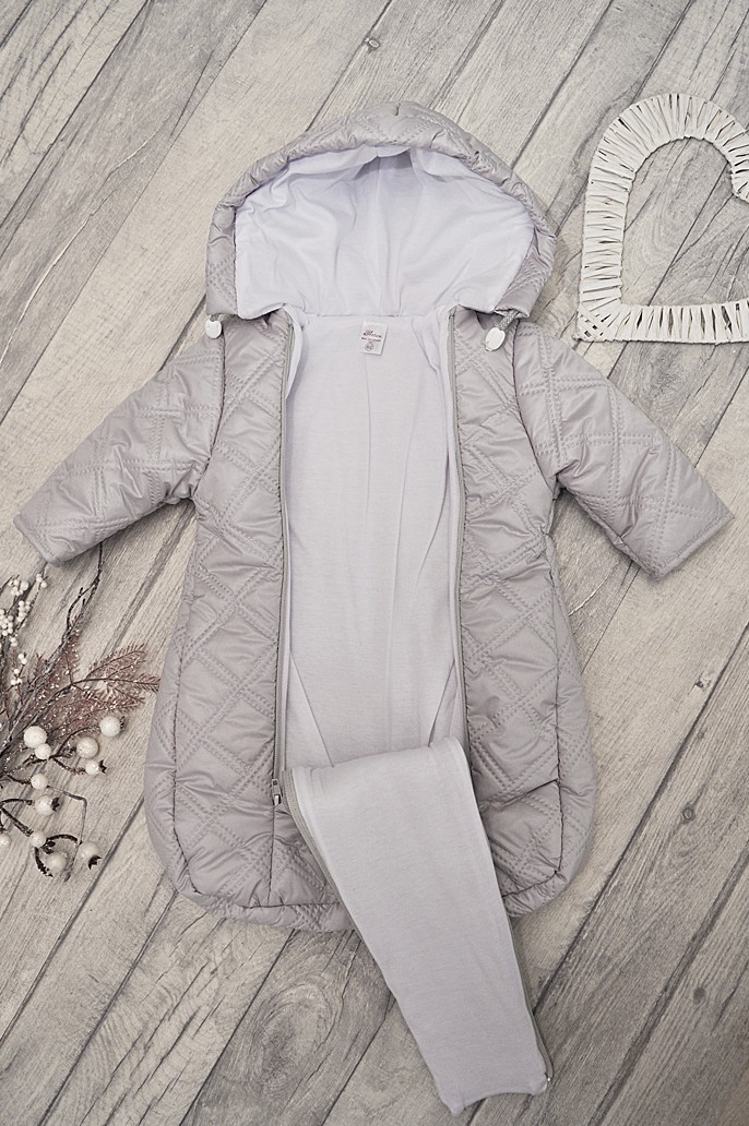 Szary kombinezon niemowlęcy w formie śpiworka dla tych rodziców, którzy nie lubią władać nóżek do kombinezonów.
