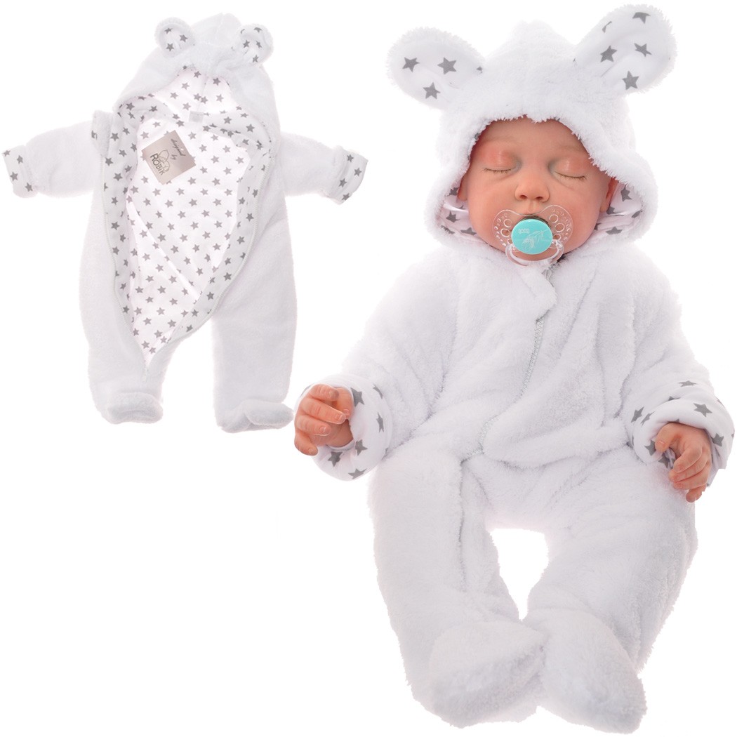 Pajac niemowlęcy z kapturem zapinany po boku przez całą długość na suwak wykonany z dzianiny typu miś. Biała bawełniana podszewka w szare gwiazdki oraz odstające uszka zamocowane na kapturze dodają kombinezonowi wyjątkowego uroku.