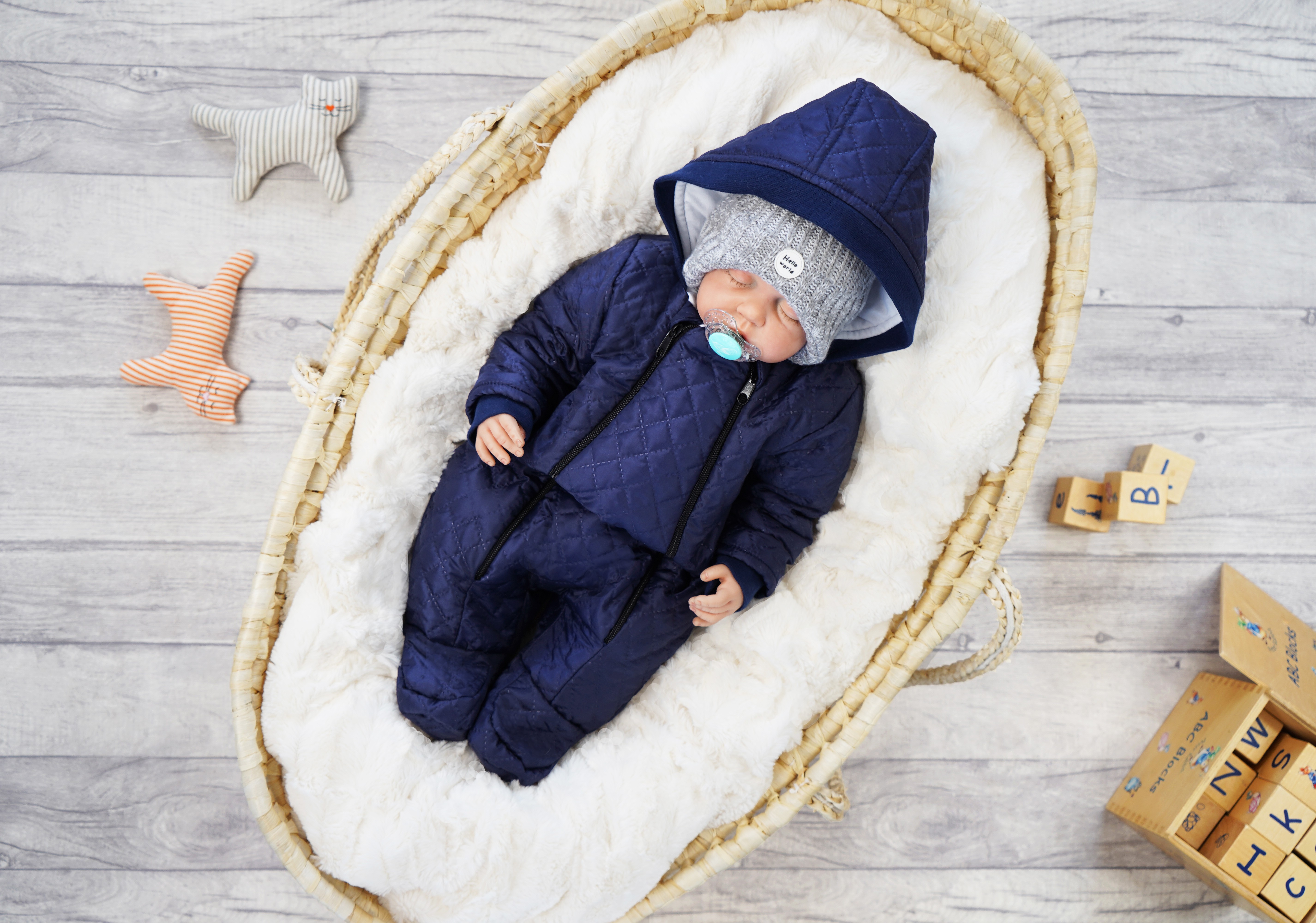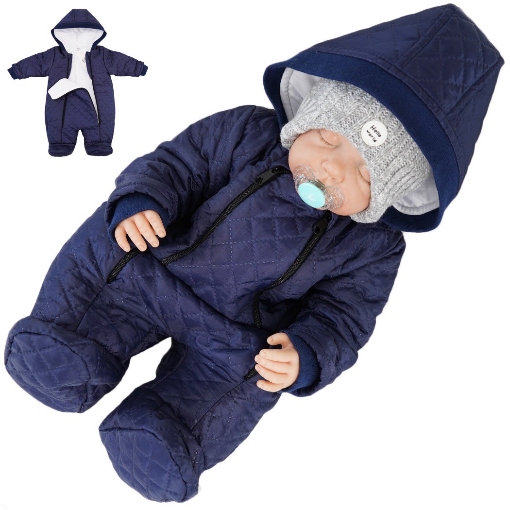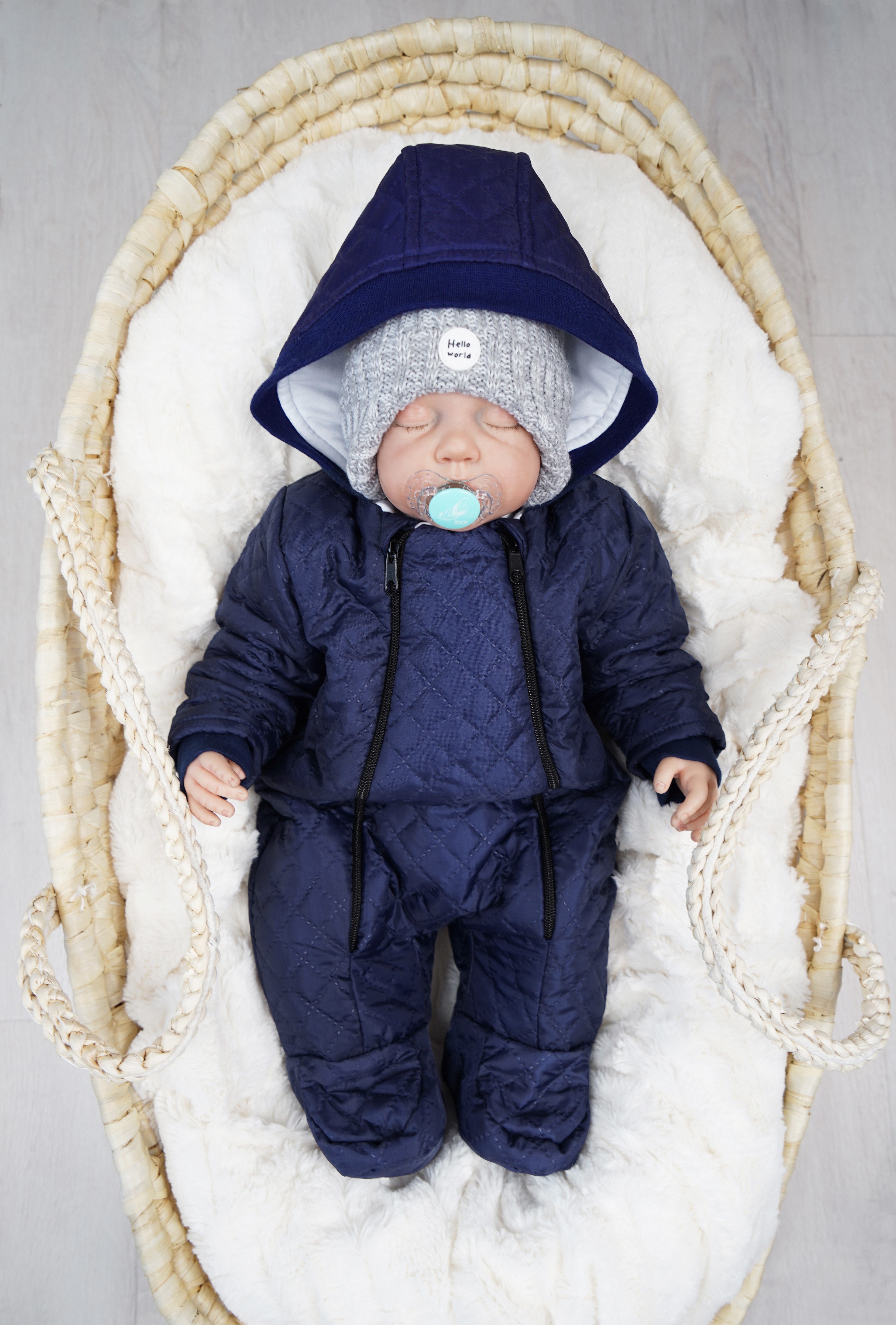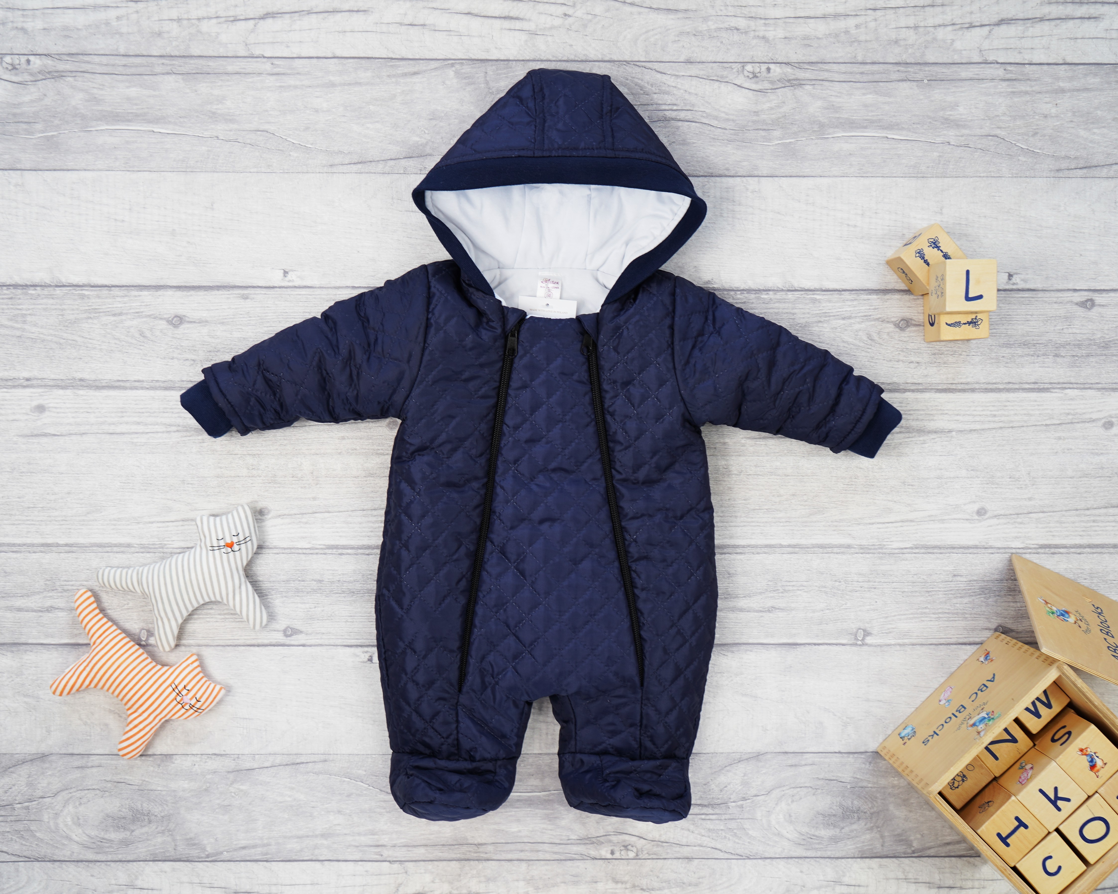 Granatowy kombinezon dziecięcy z kapturkiem ze stópkami, dzięki czemu nie musimy martwić się o dodatkowe obuwie. Kombinezon dla niemowlaka zapinany na dwa suwaki, obszyty od wewnątrz mięciutką i przyjemną w dotyku białą dzianina. Rękawy kombinezonu oraz kaptur zostały wyposażone w specjalne ściągacze, które powodują mniejsze podwiewanie w trakcie wiatru. Kombinezon dziecięcy pikowany z nieprzepuszczalnej tkaniny kurtkowej posiada warstwę ociepliny. Granatowy kombinezon dla dziecka doskonale sprawdzi się na jesień i wiosnę a także lekką zimę.