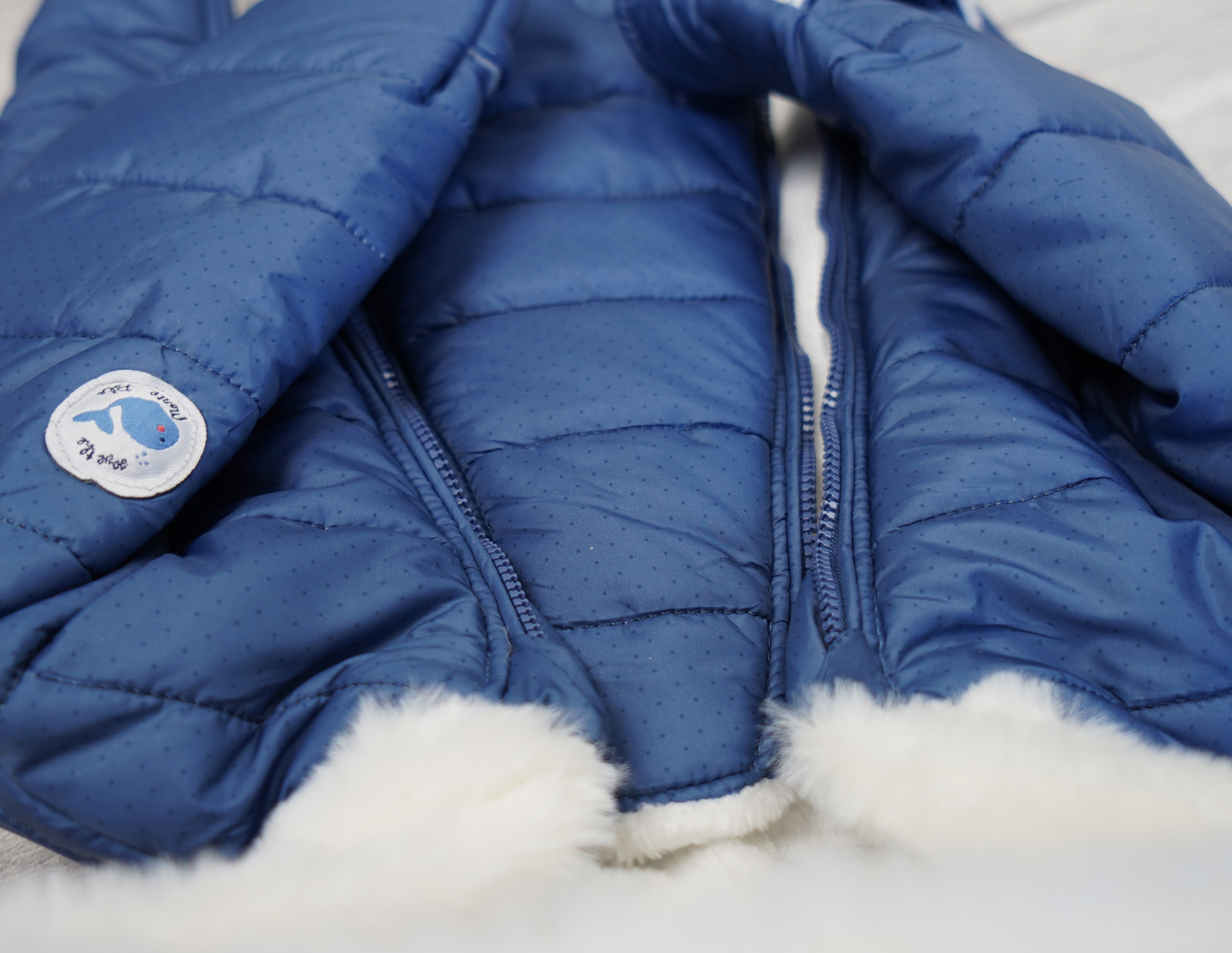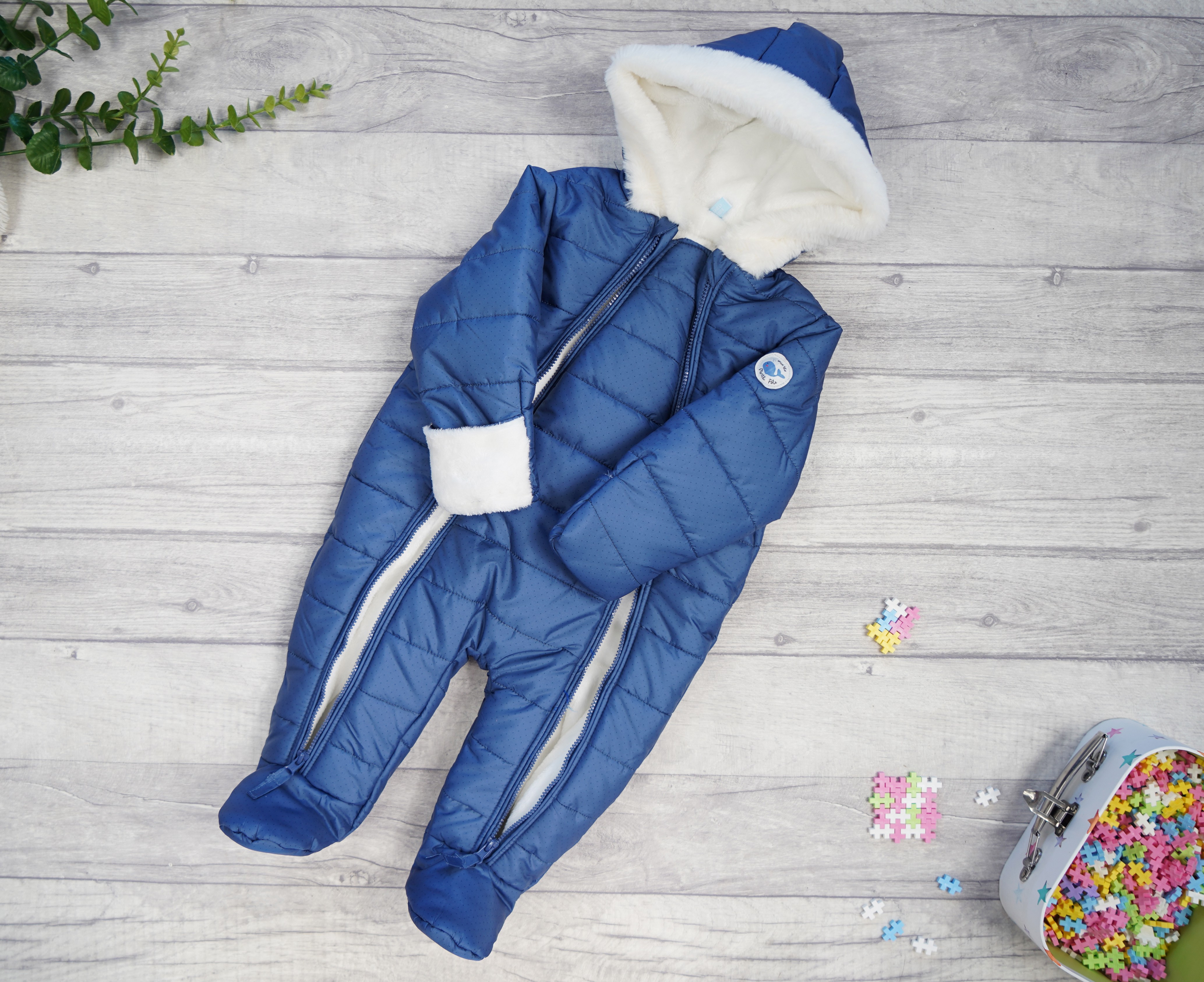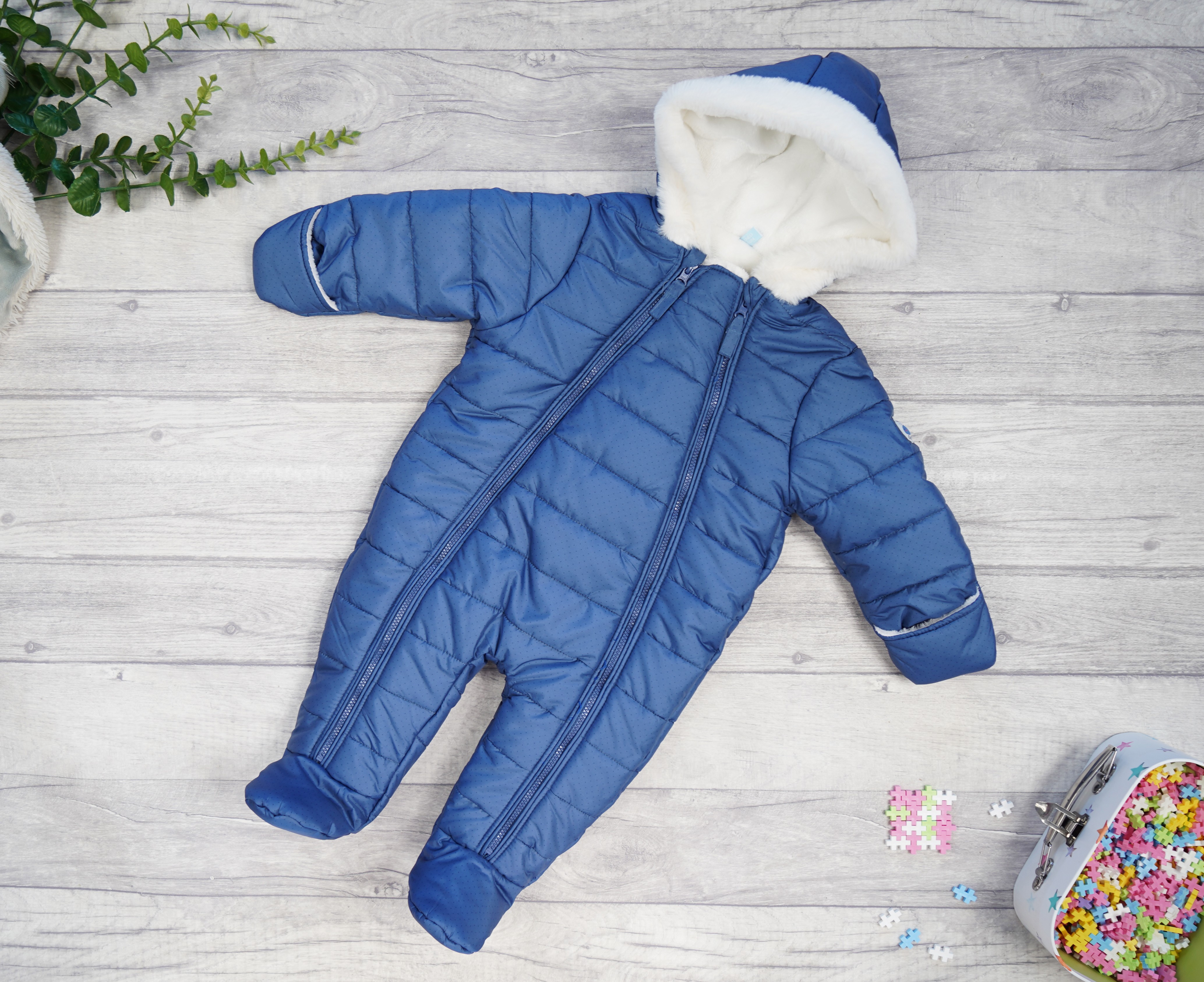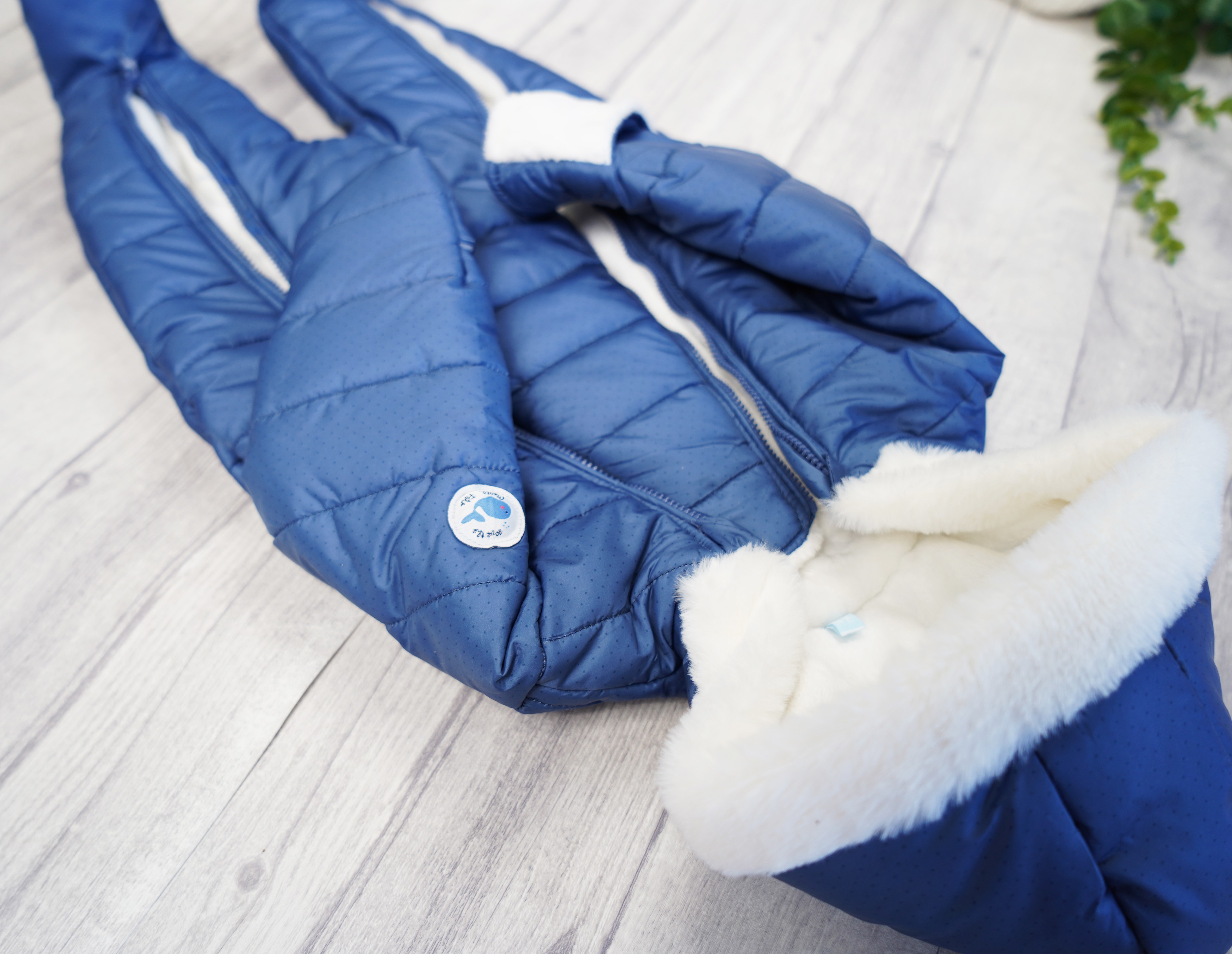 Granatowy kombinezon dziecięcy zapinany przez całą długość na 2 suwaki, dzięki temu spokojnie i bez niepotrzebnego przeciskania ubierzesz swojego malucha. Kombinezon posiada ocieplany kaptur oraz specjalne zakładki na rękawach, które po odwinięciu służą jak rękawiczki chroniąc dłonie maluszka. Warstwa wewnętrzna kombinezonu niemowlęcego wykonana jest z mięciutkiego i przyjemnego w dotyku misia. Warstwa zewnętrzna chroni od wiatru.