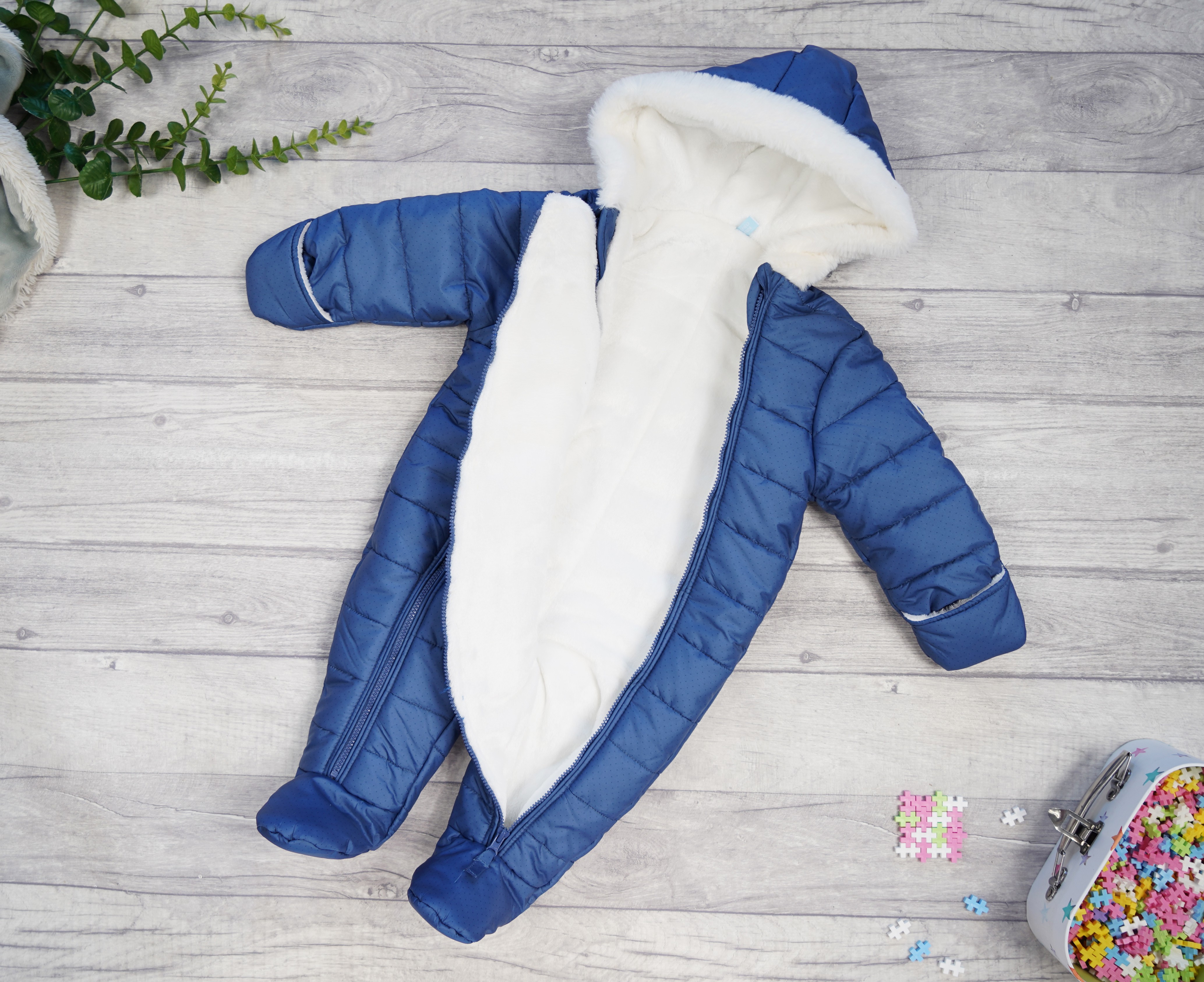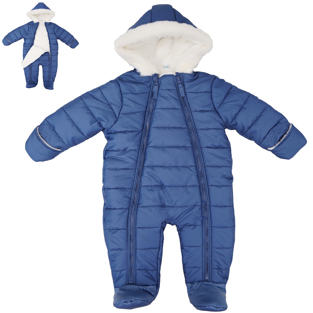 Pikowany kombinezon dla niemowlaka z futerkową warstwą wewnętrzną w drobne kropeczki.