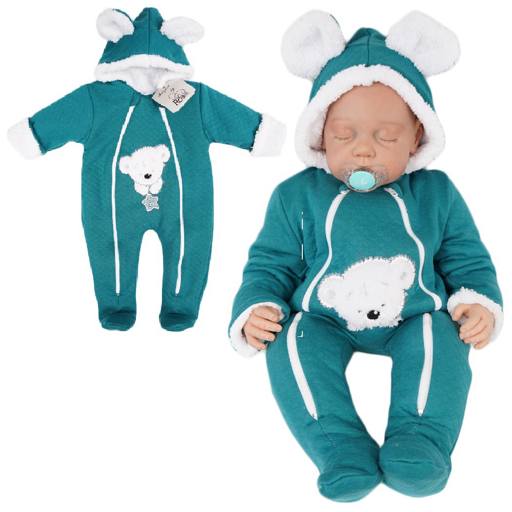Kombinezon niemowlęcy posiada cudowny haft z misiem oraz uszy umieszczone na kapturku.