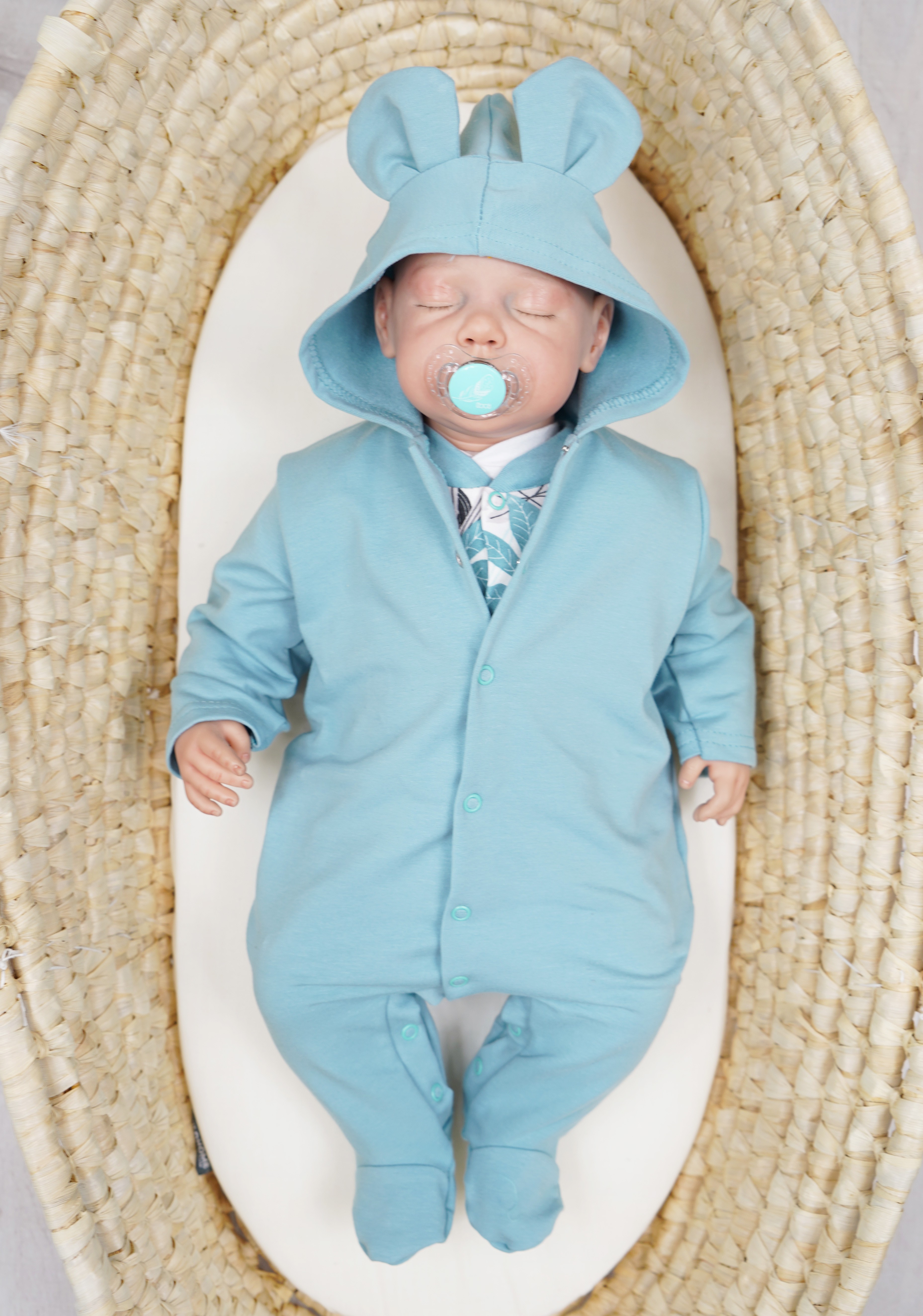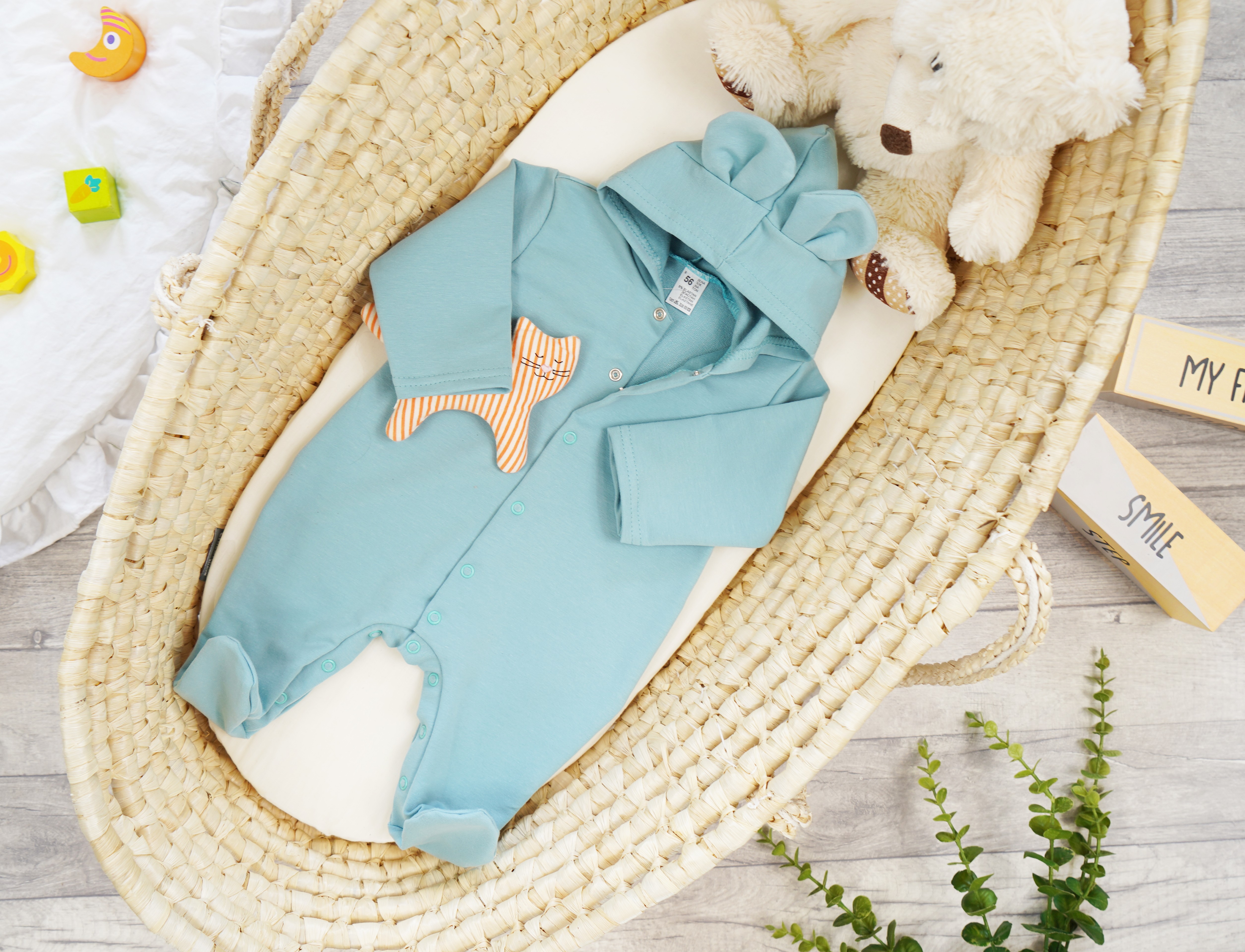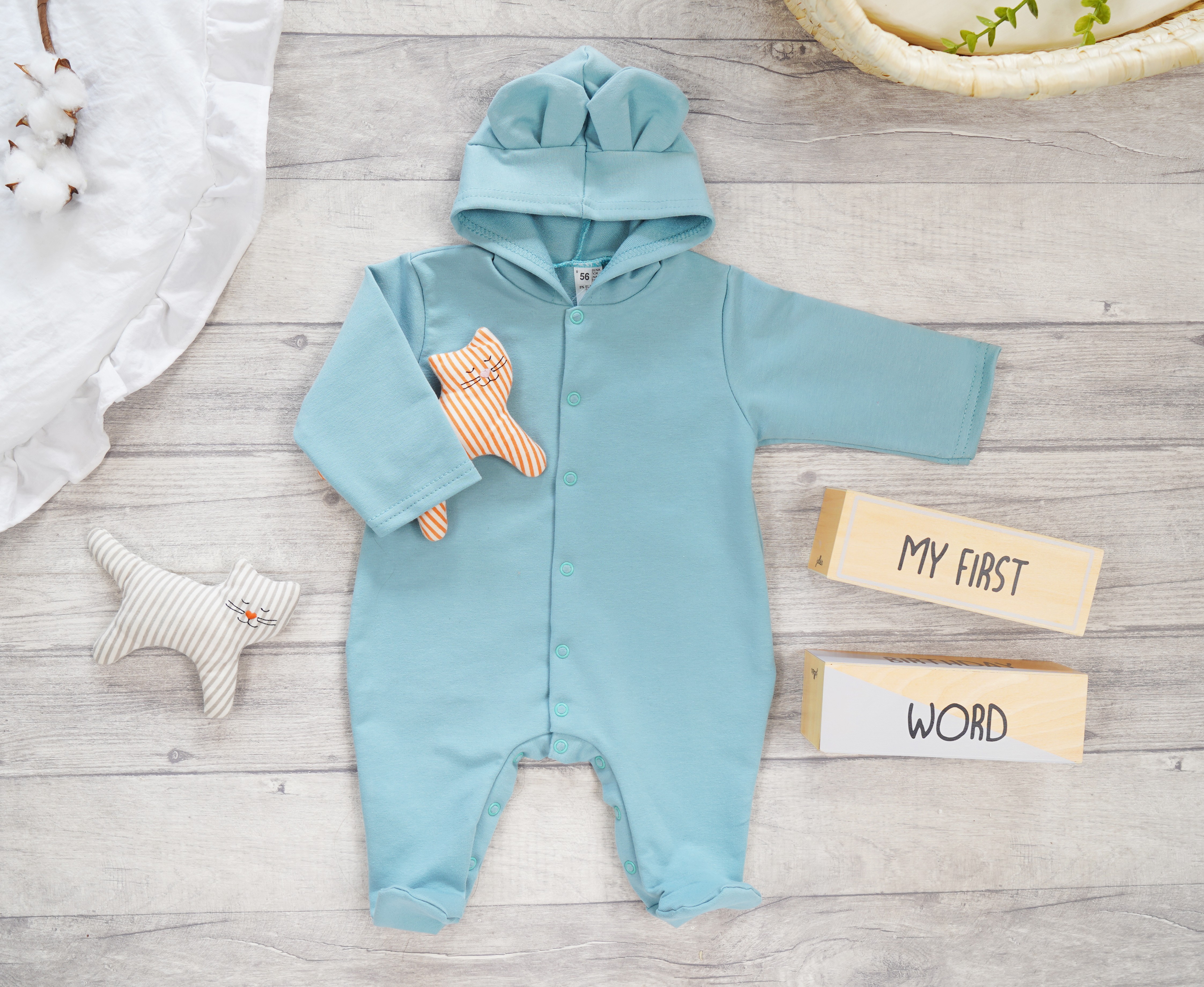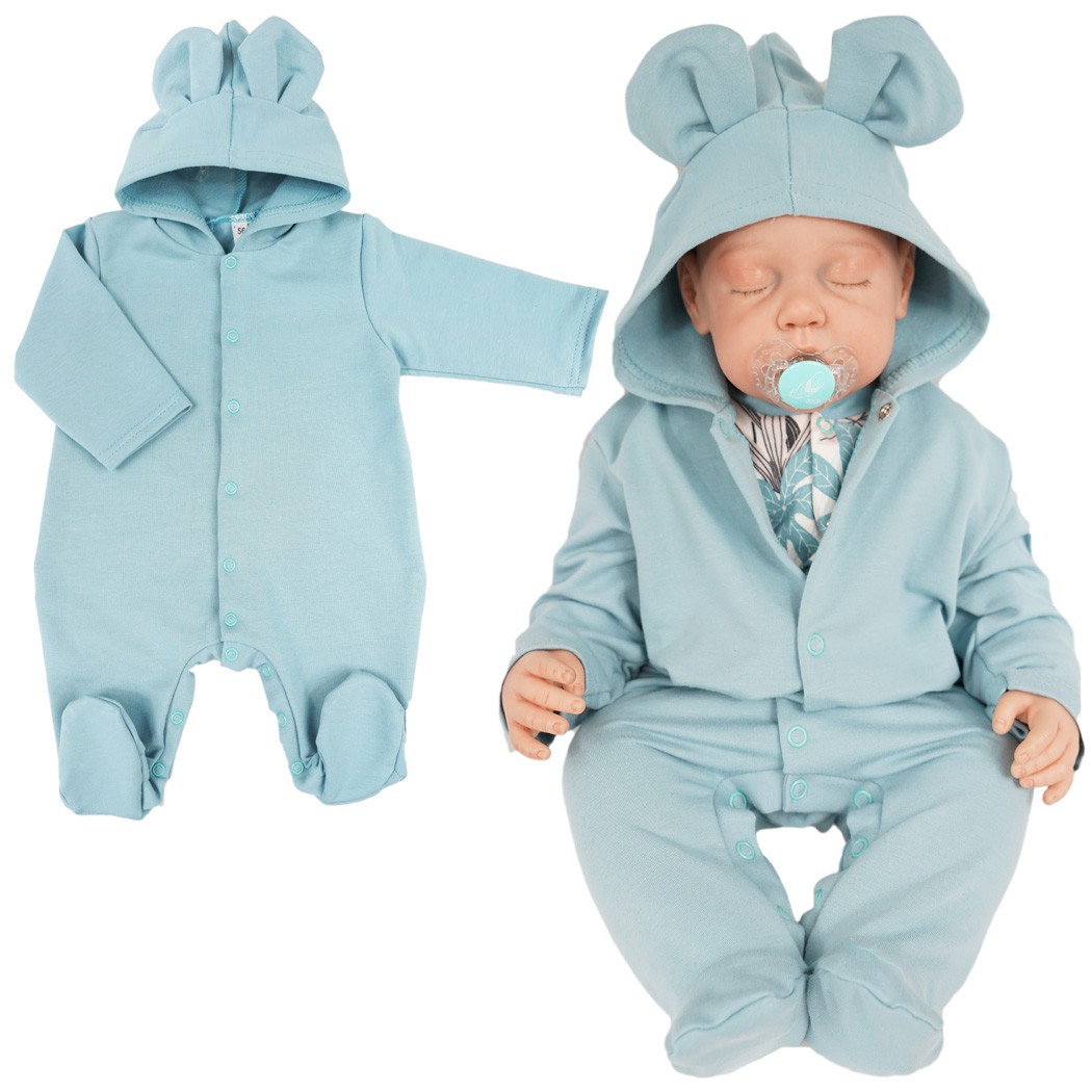 Bawełniany pajac z kapturkiem. Zapinany przez całą długość na bezniklowe napki. Możliwość całkowitego rozpięcia umożliwia łatwe i szybkie ubieranie dziecka. Kaptur z zabawnymi uszkami osłoni głowę dziecka przed zimnymi podmuchami wiatru. Kombinezon uszyty z 1 warstwy bawełny dzięki czemu sprawdzi się idealnie w ciepłe dni na wyjście ze szpitala, pierwsze spacery i wizyty lekarskie. Pajac niemowlęcy w 95% procentach bawełniany, dzięki dodatkowi 5% elastanu jest rozciągliwy i bez problemu zmieści pod spodem pajac lub body i półśpiochy.