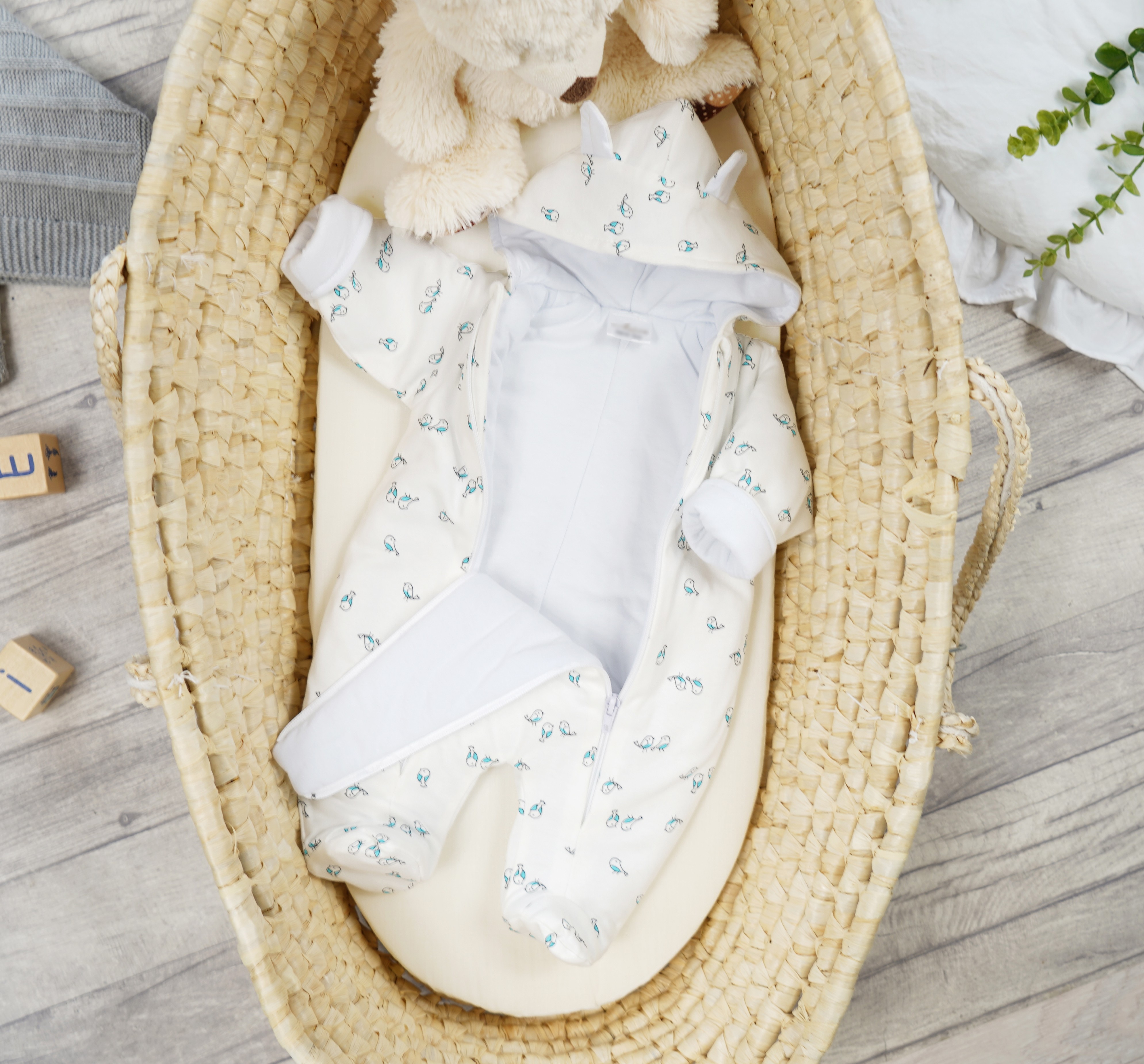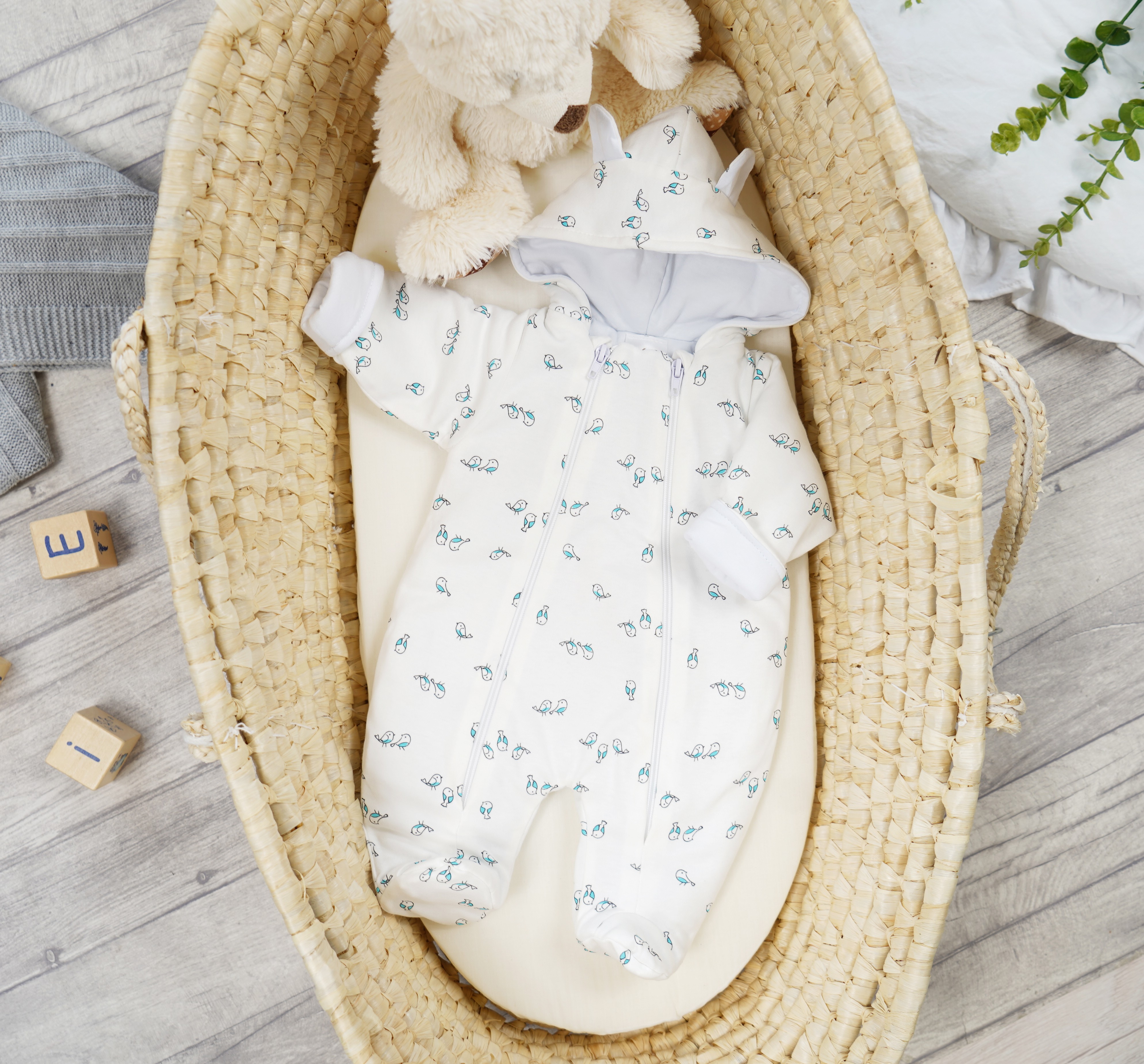 Kombinezon niemowlęcy idealne sprawdza się w zimne dni. Kombinezon zapinany jest na dwa suwaki, dzięki temu spokojnie i bez niepotrzebnego przeciskania ubierzesz swojego malucha. Kombinezon dla niemowlaka w kolorze ecru to odpowiedni kombinezon dla dziewczynki oraz chłopca, posiada wygodny kaptur ozdobiony uroczymi uszkami.