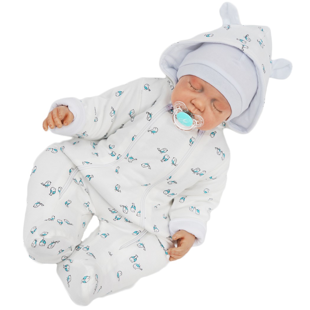 Śliczny, ocieplany kombinezon dziecięcy w kolorze ecru w niebieskie ptaszki.