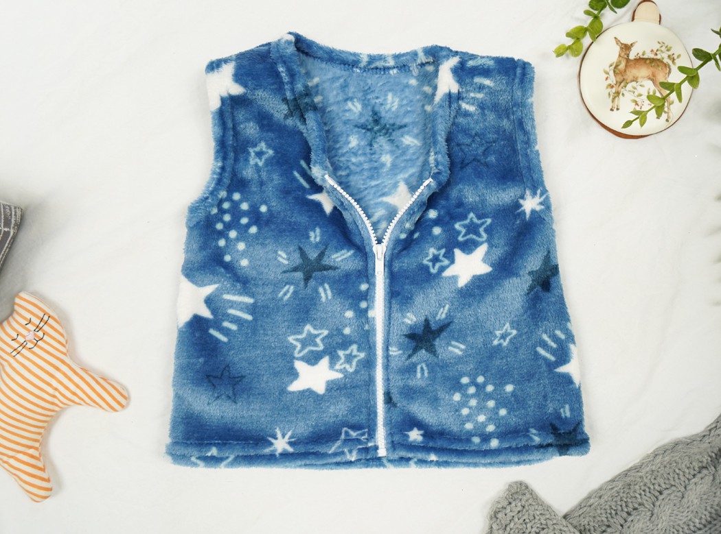 Pluszowy bezrękawnik dziecięcy zapinany przez całą długość na suwak. Kamizelka została uszyta z miękkiej, ciepłej tkaniny w kolorze niebieskim w jasne gwiazdkii.
