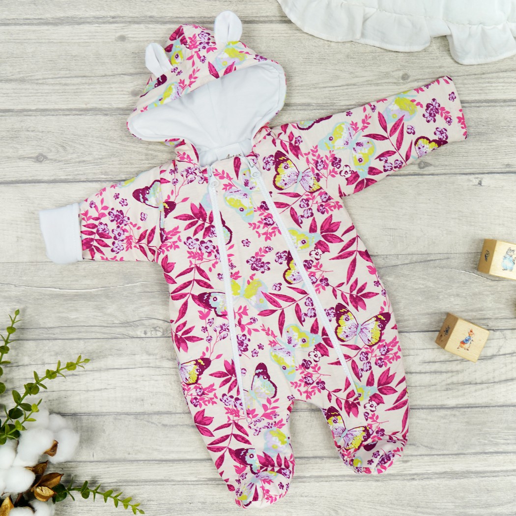 Wiosenno-jesienny pajacyk z kapturkiem i wesołymi uszkami. Zasuwany od kroku pod samą szyję na 2 suwaki. Kombinezon uszyty z 2 warstw bawełny, z zewnątrz różowa bawełna drukowana w kolorowe motyle i kwiaty, od wewnątrz bawełna w kolorze białym. Kaptur z zabawnymi uszkami obszyty od wewnątrz bawełnianą podszewką osłoni głowę dziecka przed zimnymi podmuchami wiatru.