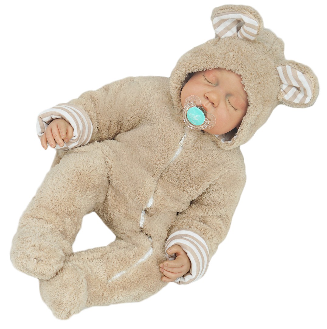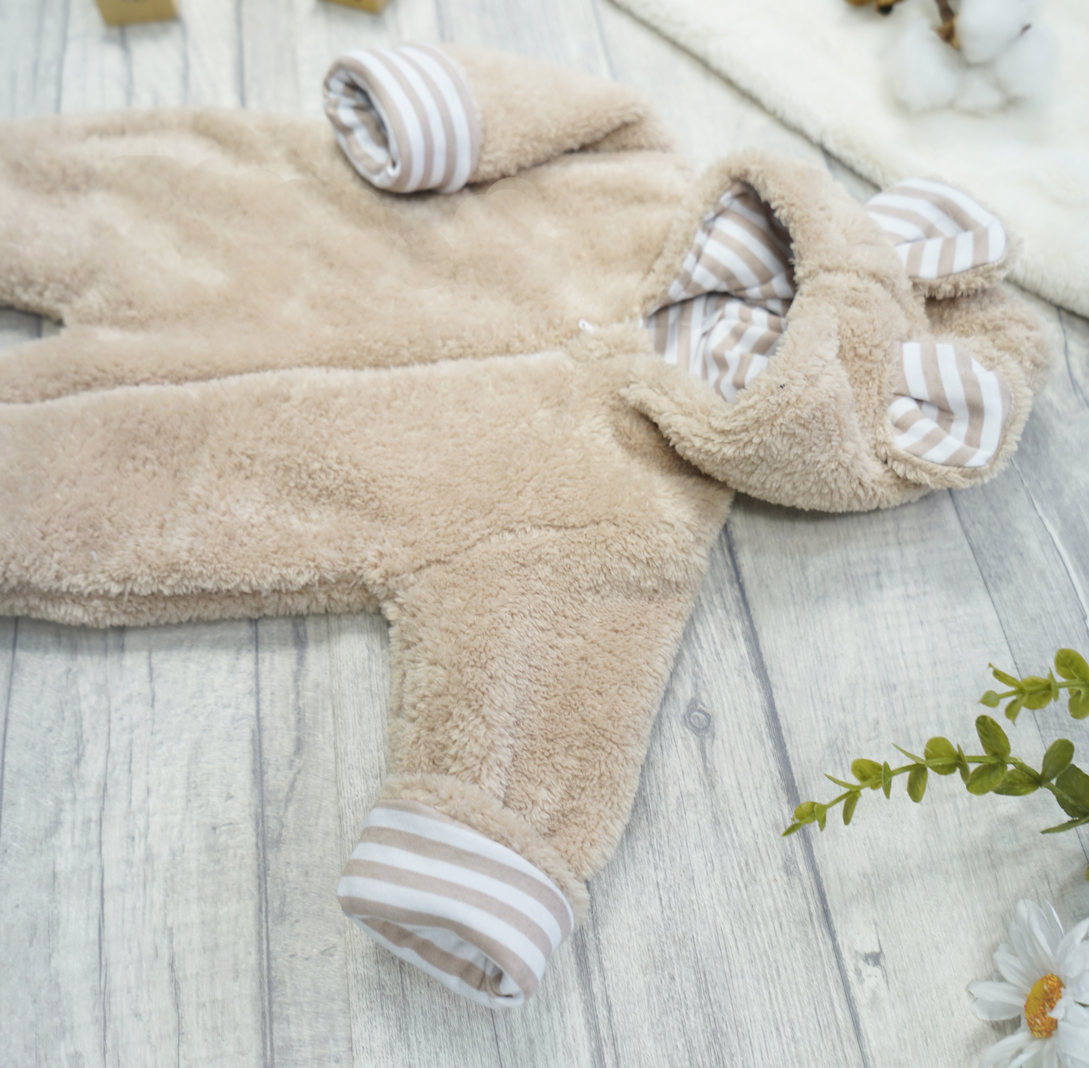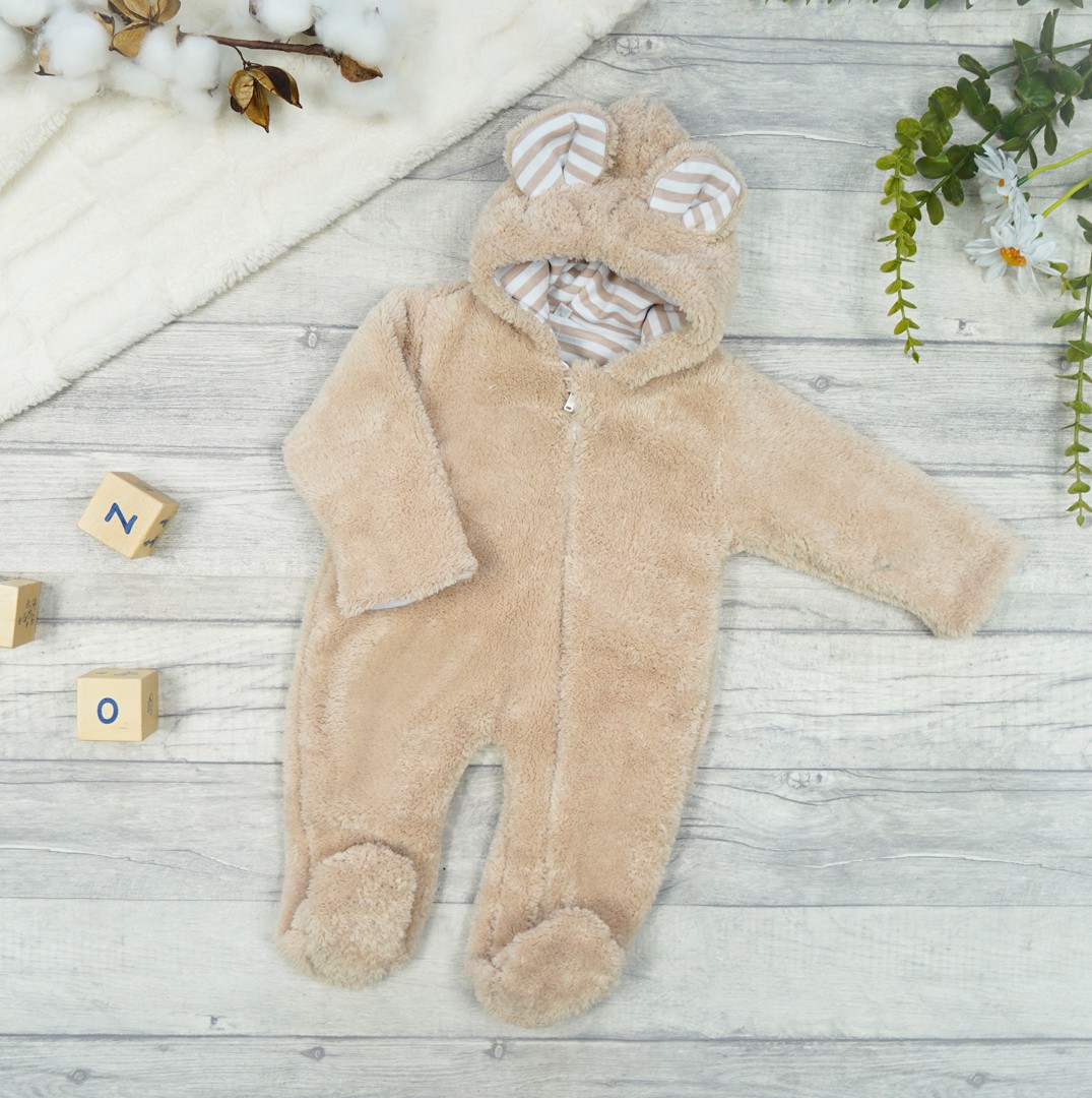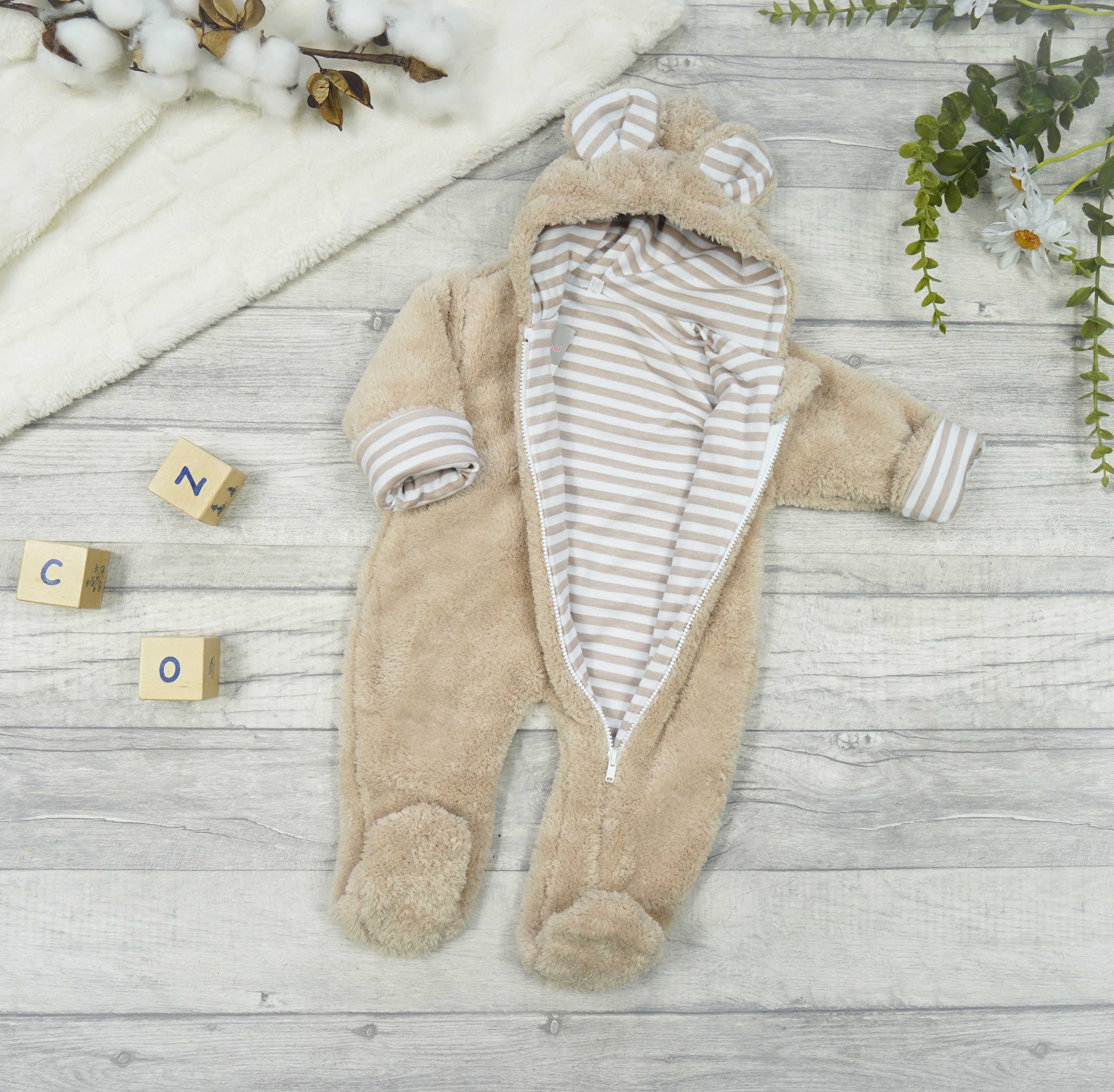 Pajac niemowlęcy z kapturem zapinany po boku przez całą długość na suwak wykonany z dzianiny typu miś. Biała bawełniana podszewka w beżowe paski oraz odstające uszka zamocowane na kapturze dodają kombinezonowi wyjątkowego uroku.