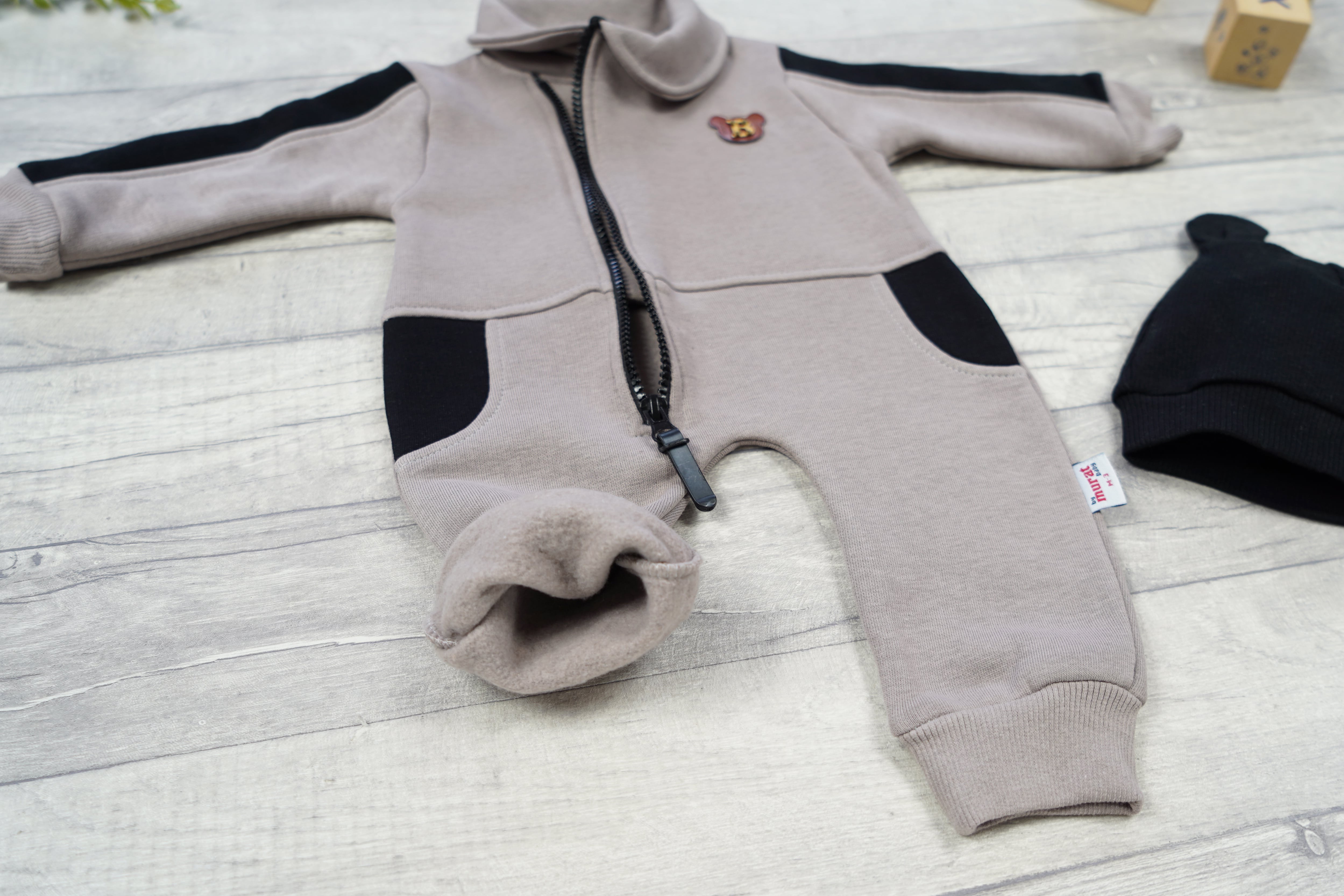 Śliczny, beżowy kombinezon dresowy dla noworodka + czarna smerfetka