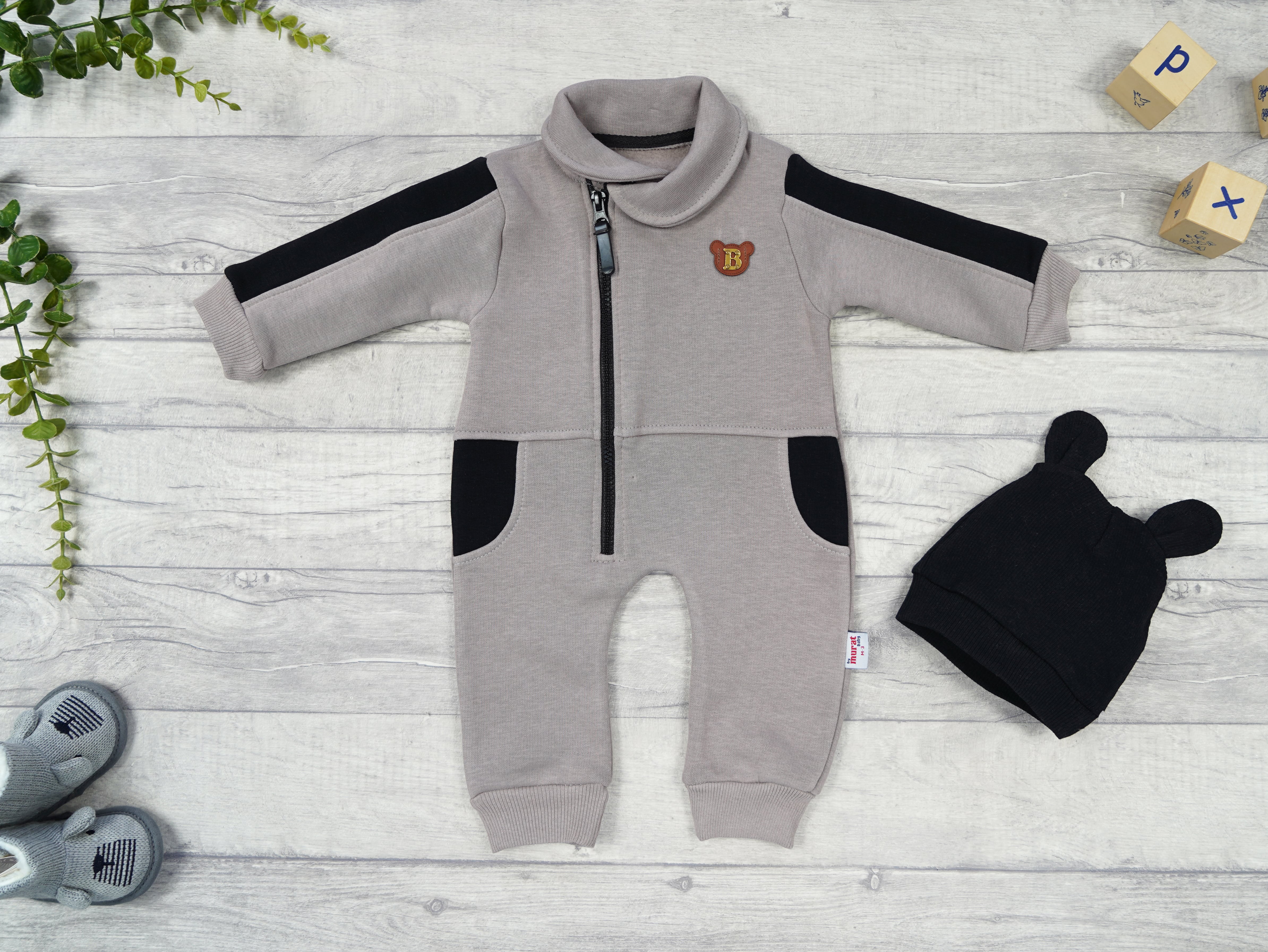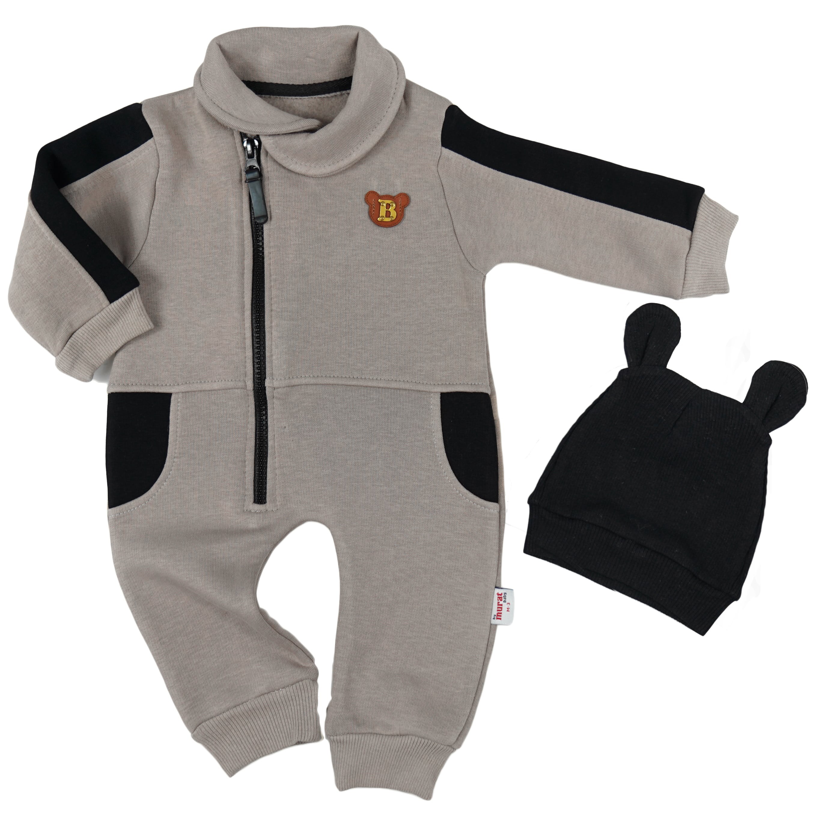 Beżowy kompbinezon dresowy niemowlęcy z bawełny dresowej, docieplonej wewnętrznym meszkiem. Ściągacze na rękawach i nogawkach chronią dziecko przed zimnem i ograniczają dostęp chłodnego powietrza. Ten miękki kombinezon ozdobiony jest na piersi brązowo- złotą aplikacją misia z literką 'B", posiada też ozdobne, czarne wstawki przy kieszeniach i rękawach. Kombinezon zapinany jest na suwak, dzięki temu spokojnie i bez niepotrzebnego przeciskania ubierzesz swojego malucha. Kombinezon na meszku posiada bezpiecznie otulający szyję kołnierzyk, który można odwijać tworząc bezpieczną warstwę chroniącą przed zimnym powietrzem.