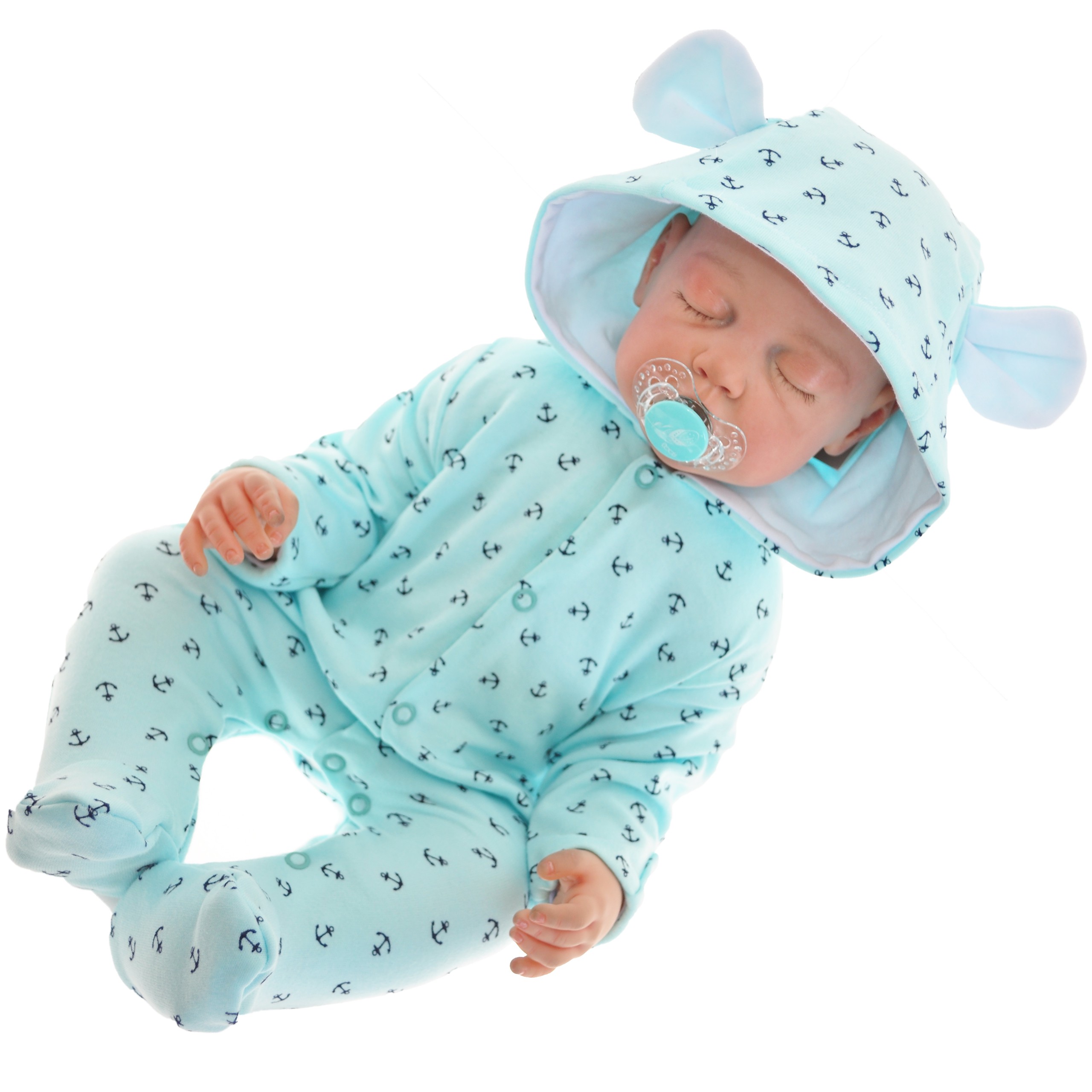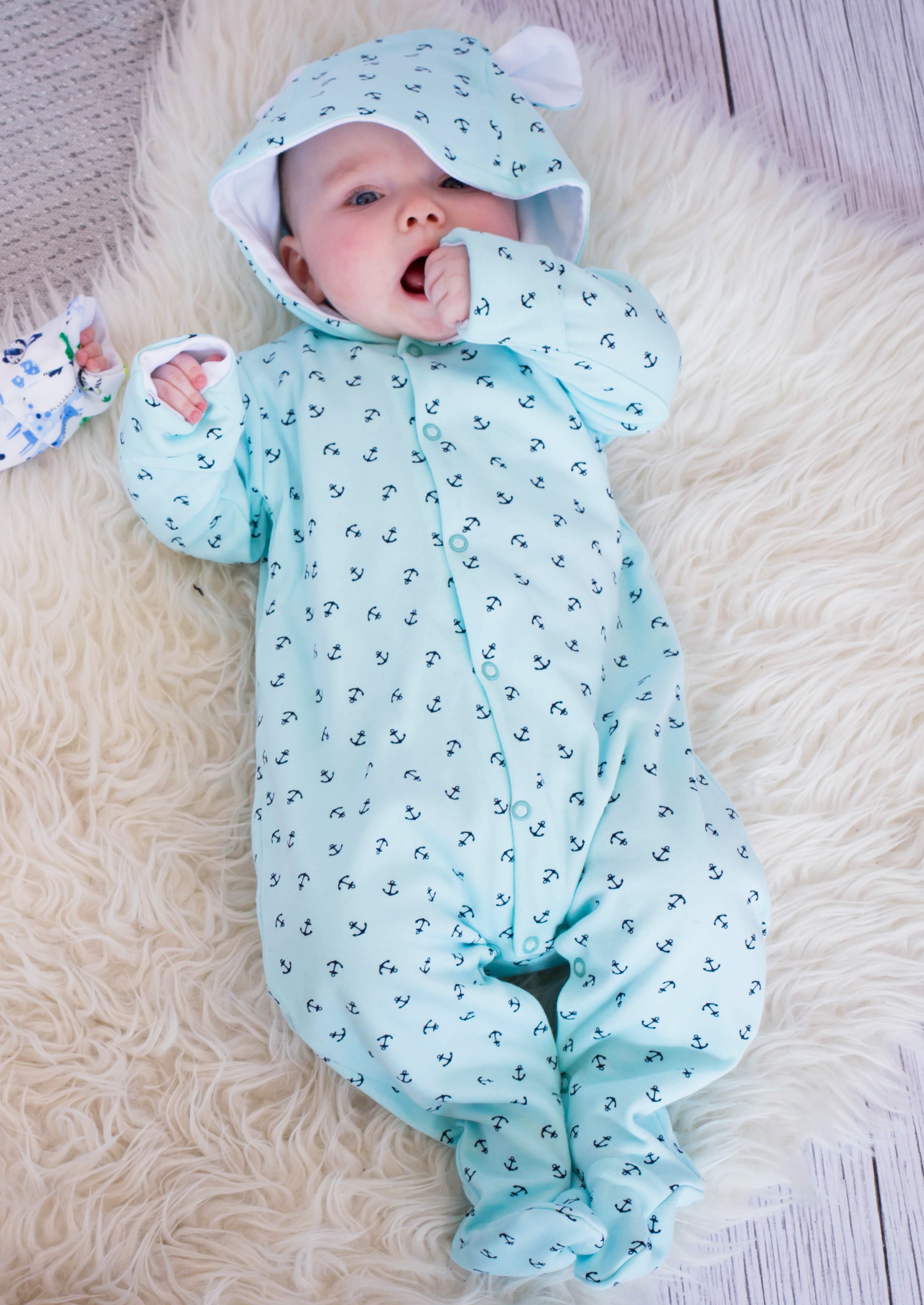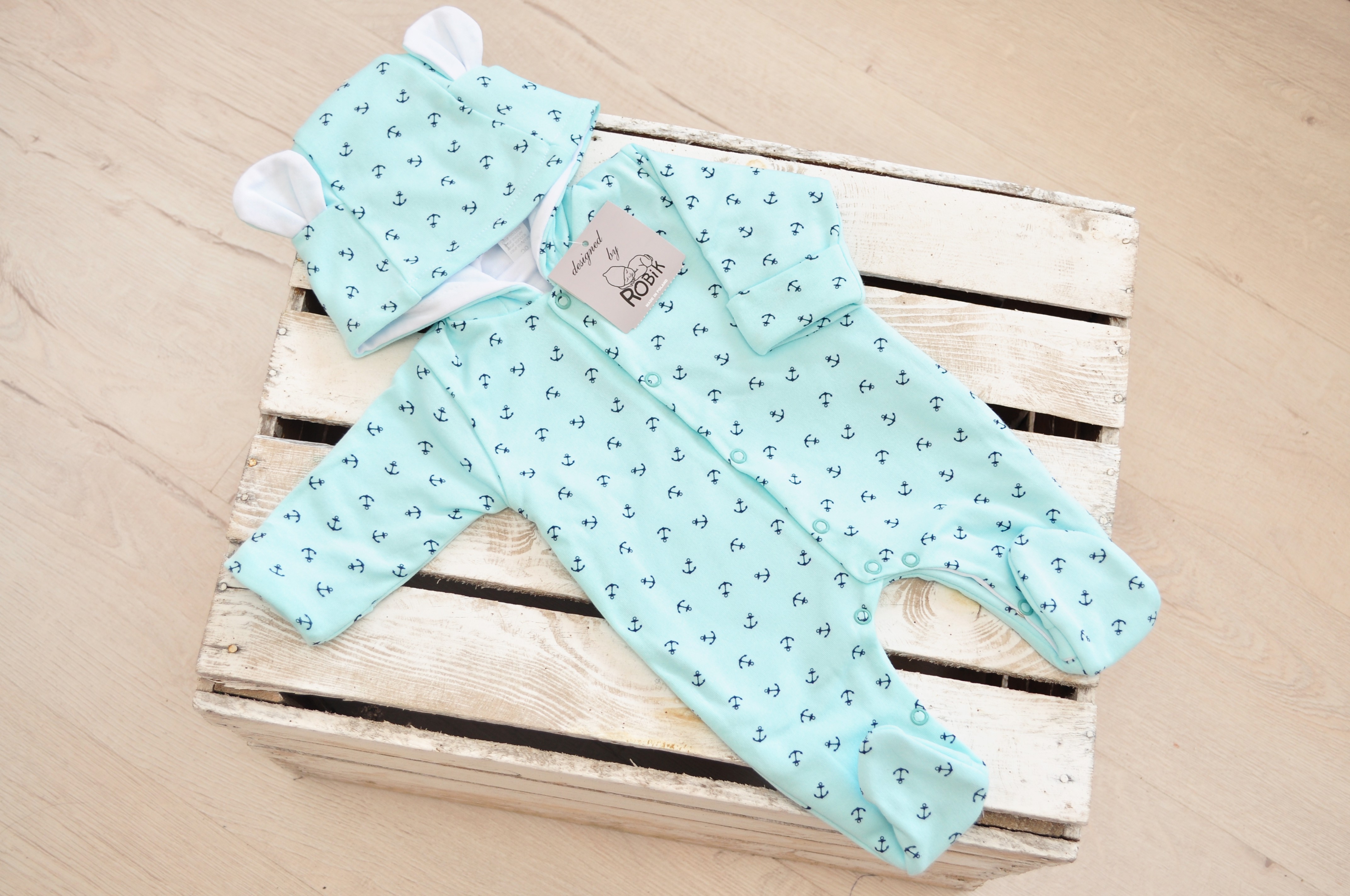 Bawełniany pajac z kapturkiem wykonany z 100% bawełny. Zapinany przez całą długość na bezniklowe napki. Możliwość całkowitego rozpięcia umożliwia łatwe i szybkie ubieranie dziecka. Kaptur z zabawnymi uszkami obszyty od wewnątrz bawełnianą podszewką osłoni głowę dziecka przed zimnymi podmuchami wiatru. Kombinezon uszyty z 2 warstw bawełny, z zewnątrz miętowa bawełna drukowana w niebieskie kotwice, od wewnątrz bawełna w kolorze białym.