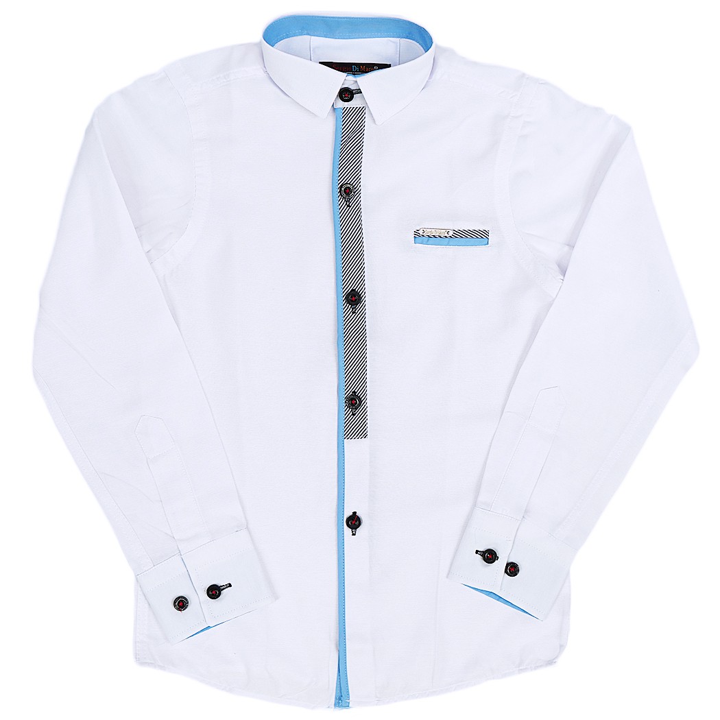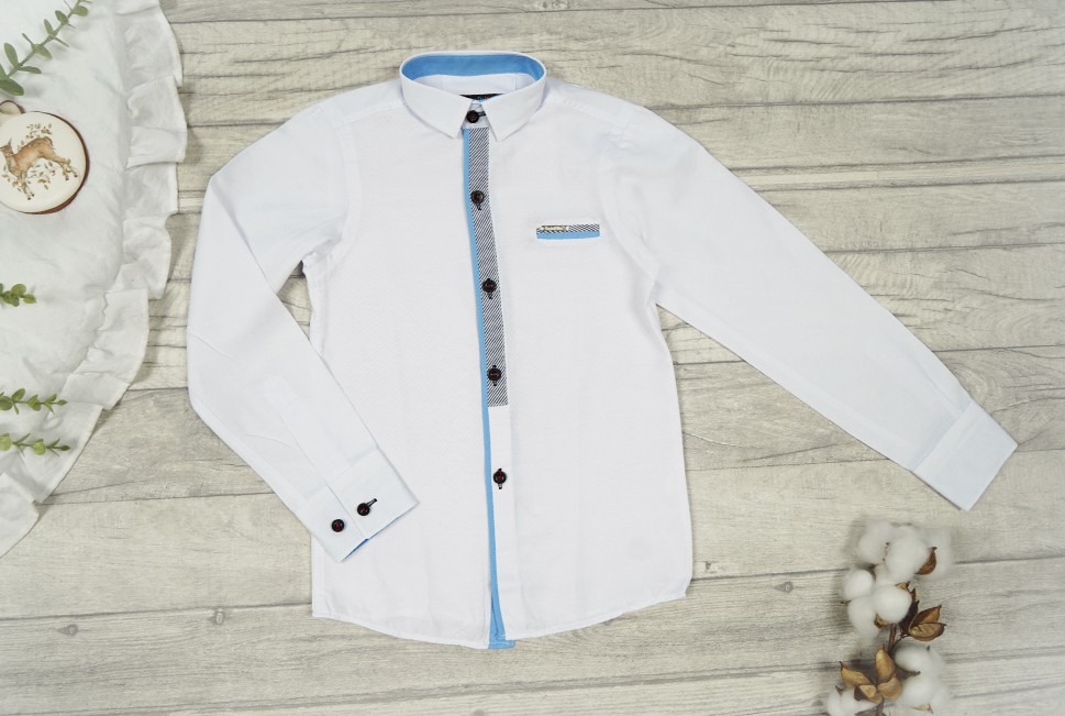 Koszula zapinana na czarne guziki. Posiada usztywniany, prosty kołnierzyk. Dodatkową ozdobą tej koszuli dla chłopca stanowi wzór w granatowe linie z niebieskim akcentem z przodu oraz imitacja wpuszczanej kieszonki na piersi. Rękawy koszuli zostały wykończone mankietami obszytymi od spodu niebieskim materiałem. Mankiety zapinane na czarne guziki, możliwość regulacji obwodu. Półkolisty dół.