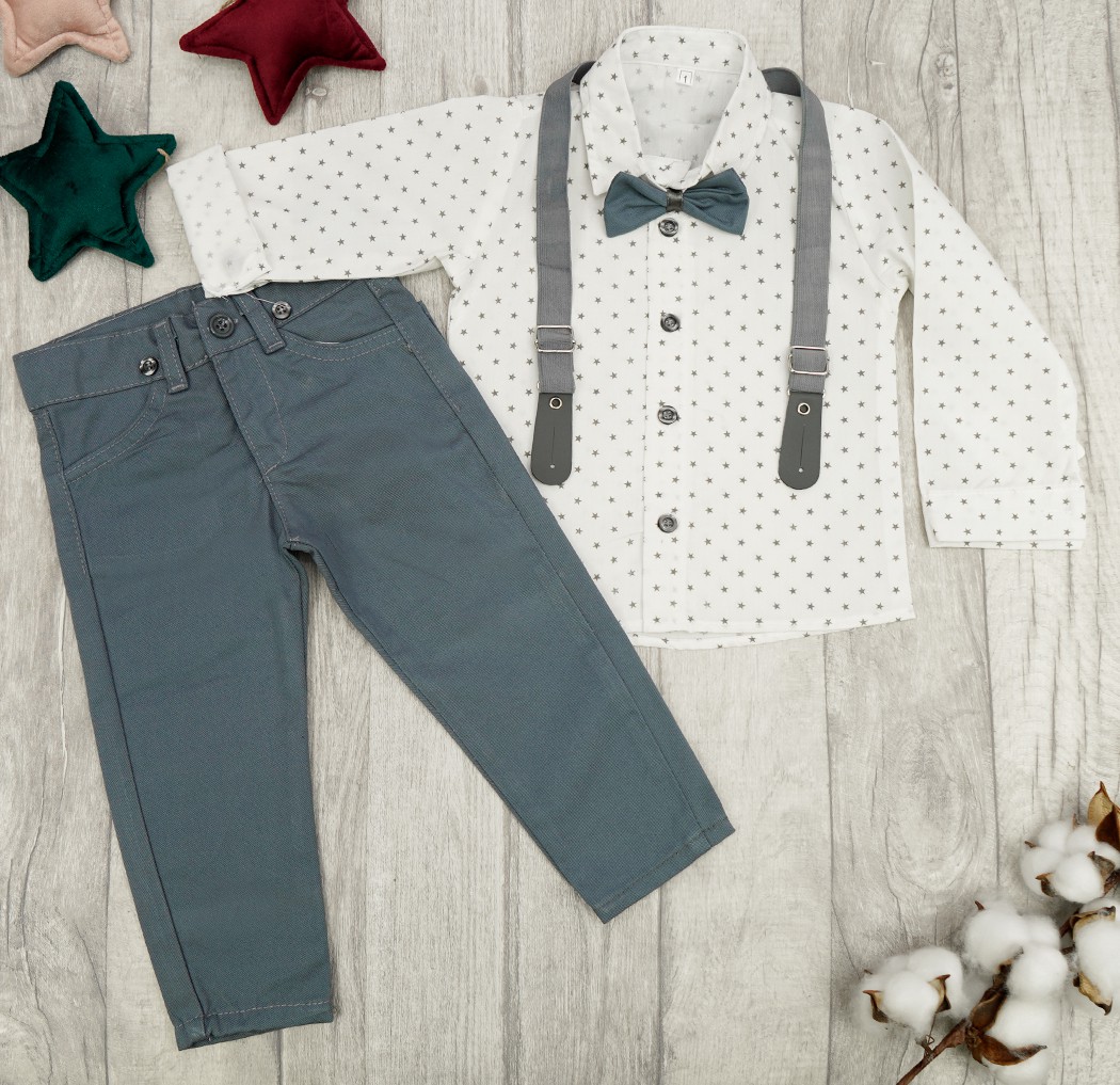 KOMPLET DLA CHŁOPCA koszula szare gwiazdki, spodnie, muszka, szelki święta