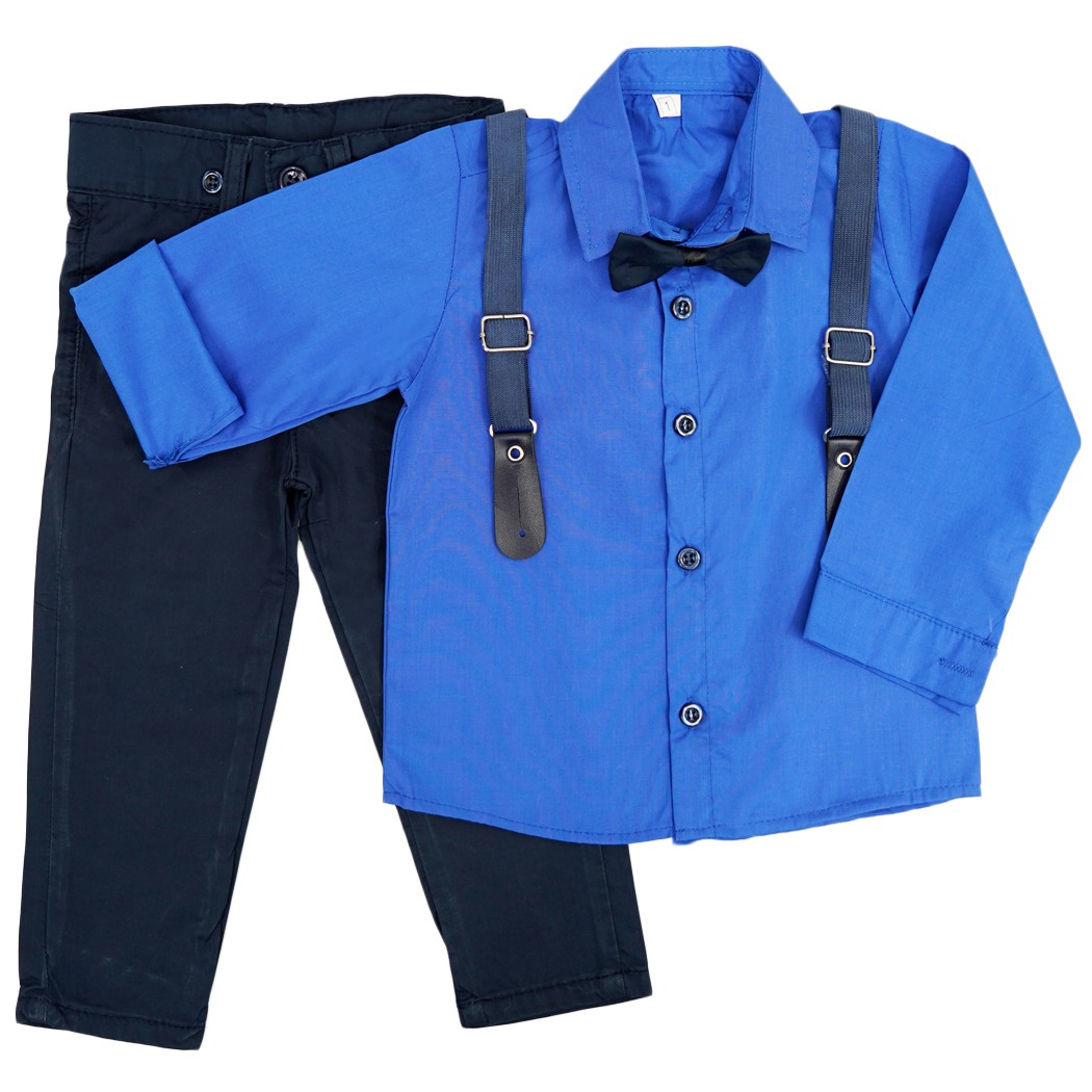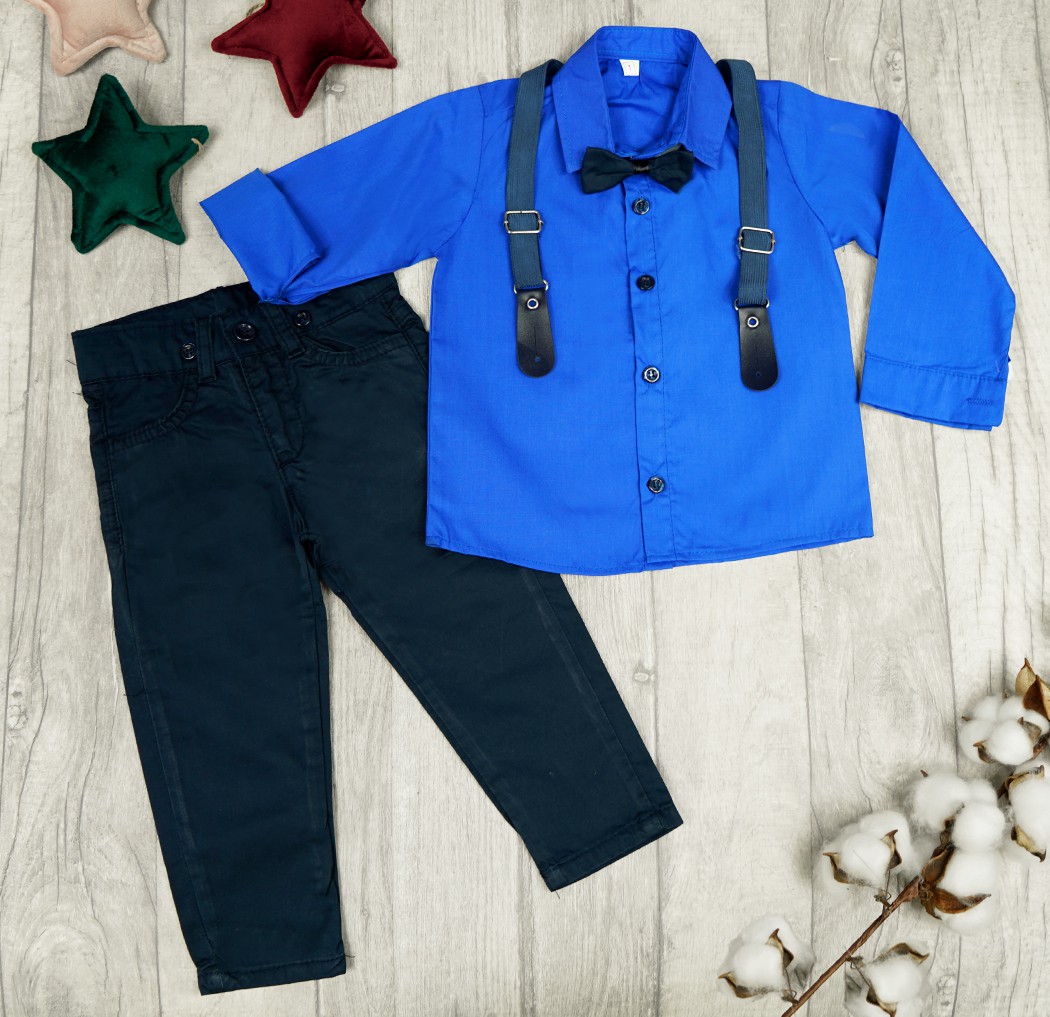 Komplet chłopięcy w skład którego wchodzą: elegancka koszula, granatowe spodnie oraz mucha i szelki.