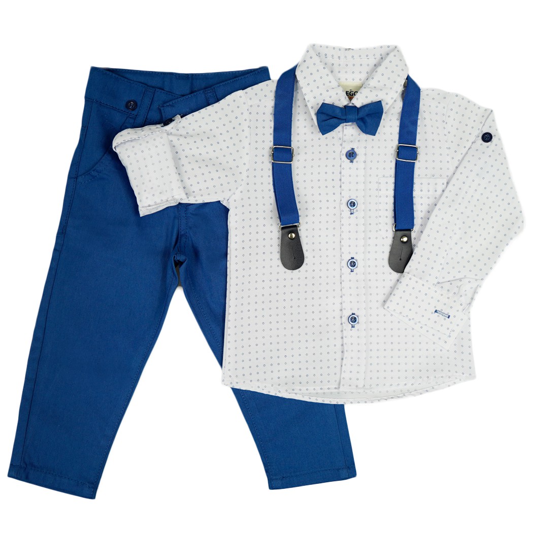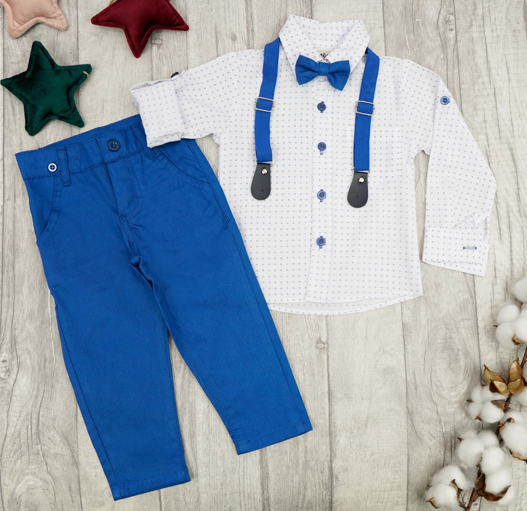 Komplet chłopięcy w skład którego wchodzą: elegancka koszula, niebieskie spodnie oraz mucha i szelki.
