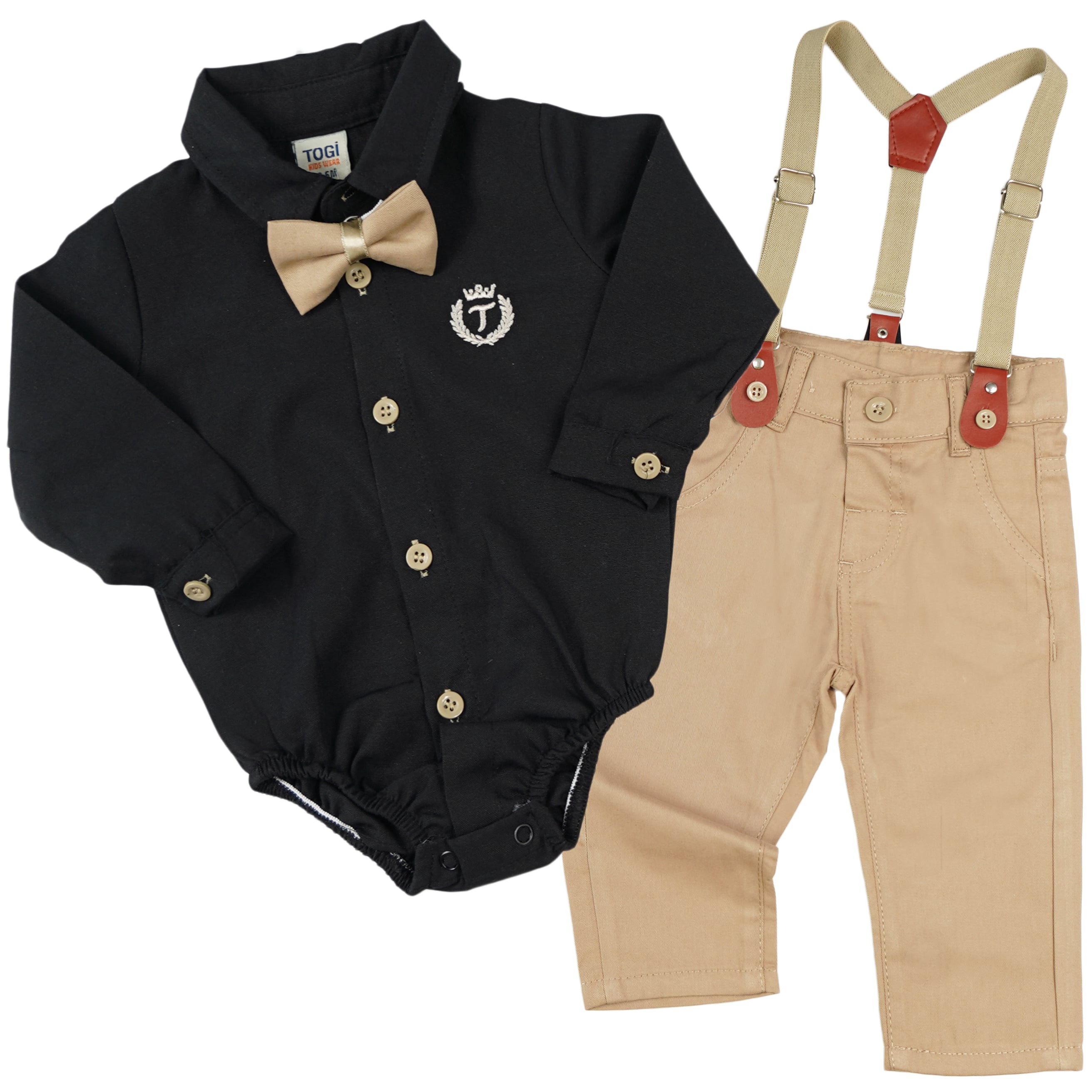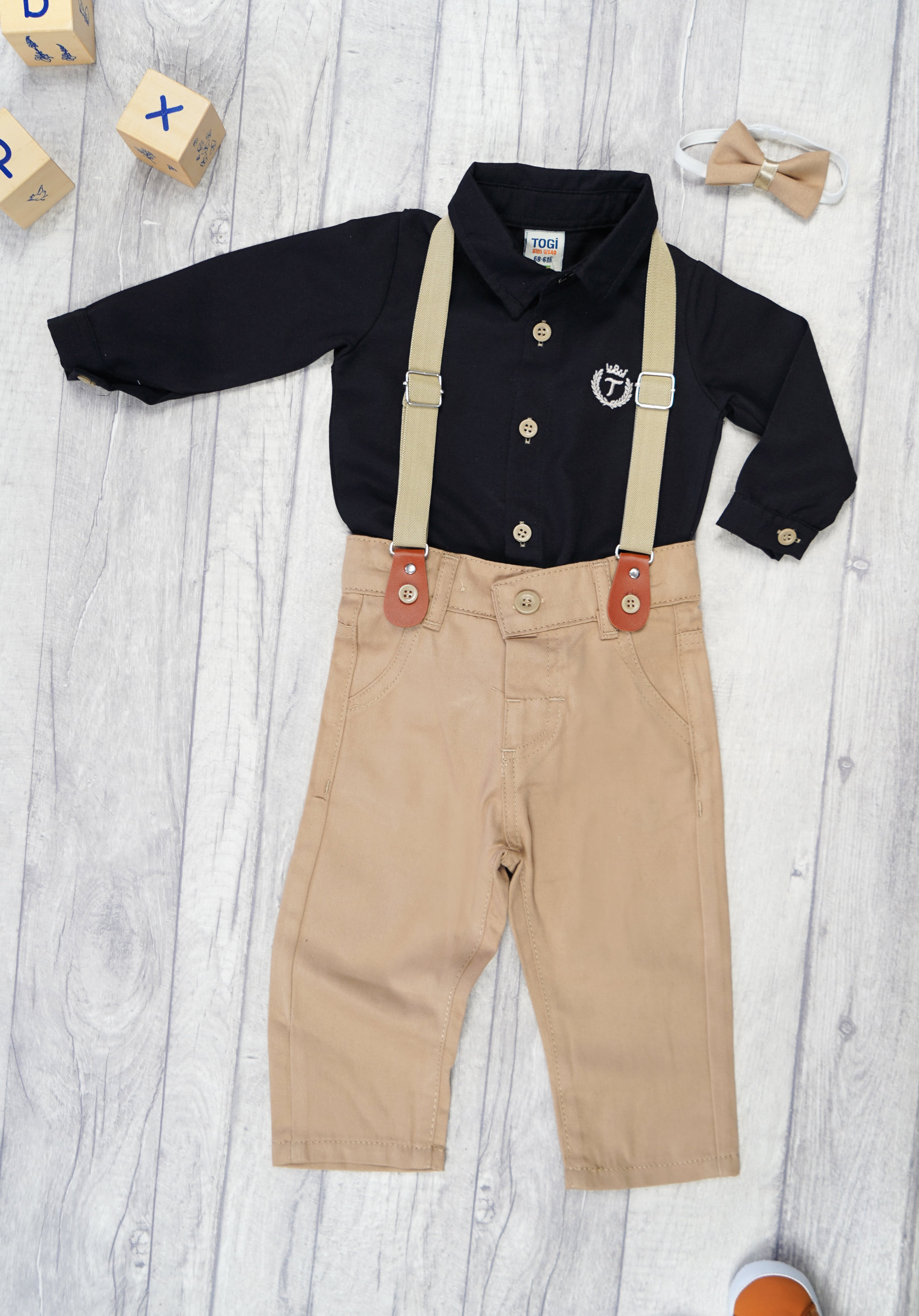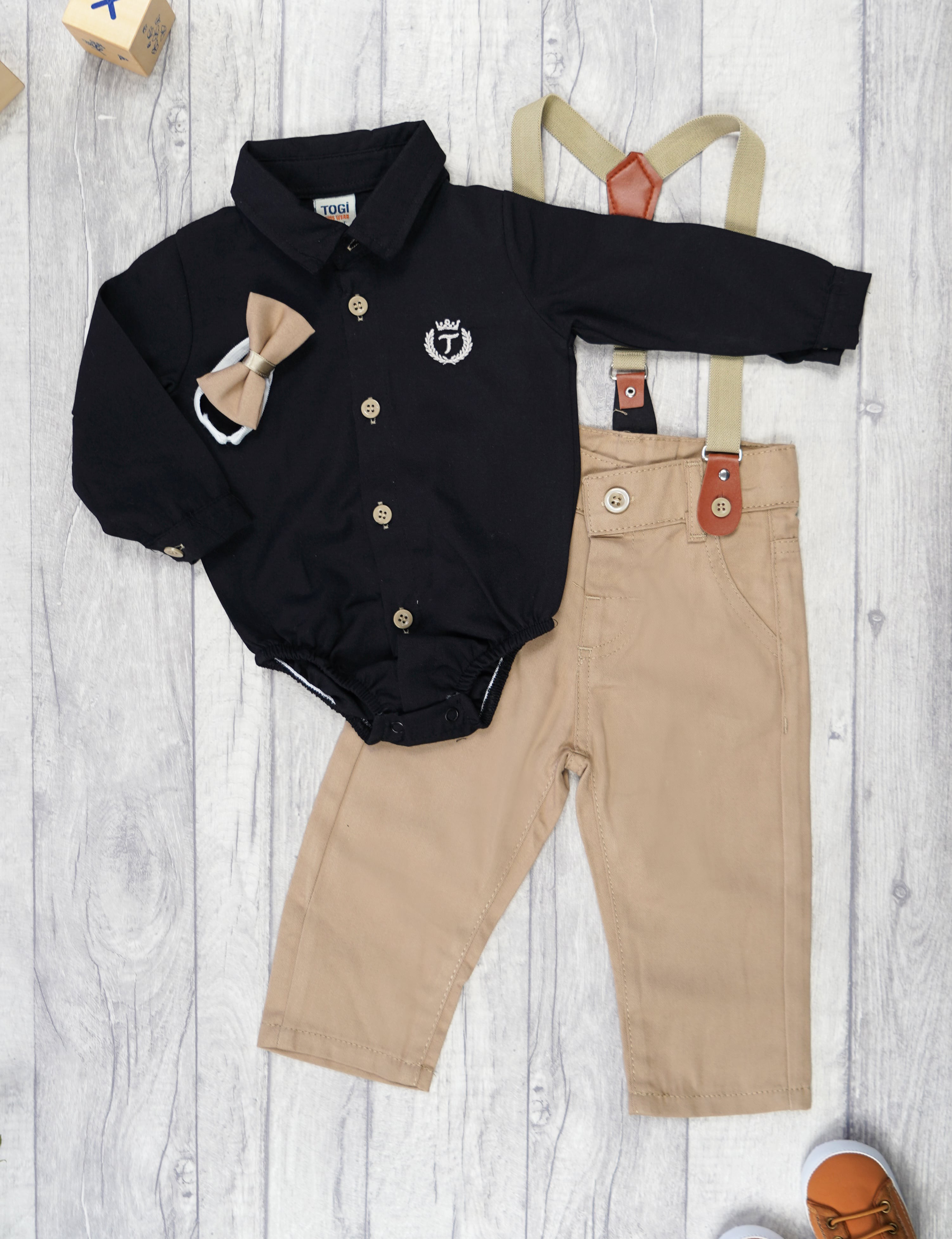KOMPLET DLA CHŁOPCA body- koszula czarna z haftem, beżowe spodnie, muszka, szelki święta