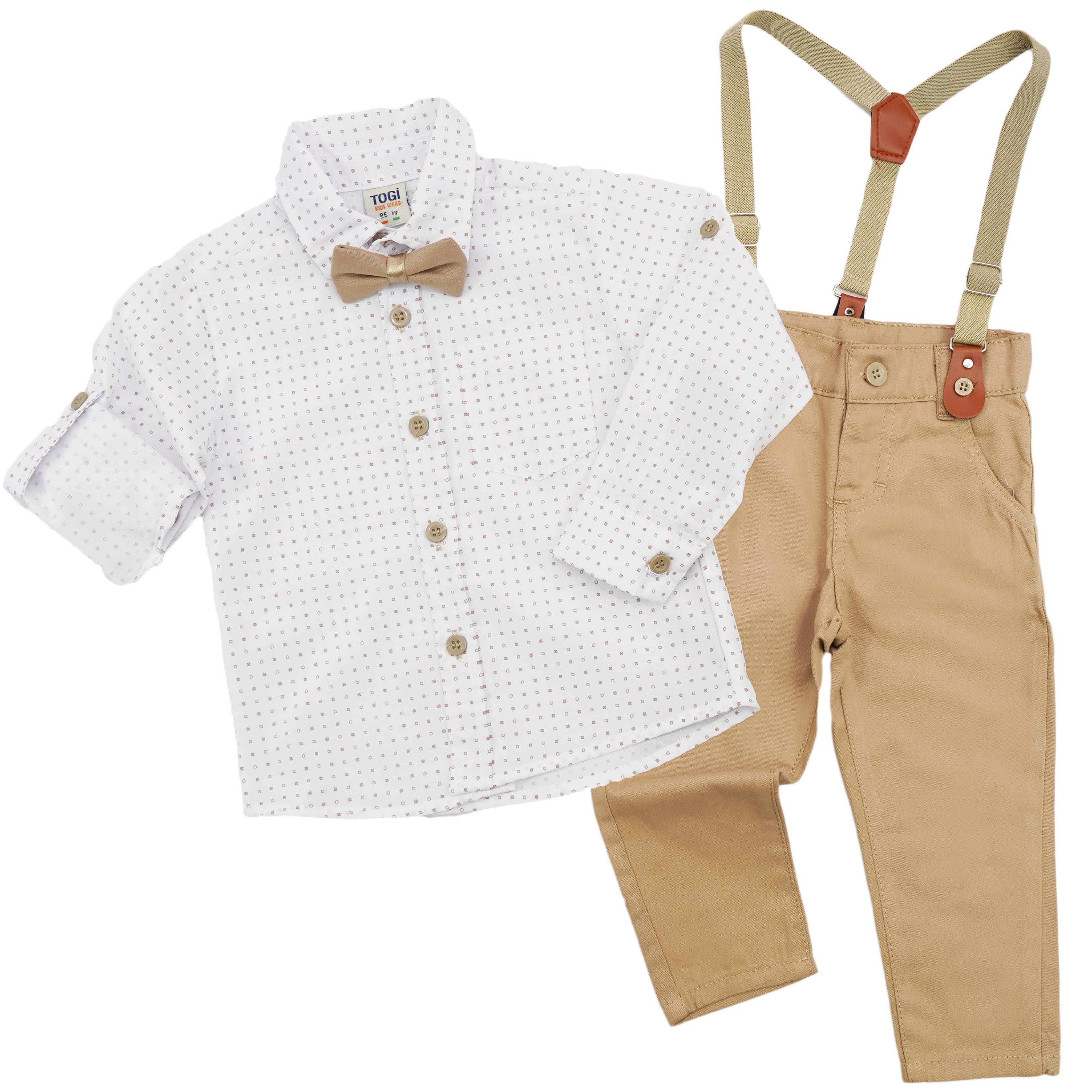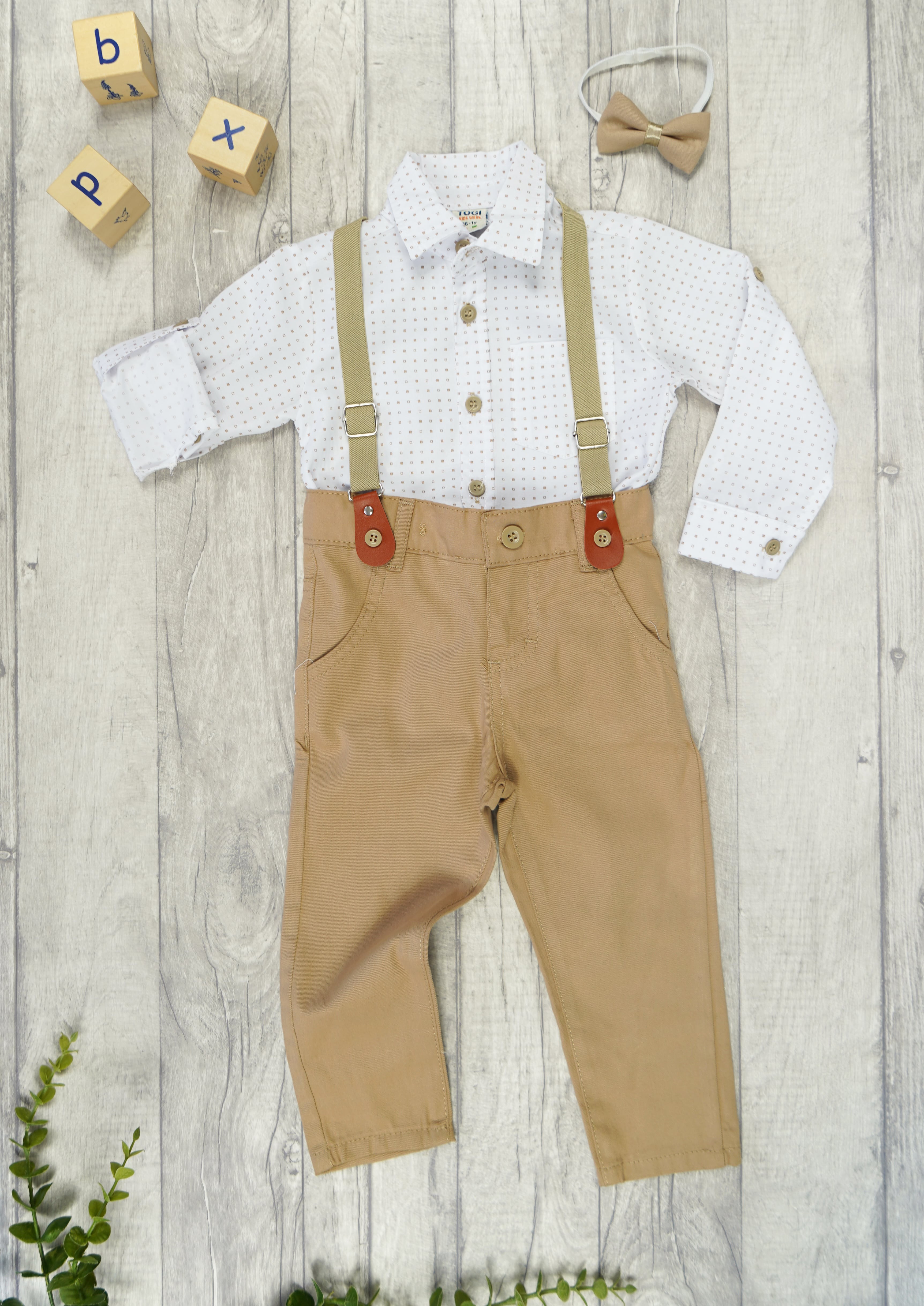 Komplet chłopięcy w skład którego wchodzą: elegancka koszula, beżowe spodnie oraz mucha i szelki.
