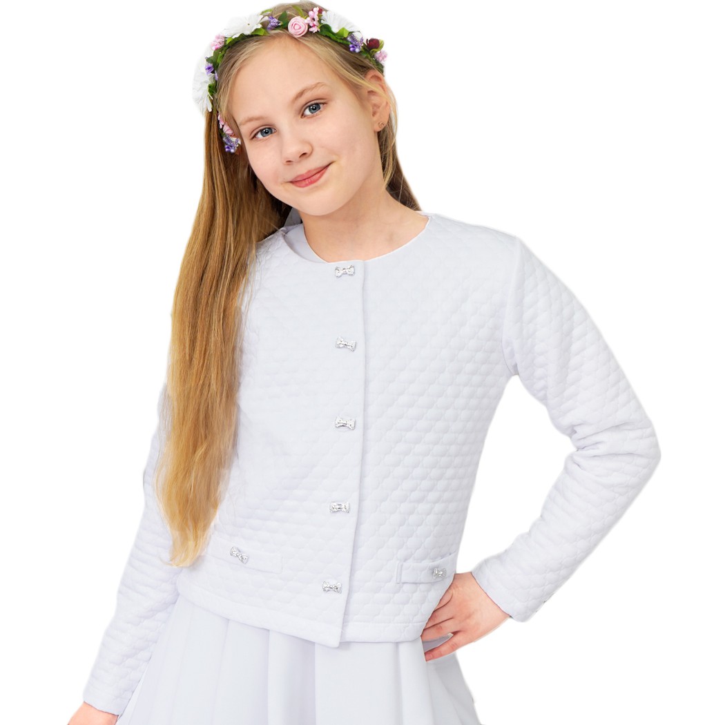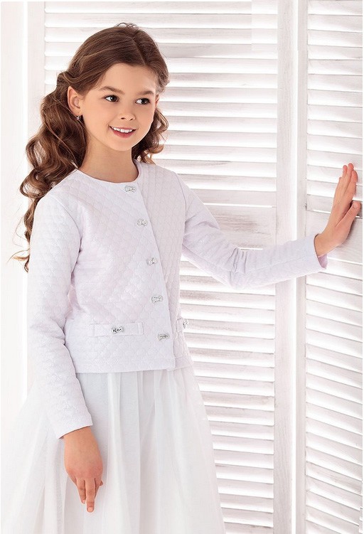Eleganckie i klasyczne bolerko dziewczęce z długim rękawem w kolorze białym. Żakiecik zapinany na urocze srebrne guziczki w kształcie kokardek. Bolerko wykonane z miękkiego i przyjemnego w dotyku materiału, który po wielokrotnym praniu pozostaje w niezmienionym stanie.