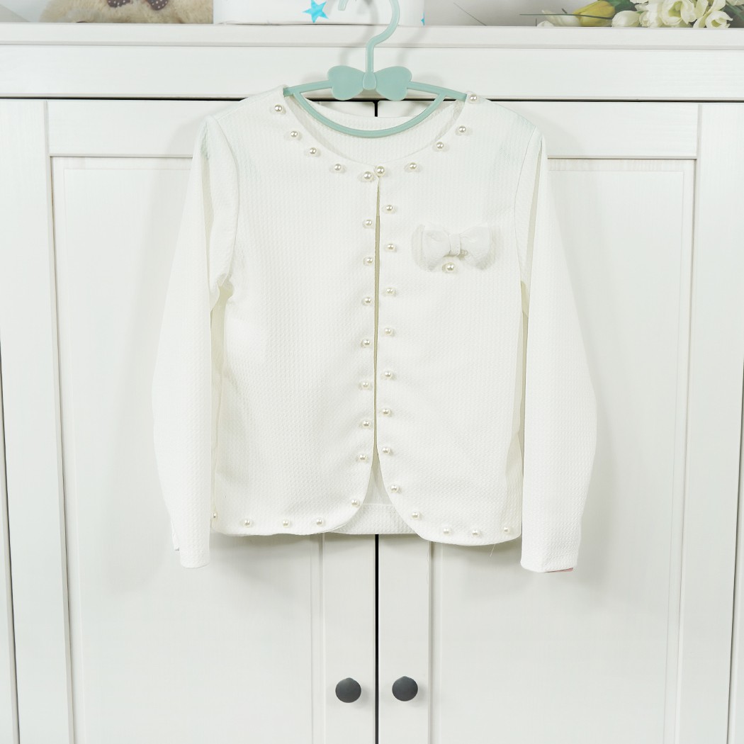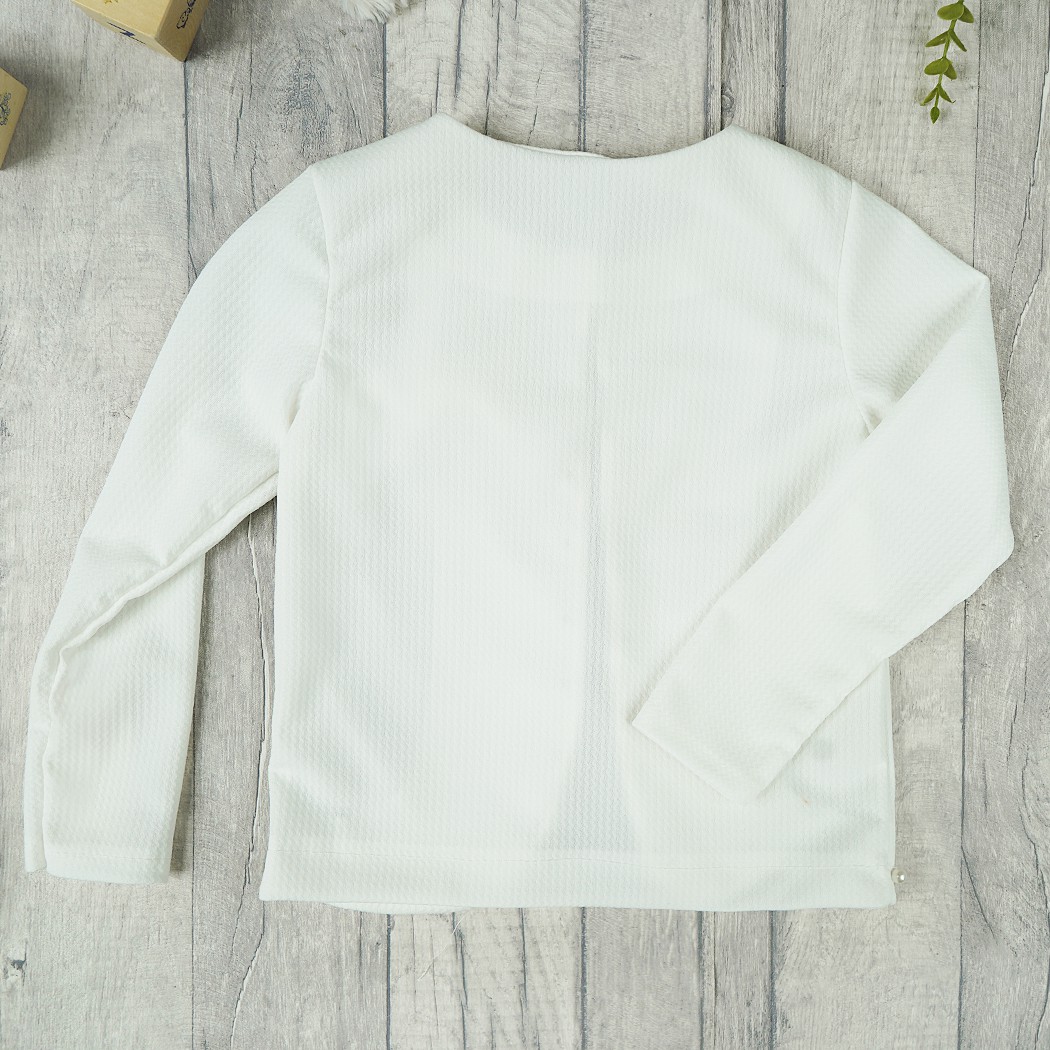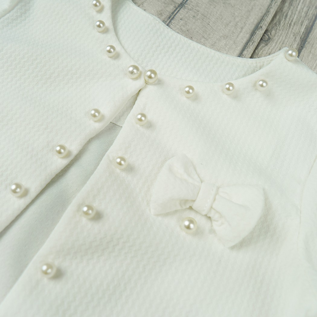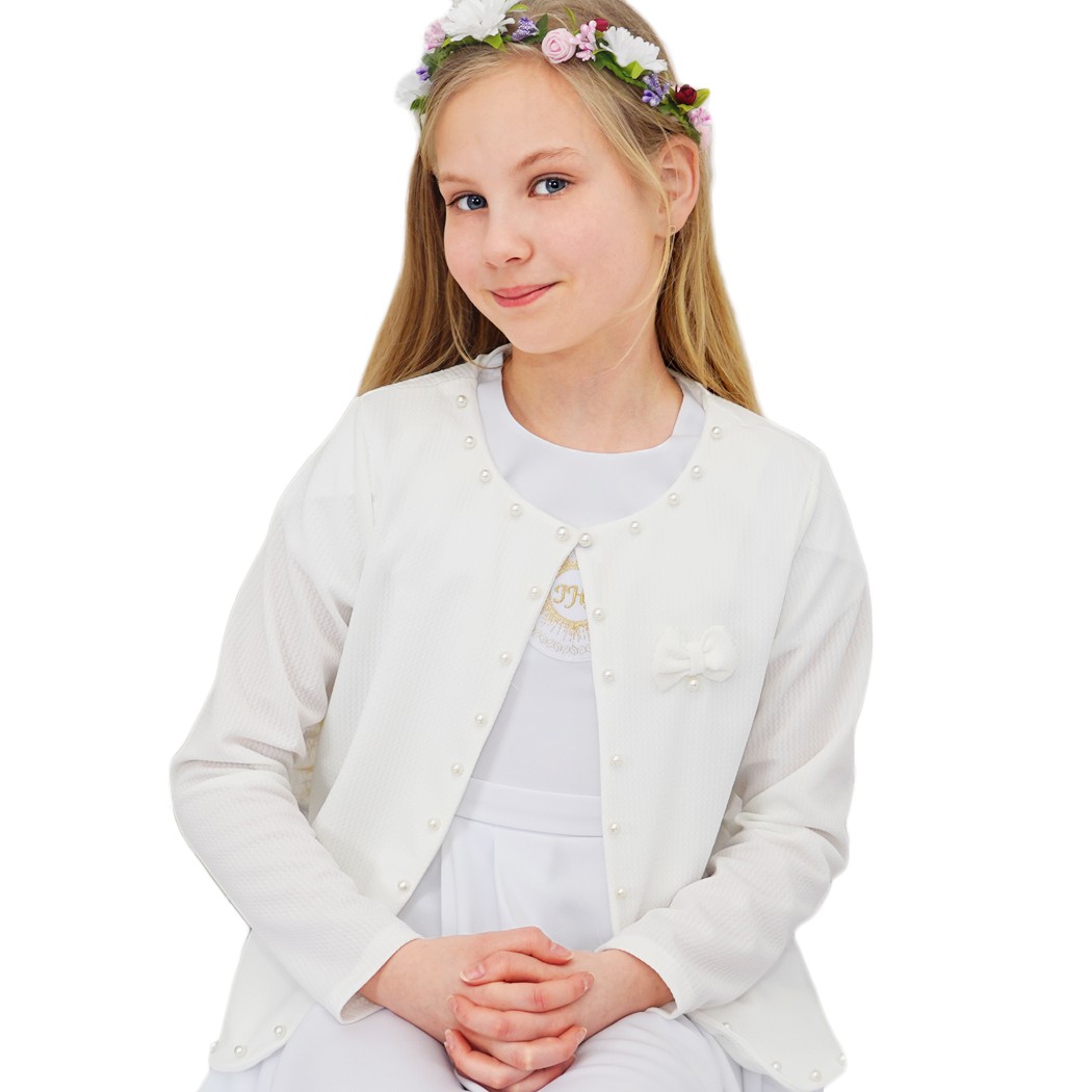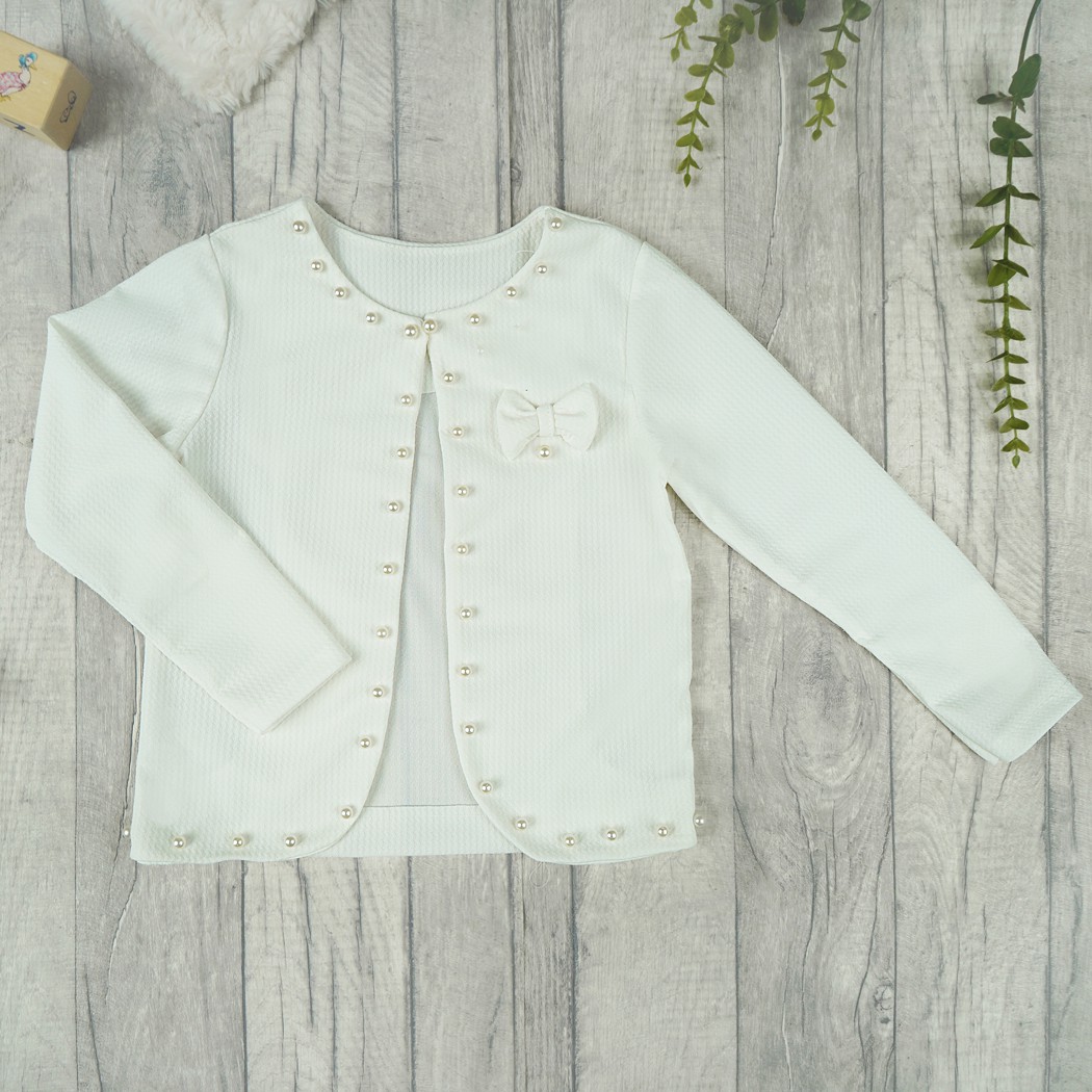 Eleganckie i klasyczne bolerko dziewczęce z długim rękawem w kolorze ecru z ozdobnymi perełkami i kokardką. Żakiecik zapinany na jeden guziczek w kształcie perełki tuż przy szyi. Bolerko wykonane z miękkiego i przyjemnego w dotyku materiału, który po wielokrotnym praniu pozostaje w niezmienionym stanie.