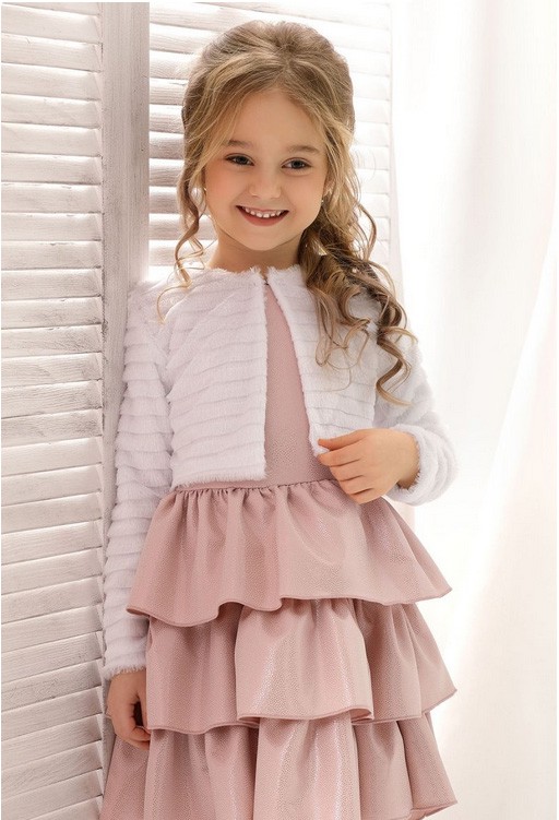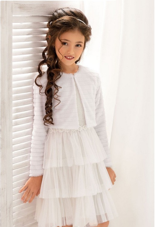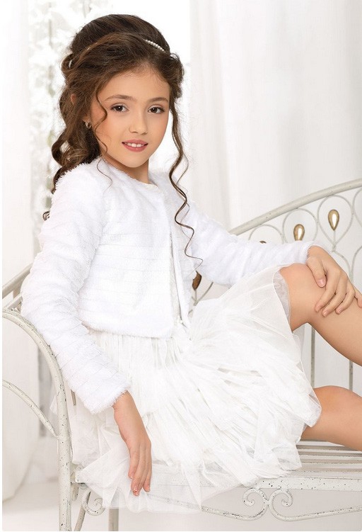 Eleganckie i klasyczne białe bolderko komunijne dziewczęce z długim rękawem. Futrzany żakiecik zapinany na niewidoczną haftkę przy szyi. Bolderko komunijne białe jest wykonane z miękkiego i przyjemnego w dotyku materiału, który po wielokrotnym praniu pozostaje w niezmienionym stanie.