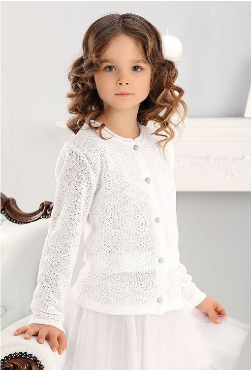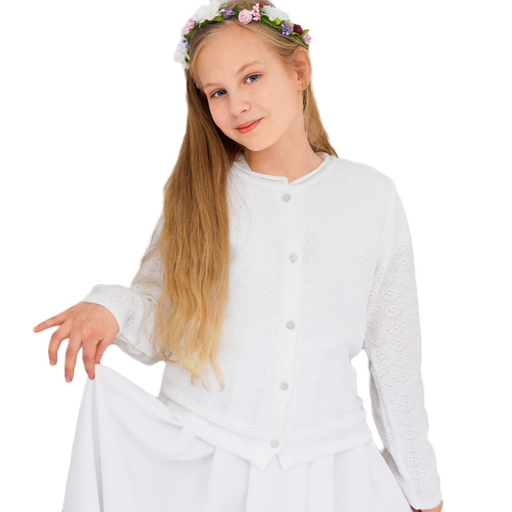 Elegancki i klasyczny sweterek dziewczęcy z długim rękawem z ozdobnymi, srebrnymi guziczkami w kolorze ecru. Sweter dziewczęcy ażurowy w całości. Sweterek dla dziewczynki wykonane z miękkiego i przyjemnego w dotyku materiału, który po wielokrotnym praniu pozostaje w niezmienionym stanie.