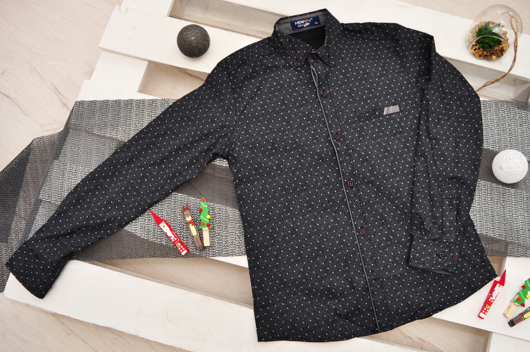 Koszula zapinana na czarne guziki. Posiada usztywniany prosty kołnierzyk. Na lewej piersi imitacja wewnętrznej kieszonki. Rękawy koszuli zostały wykończone mankietami zapinanymi na guziki z możliwością regulacji obwodu. Półkolisty dół.