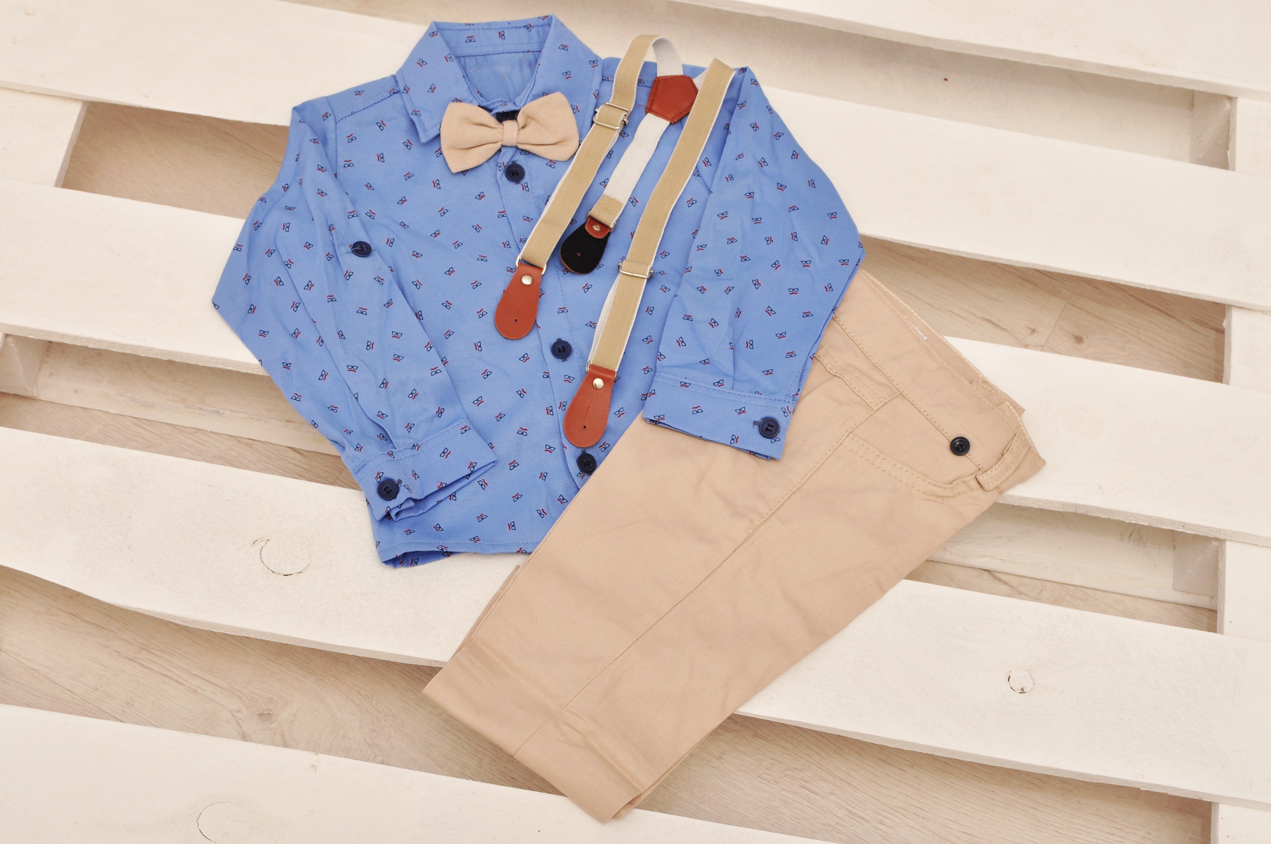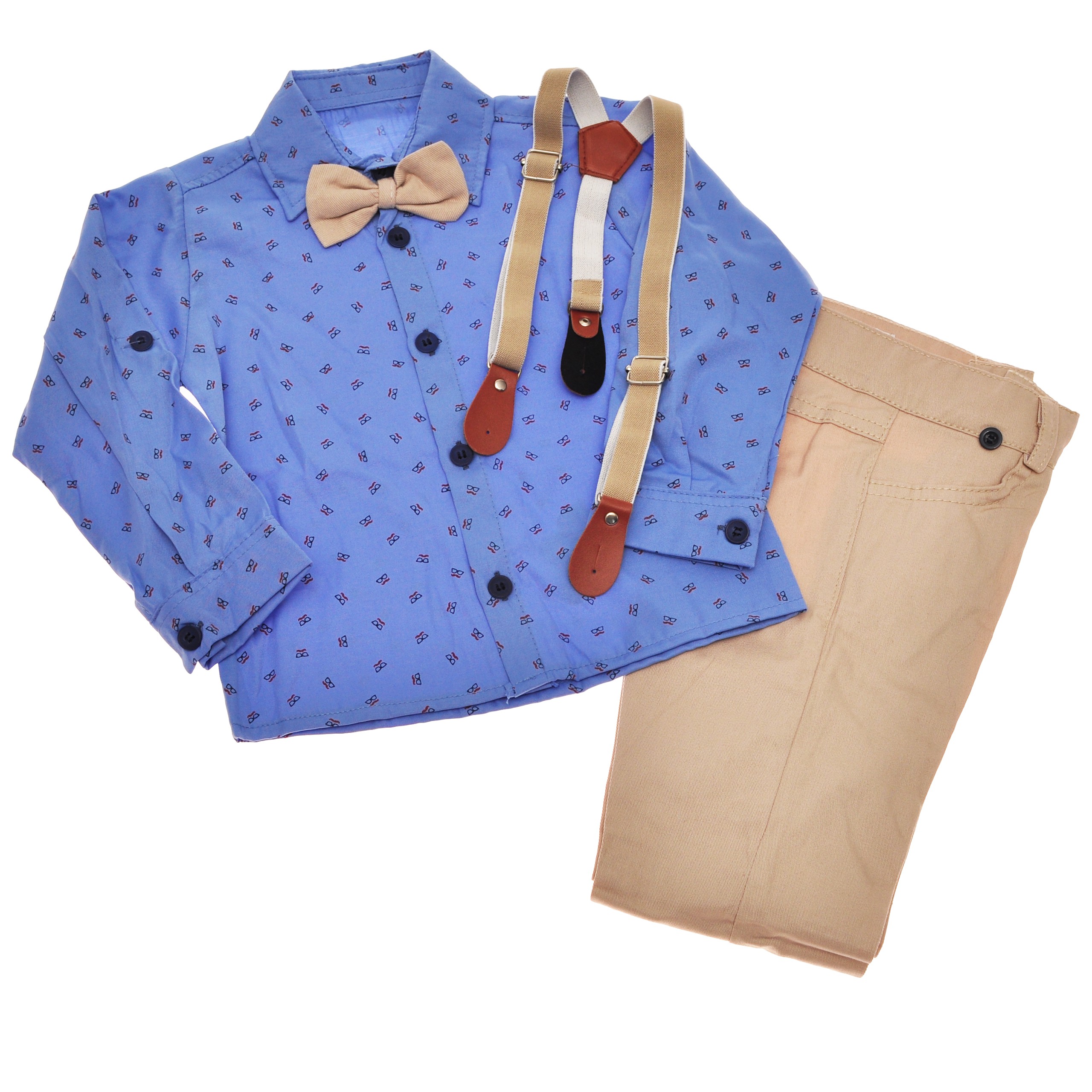 Komplet chłopięcy w skład którego wchodzą: elegancka niebieska koszula, beżowe spodnie oraz mucha i szelki.