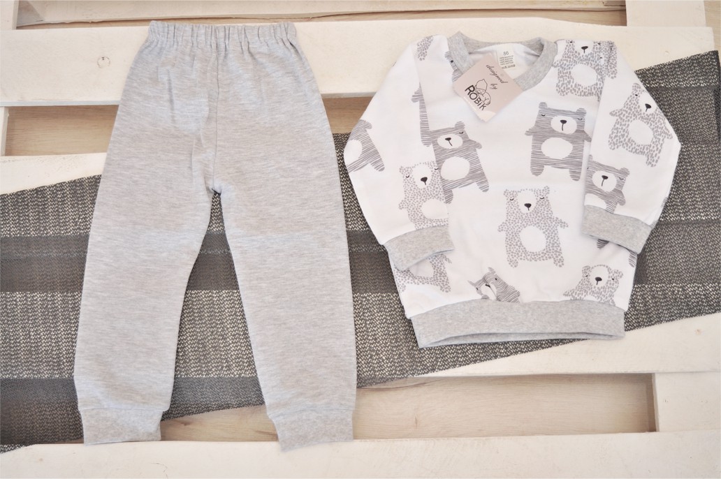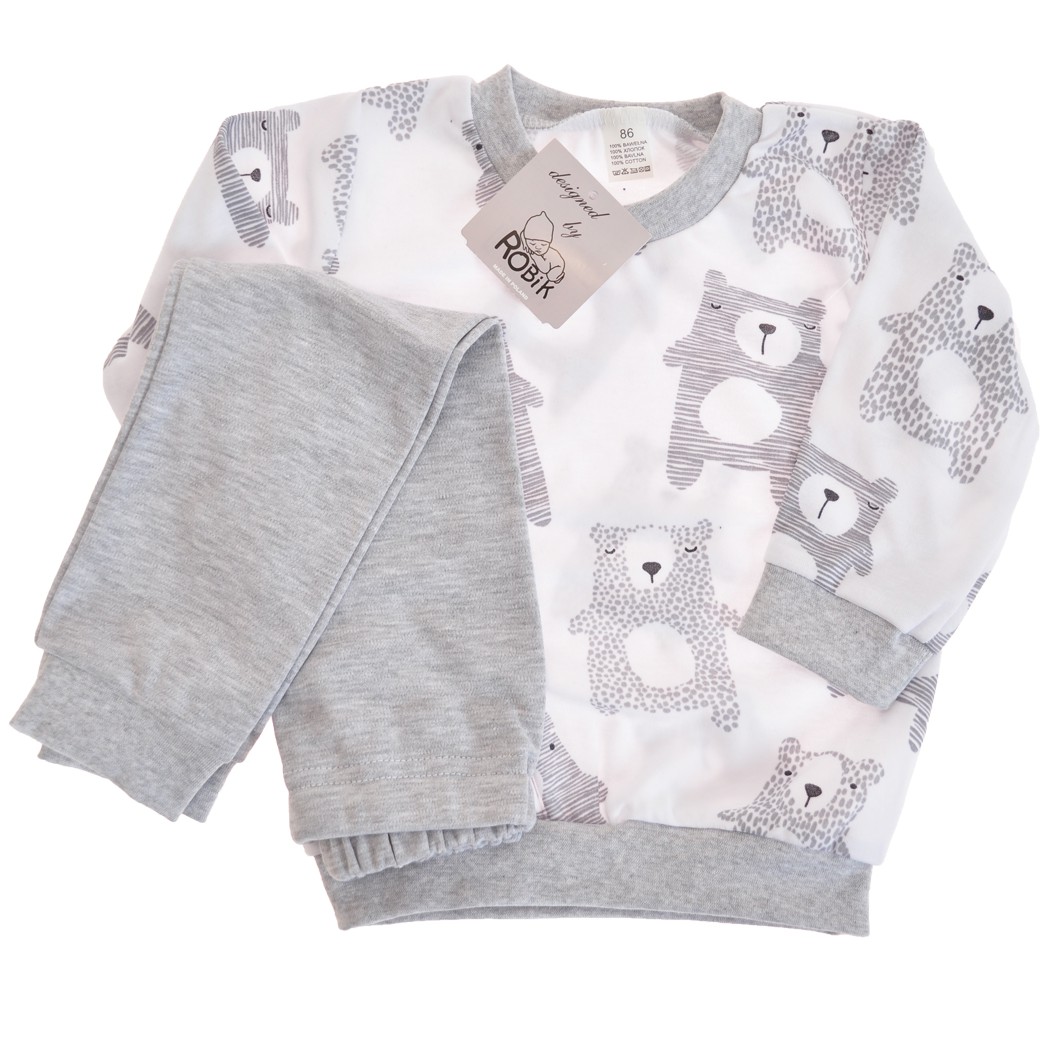 Bawełniana piżamka dziecięca o wygodnym kroju, składająca się z długich spodni i bluzeczki z długim rękawem. Bluza uszyta z białej dzianiny drukowanej w szare misie i wykończona elastycznym szarym ściągaczem. Spodenki z gładkiej bawełny w kolorze szarym posiadają gumkę w pasie, która sprawia, że spodnie dobrze utrzymują się na sylwetce, nie uciskając ciała. Nogawki spodni wykończone szarym ściągaczem.