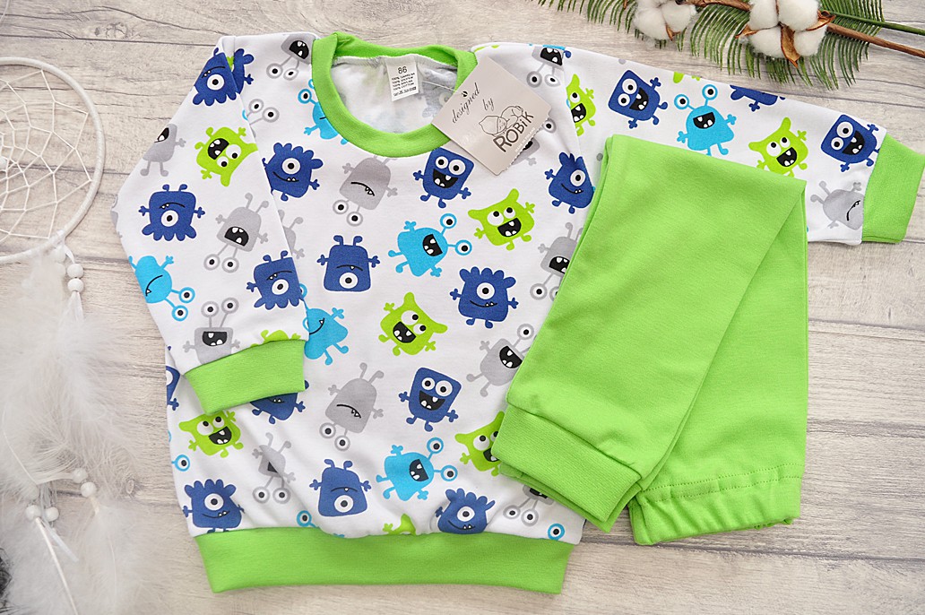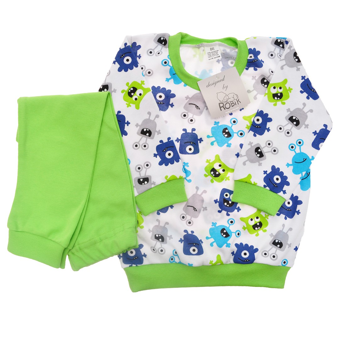 Bawełniana piżamka dziecięca o wygodnym kroju, składająca się z długich spodni i bluzeczki z długim rękawem. Bluza uszyta z białej dzianiny drukowanej w ufoludki i wykończona elastycznym trawiastym ściągaczem. Spodenki z gładkiej bawełny w kolorze trawiastym posiadają gumkę w pasie, która sprawia, że spodnie dobrze utrzymują się na sylwetce, nie uciskając ciała. Nogawki spodni wykończone trawiastym ściągaczem.