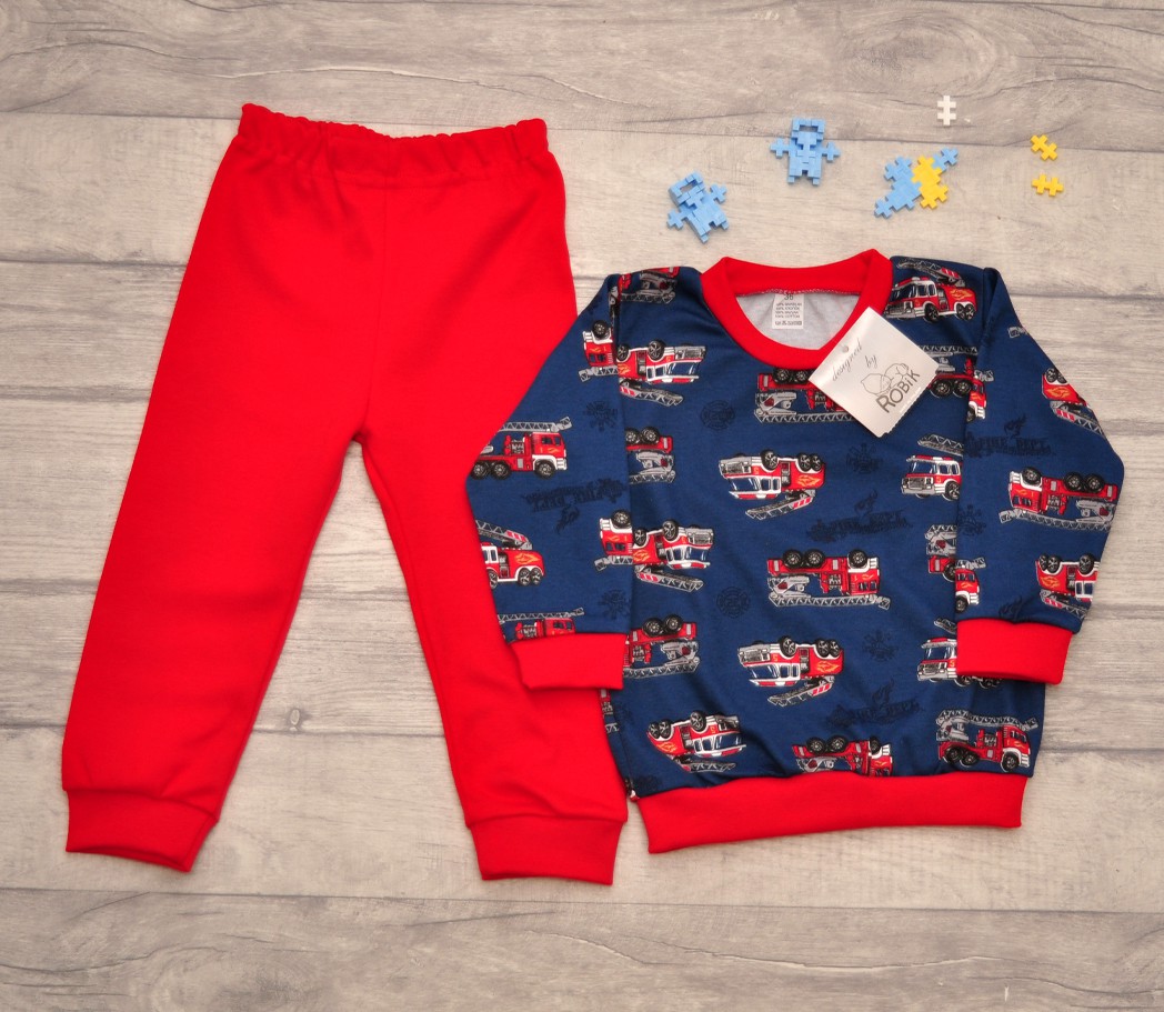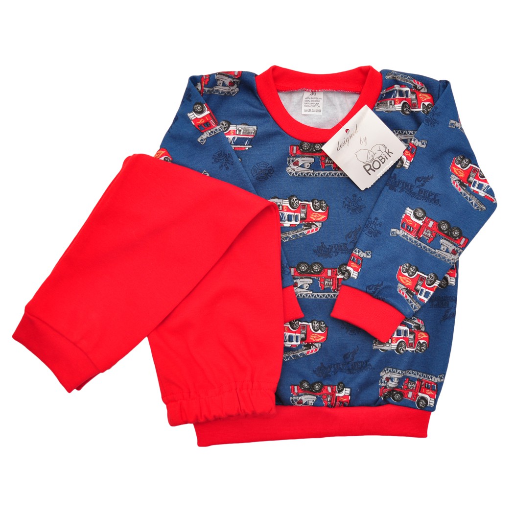 Bawełniana piżamka dziecięca w wozy strażackie o wygodnym kroju, składająca się z długich spodni i bluzeczki z długim rękawem. Bluza uszyta z granatowej dzianiny drukowanej w auta i wykończona elastycznym czerwonym ściągaczem. Spodenki z gładkiej bawełny w kolorze czerwonym posiadają gumkę w pasie, która sprawia, że spodnie dobrze utrzymują się na sylwetce, nie uciskając ciała. Nogawki spodni wykończone ściągaczem.