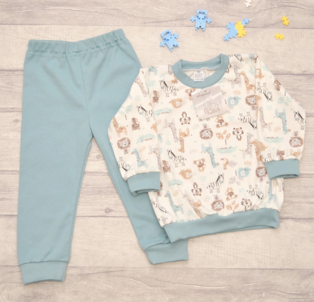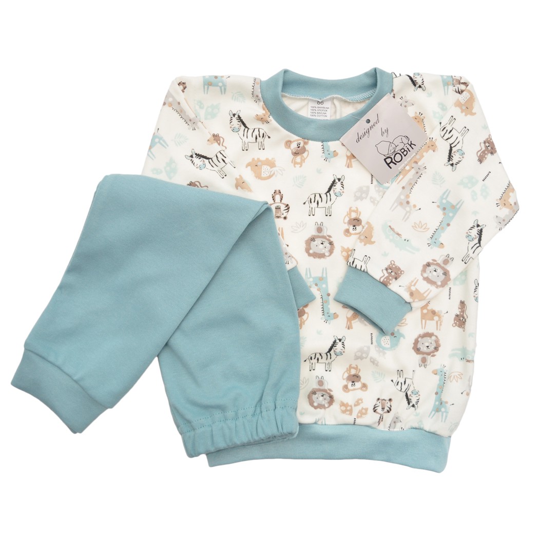 Brudno niebiesko-biała piżamka dziecięca w zwierzęta zoo.