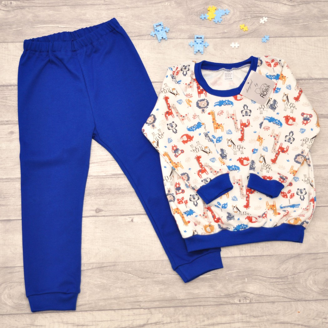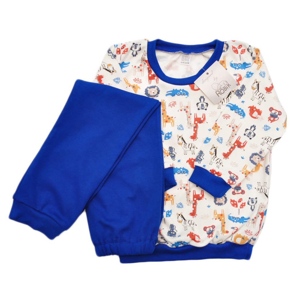 Bawełniana piżamka dziecięca o wygodnym kroju, składająca się z długich spodni i bluzeczki z długim rękawem. Bluza uszyta z ecru dzianiny drukowanej w pojazdy i wykończona elastycznym ściągaczem. Spodenki z gładkiej bawełny w kolorze chabrowym posiadają gumkę w pasie, która sprawia, że spodnie dobrze utrzymują się na sylwetce, nie uciskając ciała. Nogawki spodni wykończone ściągaczem.