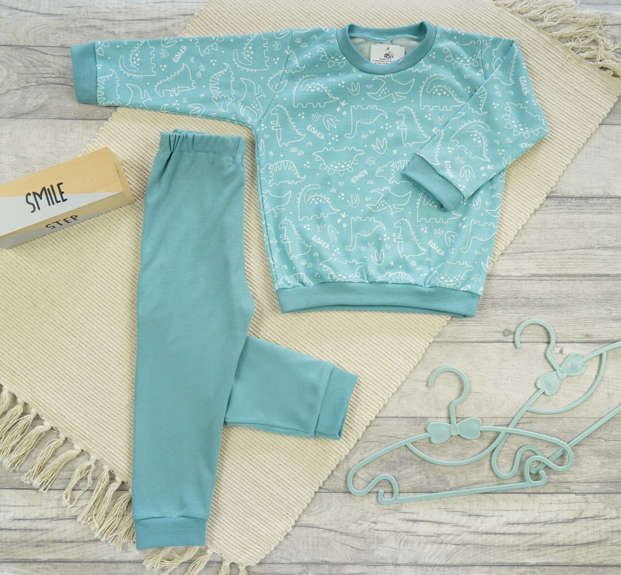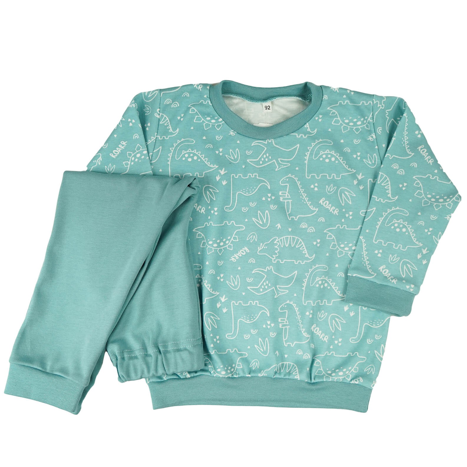 Bawełniana piżama dziecięca w dinozaury o wygodnym kroju, składająca się z długich spodni i bluzeczki z długim rękawem. Bluza uszyta z dzianiny drukowanej i wykończona elastycznym ściągaczem. Spodenki z gładkiej bawełny w kolorze iceberg posiadają gumkę w pasie, która sprawia, że dobrze utrzymują się na sylwetce, nie uciskając ciała. Nogawki spodni wykończone ściągaczem.
