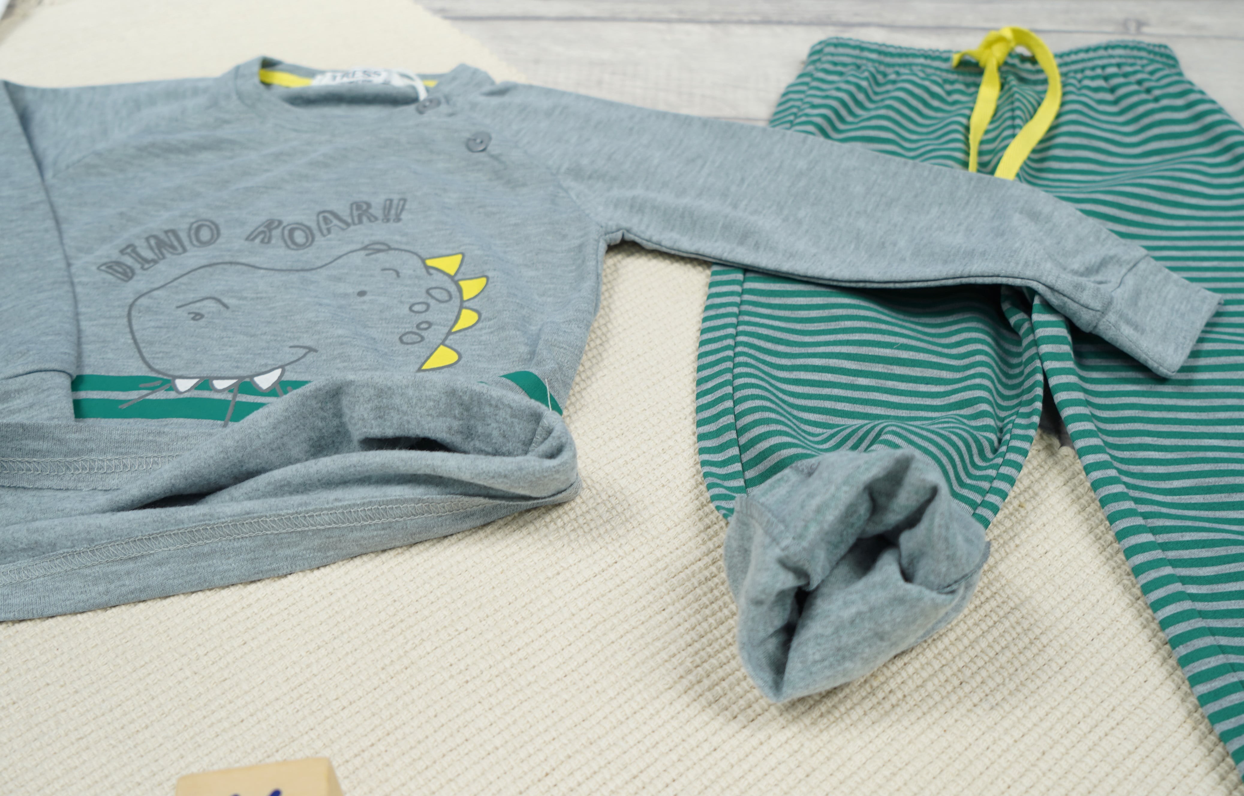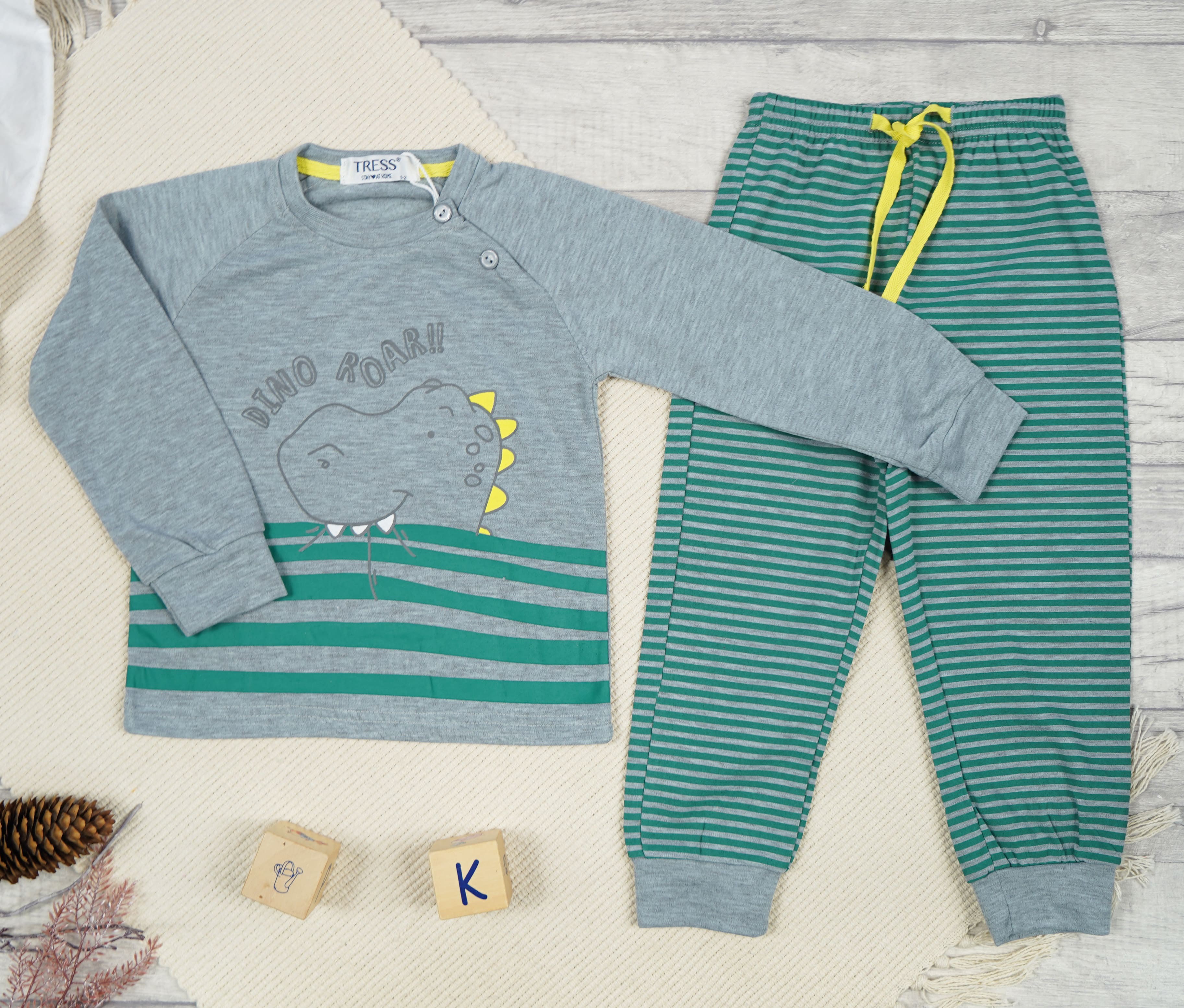 Bawełniana piżama dziecięca z dinozaurem o wygodnym kroju, składająca się z długich spodni z gumką w pasie a także dodatkowym sznurkiem, umożliwiającym idealne dopasowanie do sylwetki oraz bluzeczki z długim rękawem. Piżamka uszyta z tkaniny ocieplanej od wewnątrz delikatnym meszkiem, dzięki czemu zapewni odpowiedni komfort cieplny szczególnie w chłodniejsze noce. Nogawki spodni wykończone ściągaczem.