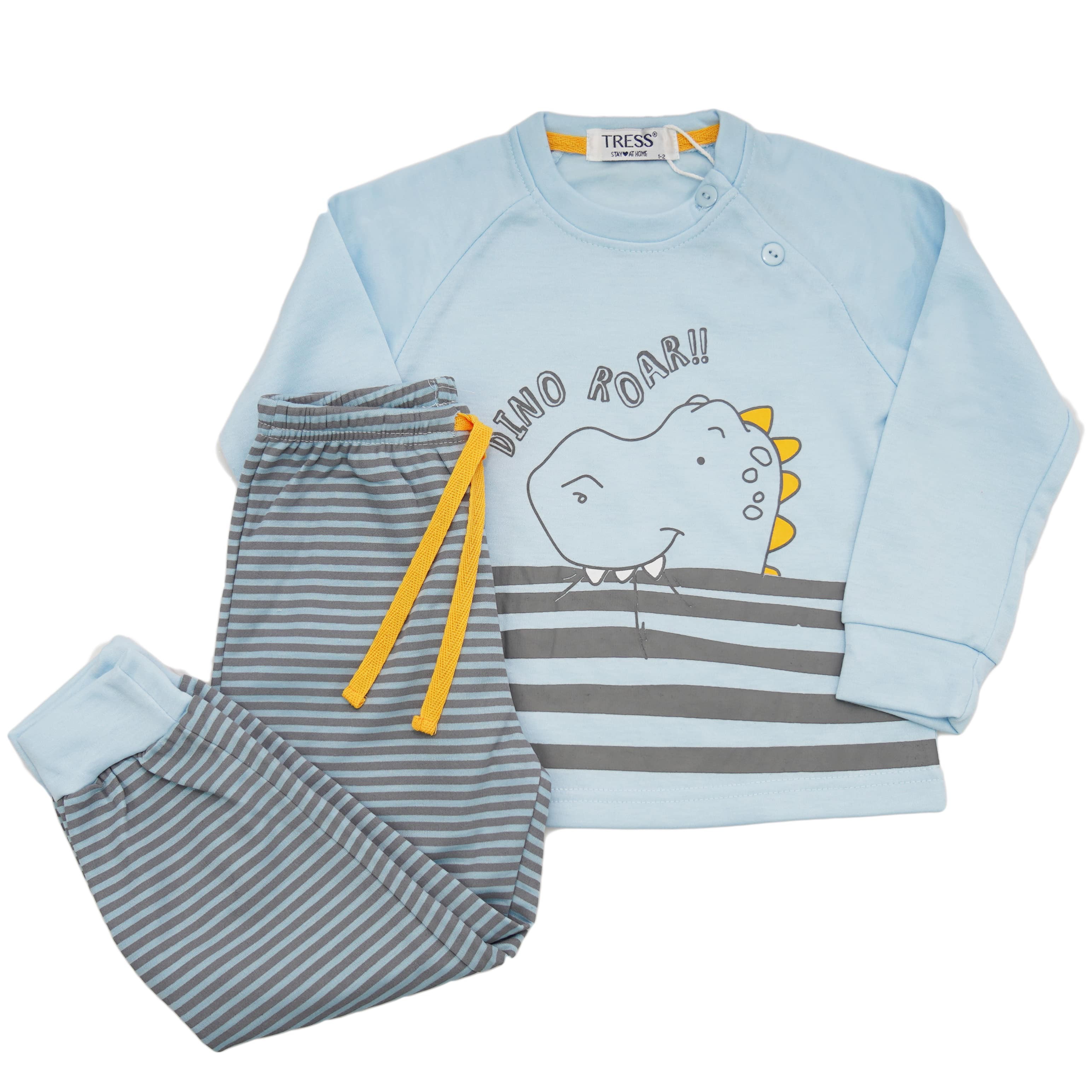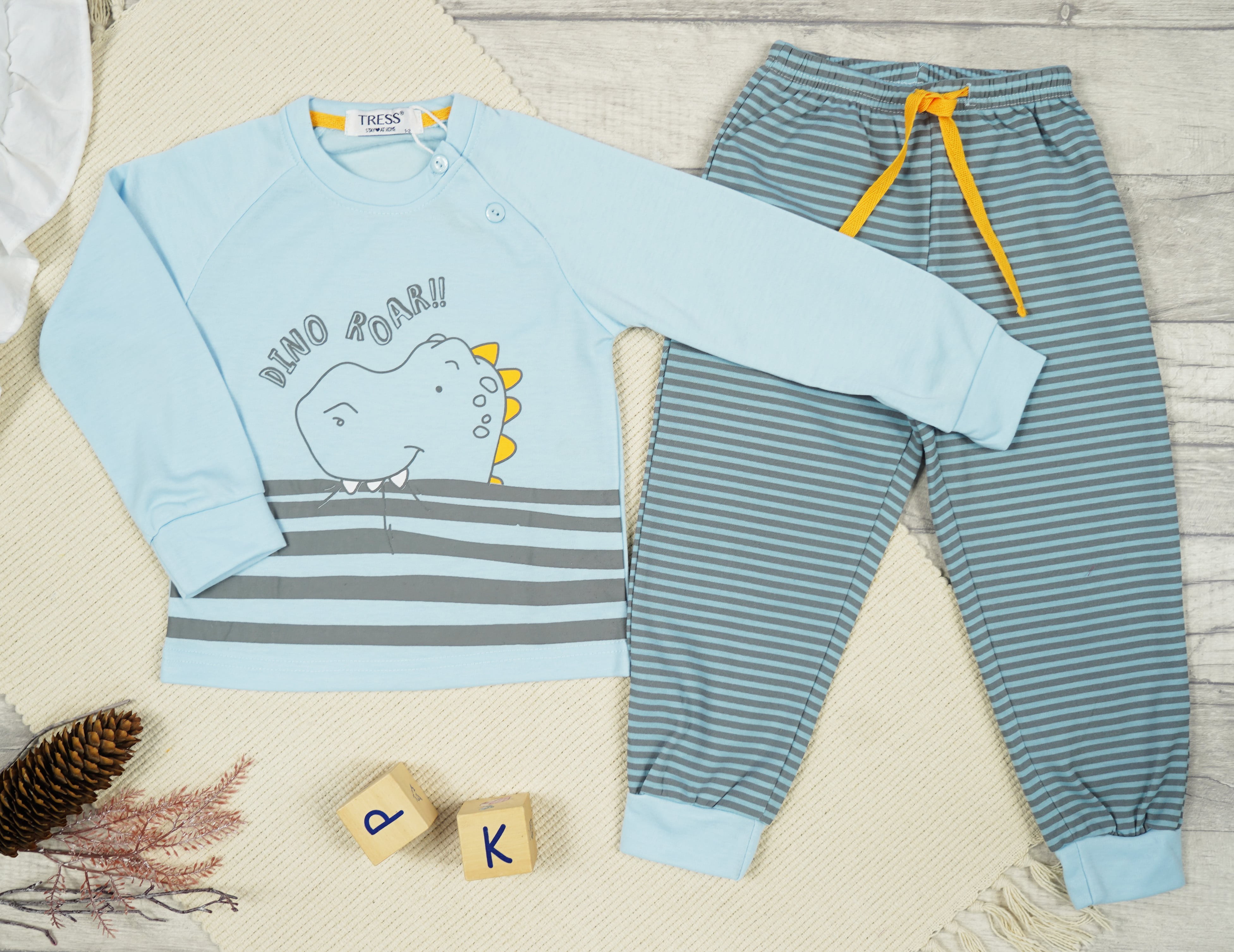 Bawełniana piżama dziecięca z dinozaurem o wygodnym kroju, składająca się z długich spodni z gumką w pasie a także dodatkowym sznurkiem, umożliwiającym idealne dopasowanie do sylwetki oraz bluzeczki z długim rękawem. Piżamka uszyta z tkaniny ocieplanej od wewnątrz delikatnym meszkiem, dzięki czemu zapewni odpowiedni komfort cieplny szczególnie w chłodniejsze noce. Nogawki spodni wykończone ściągaczem.