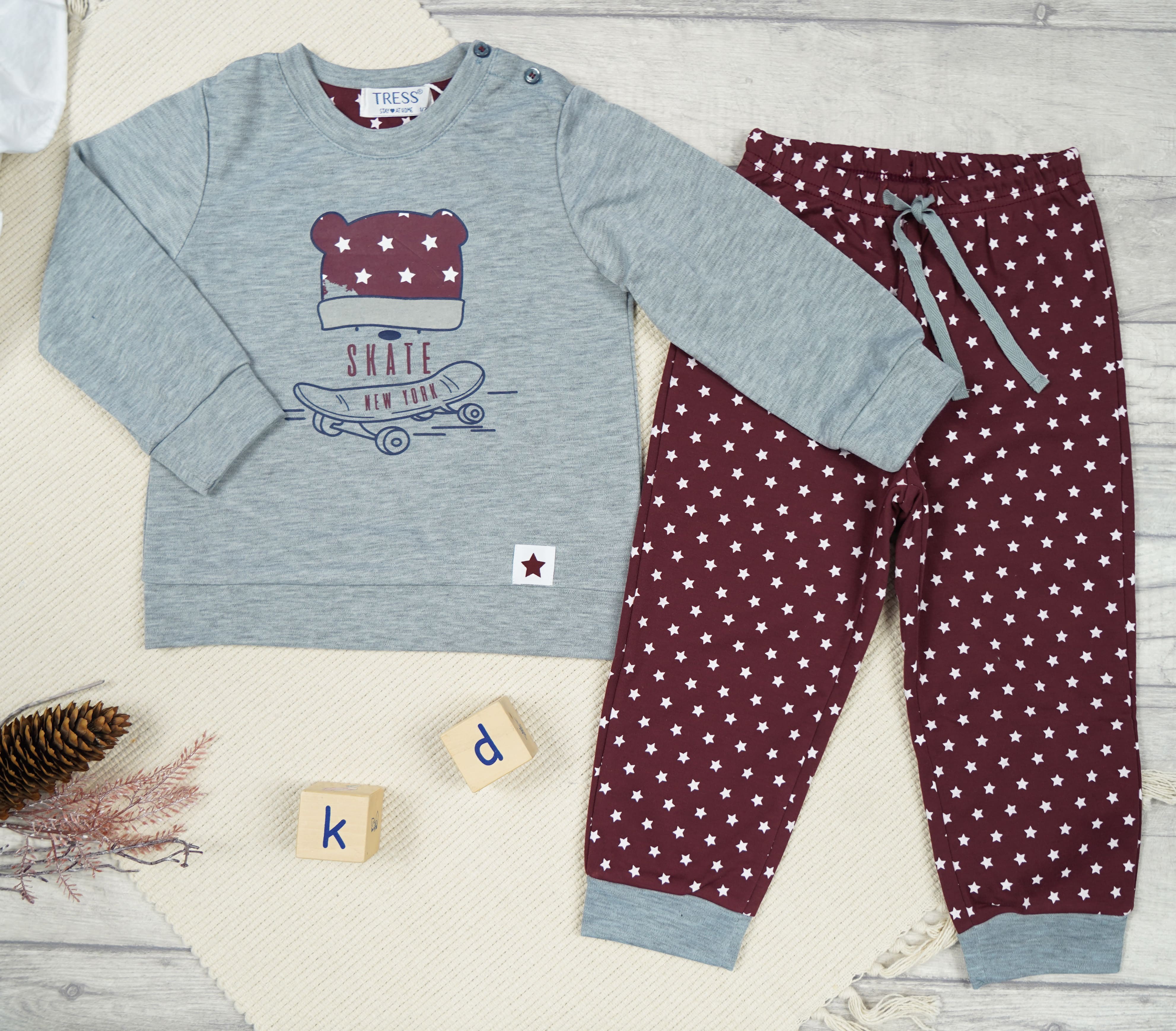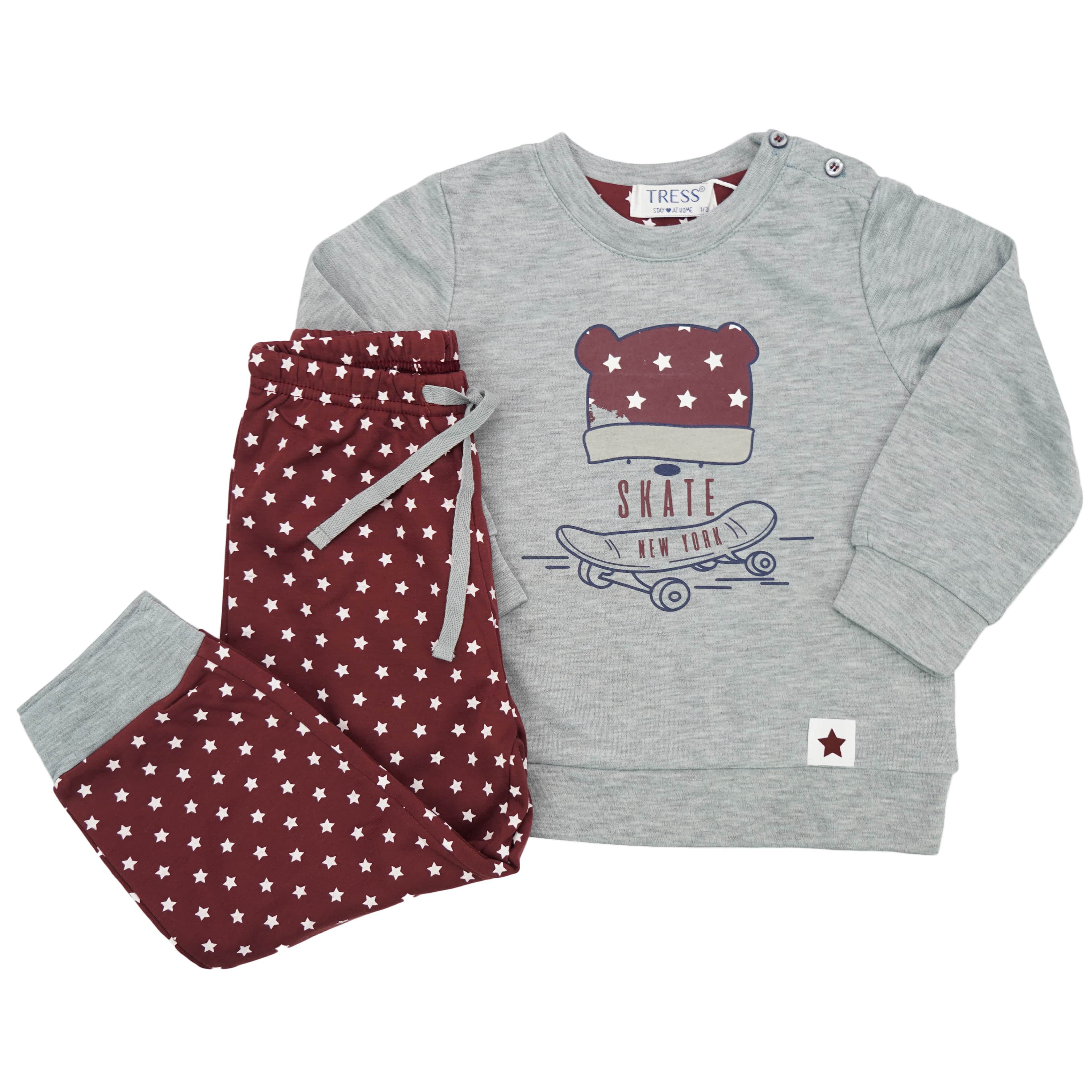 PIŻAMA dziecięca ciepła na meszku szara MIŚ SKATE gwiazdki długi rękaw