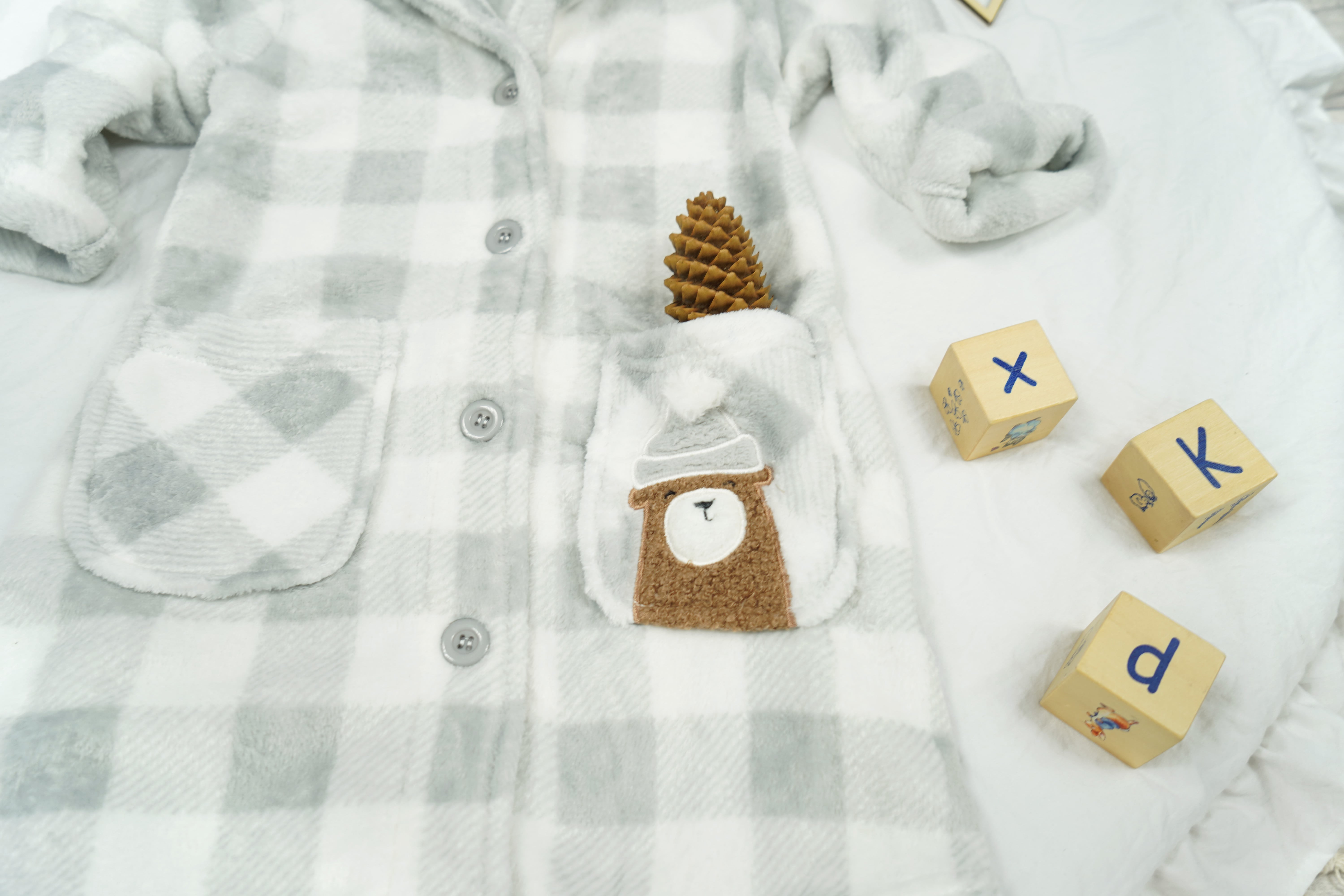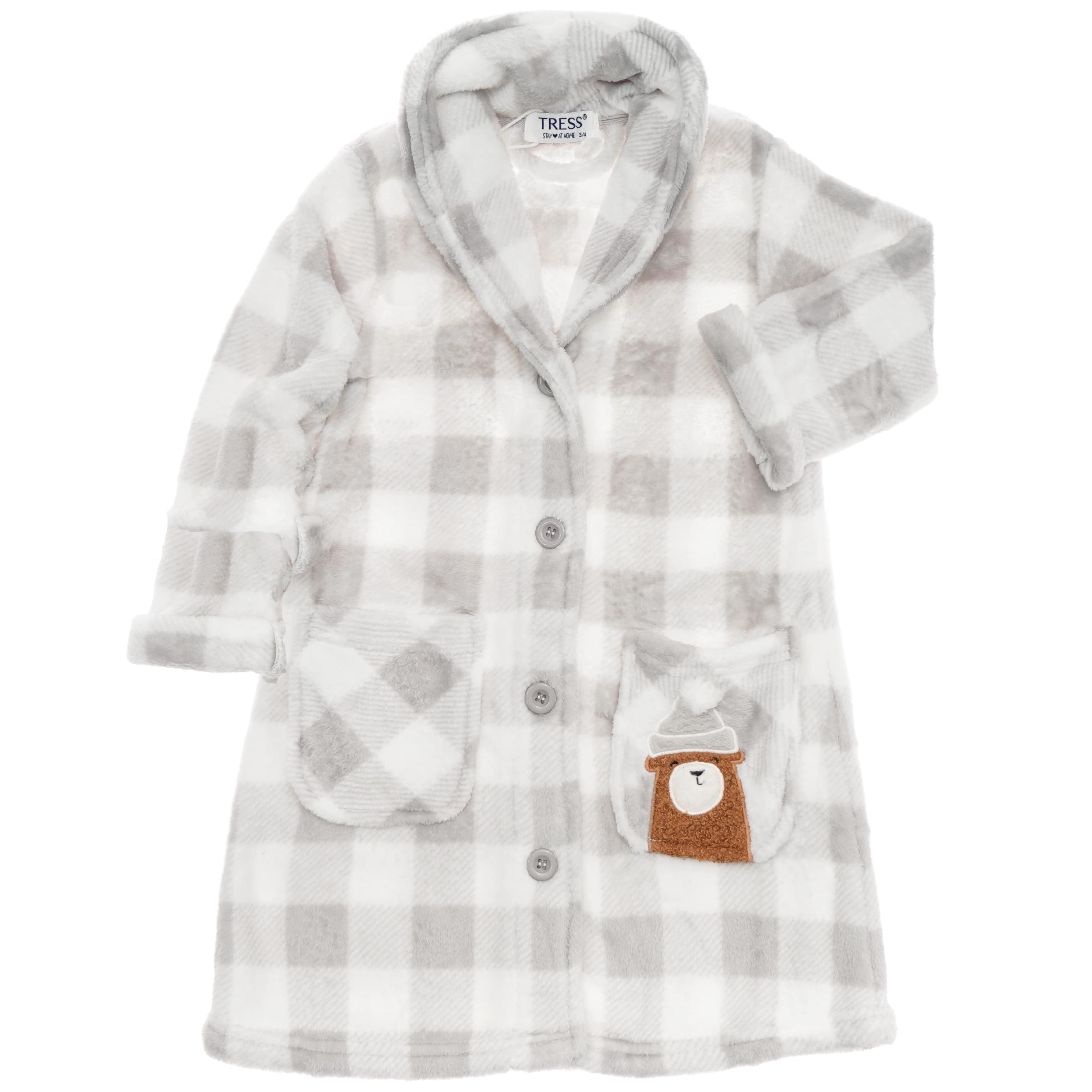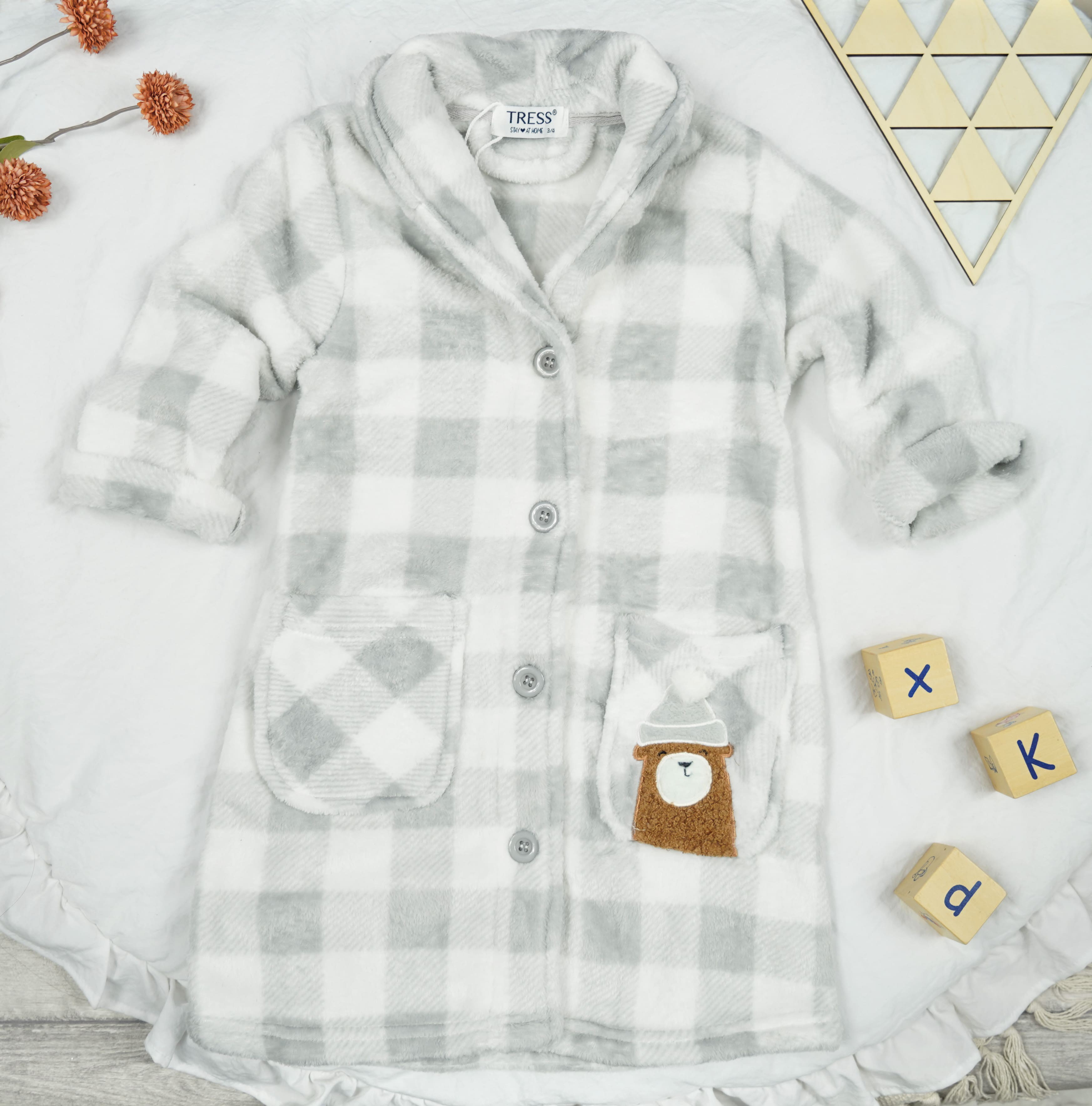 Szary ciepły SZLAFROK dziecięcy w kratkę kieszonki z misiem