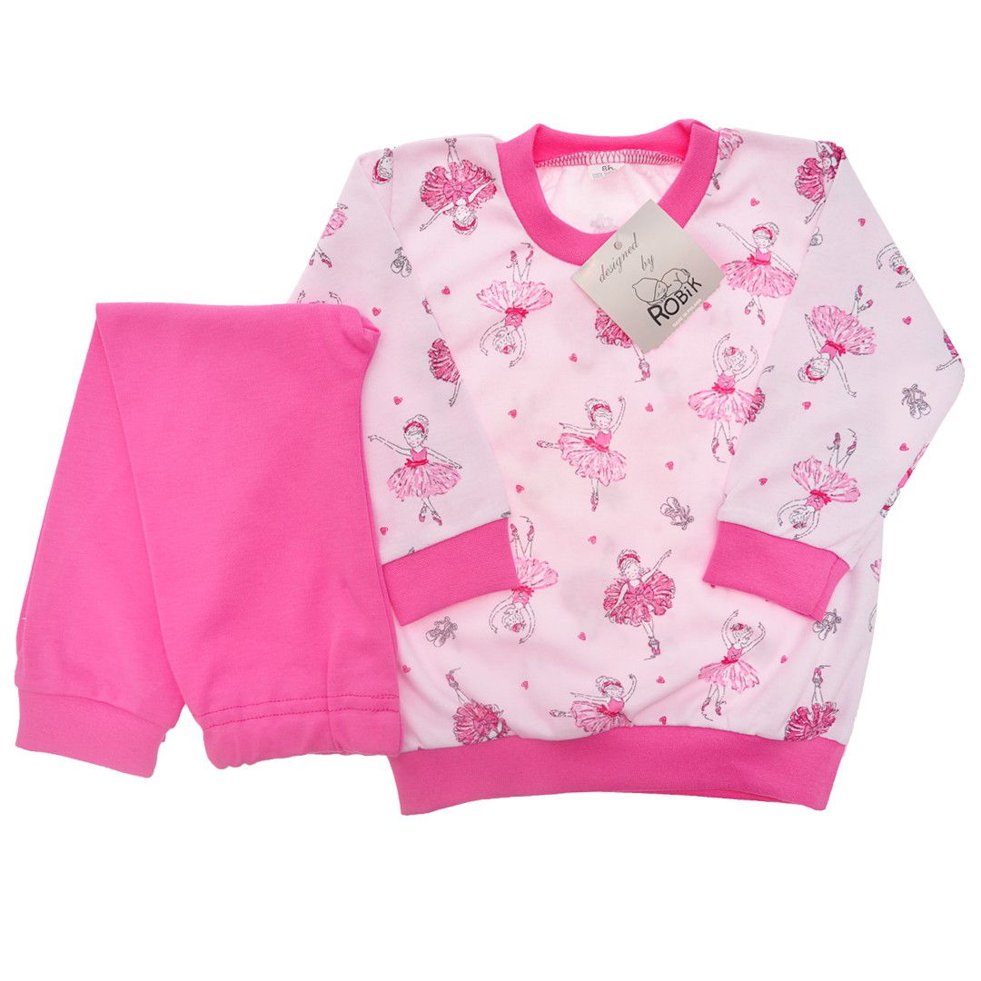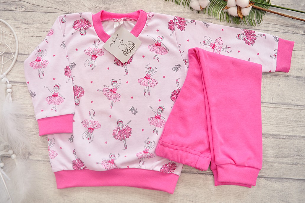 Bawełniana piżamka dziecięca o wygodnym kroju, składająca się z długich spodni i bluzeczki z długim rękawem. Bluza uszyta z różowej dzianiny drukowanej w baletnice i wykończona elastycznym amarantowym ściągaczem. Spodenki z gładkiej bawełny w kolorze amarantowym posiadają gumkę w pasie, która sprawia, że spodnie dobrze utrzymują się na sylwetce, nie uciskając ciała. Nogawki spodni wykończone amarantowym ściągaczem.