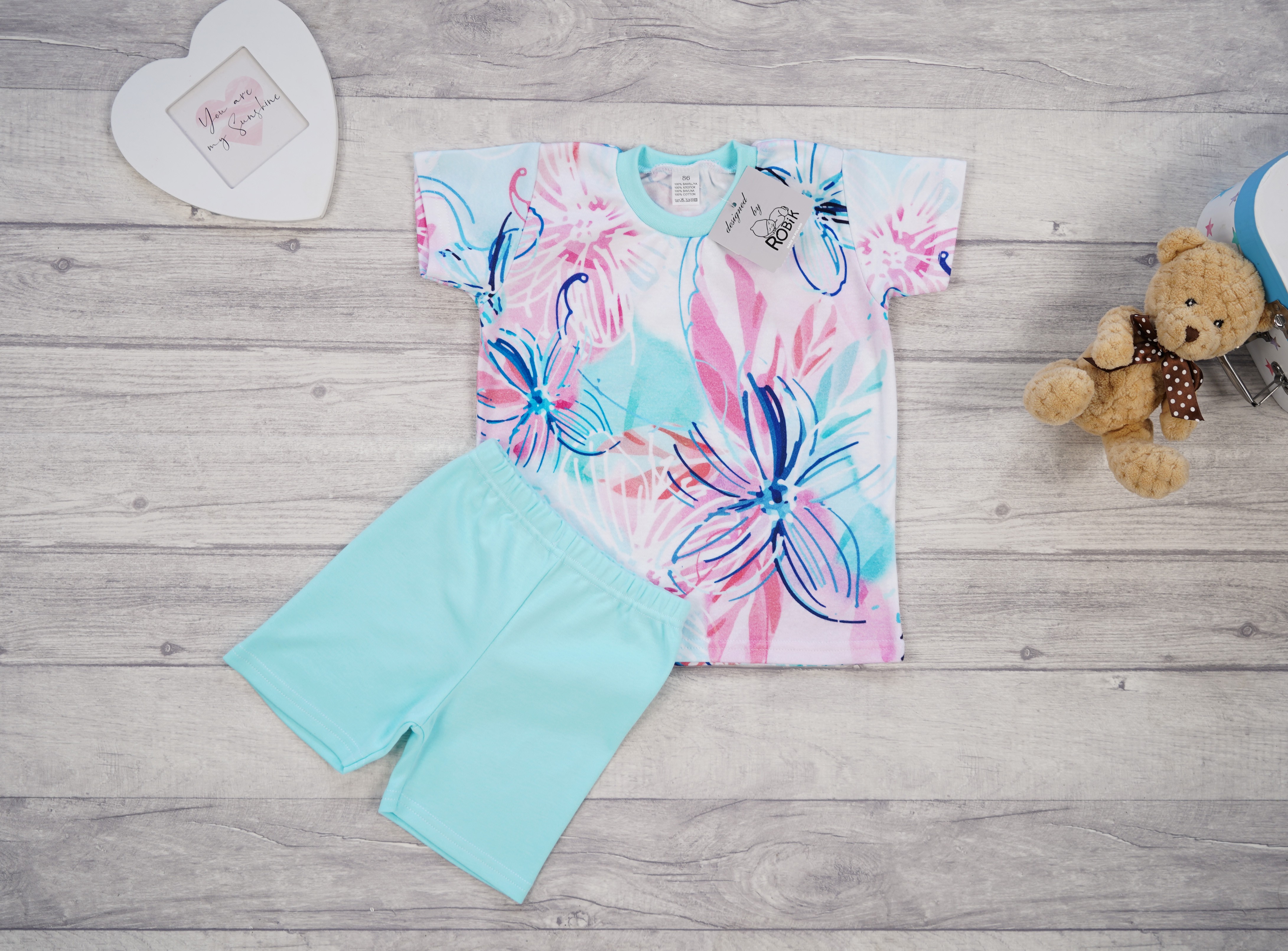 Piżamka letnia szyta z oddychającej, delikatnej w dotyku 100% bawełny polskiego producenta. Materiał zachowuje swoje właściwości (rozmiar, kolor) nawet po wielokrotnym praniu.