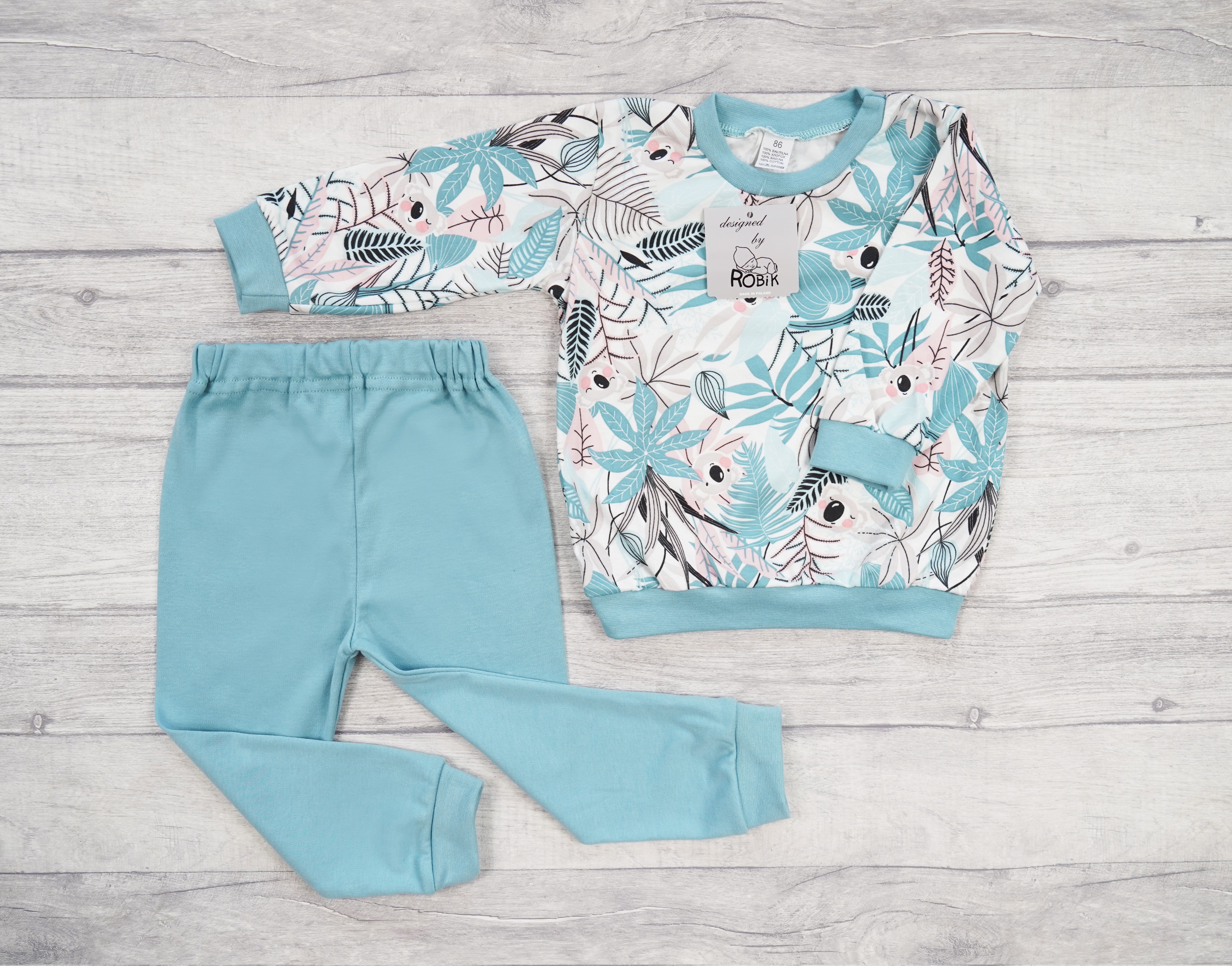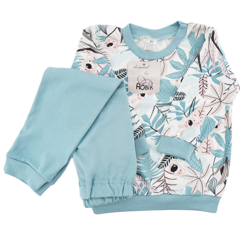 Bawełniana piżama dziecięca w misie koala o wygodnym kroju, składająca się z długich spodni i bluzeczki z długim rękawem. Bluza uszyta z jasnej dzianiny drukowanej w misie koala i wykończona elastycznym ściągaczem. Spodenki z gładkiej bawełny w kolorze iceberg posiadają gumkę w pasie, która sprawia, że dobrze utrzymują się na sylwetce, nie uciskając ciała. Nogawki spodni wykończone ściągaczem.