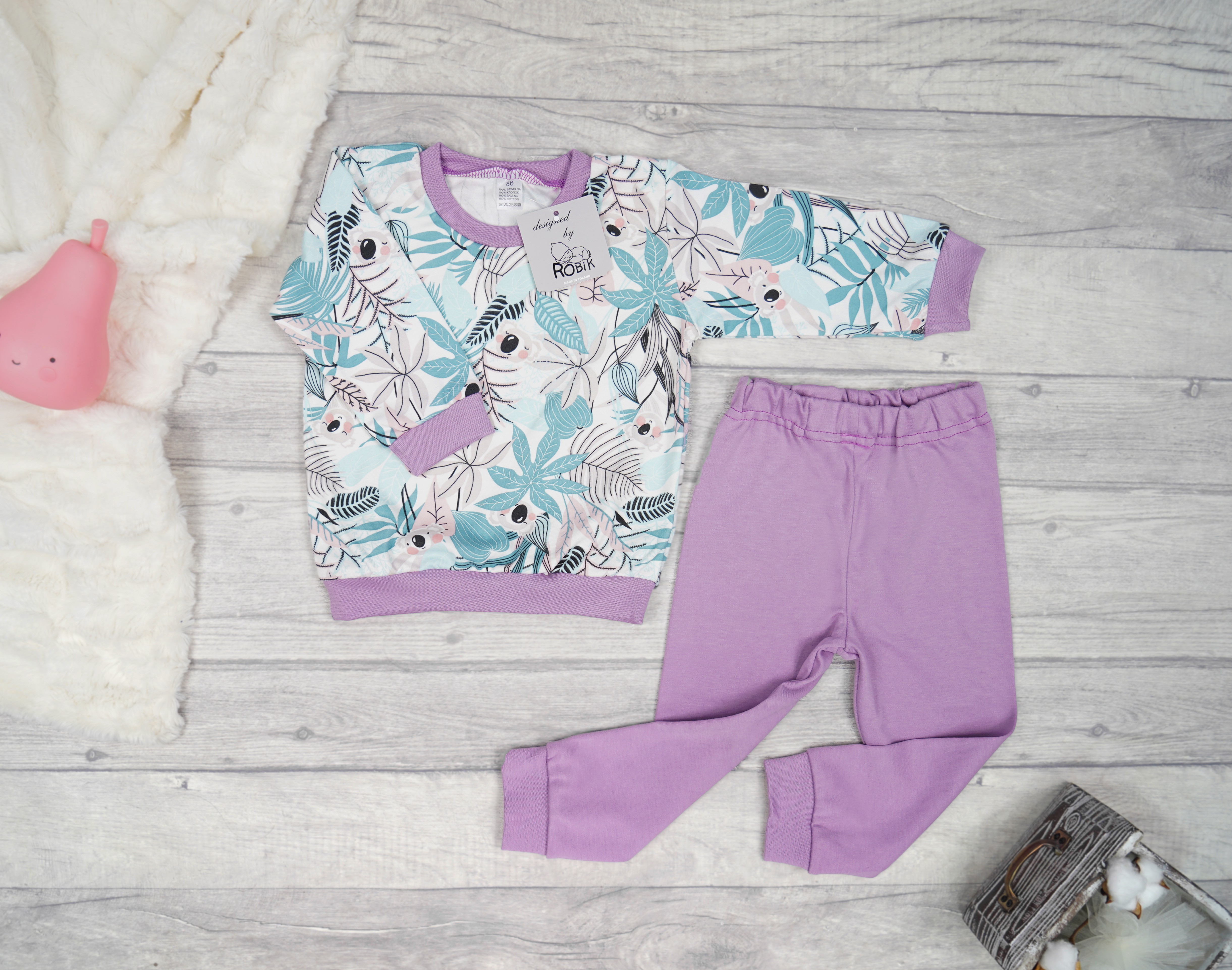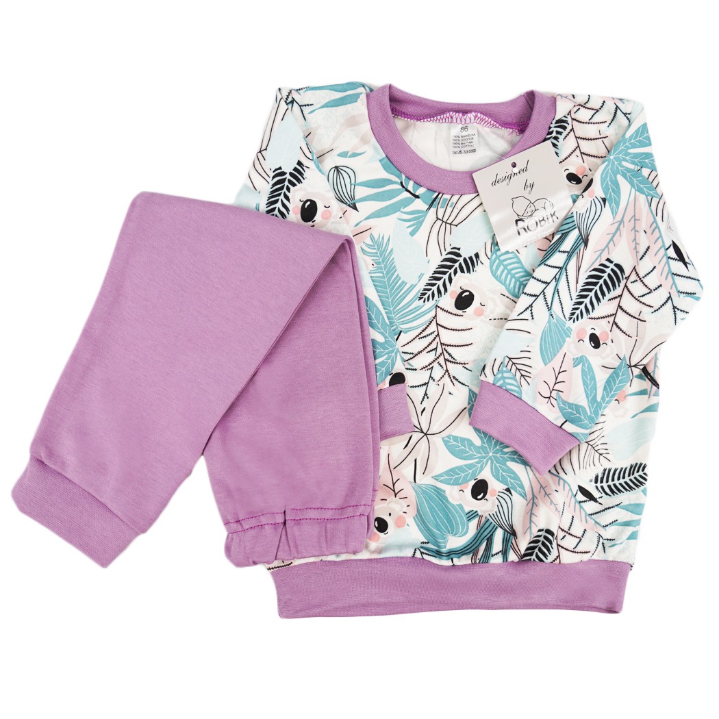 Bawełniana piżama dziecięca w misie koala o wygodnym kroju, składająca się z długich spodni i bluzeczki z długim rękawem. Bluza uszyta z ecru dzianiny drukowanej w misie koala i wykończona elastycznym ściągaczem. Spodenki z gładkiej bawełny w kolorze wrzosowym posiadają gumkę w pasie, która sprawia, że dobrze utrzymują się na sylwetce, nie uciskając ciała. Nogawki spodni wykończone ściągaczem.