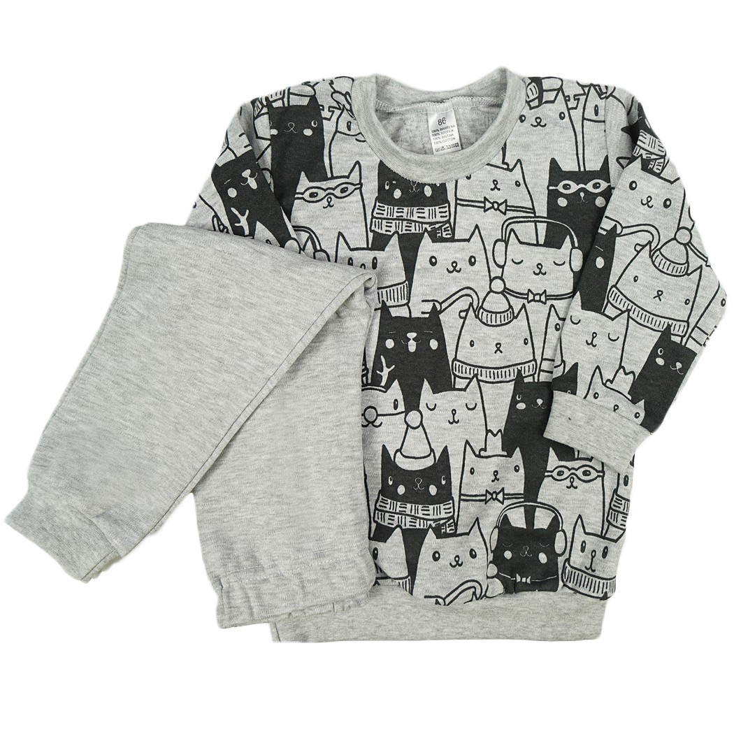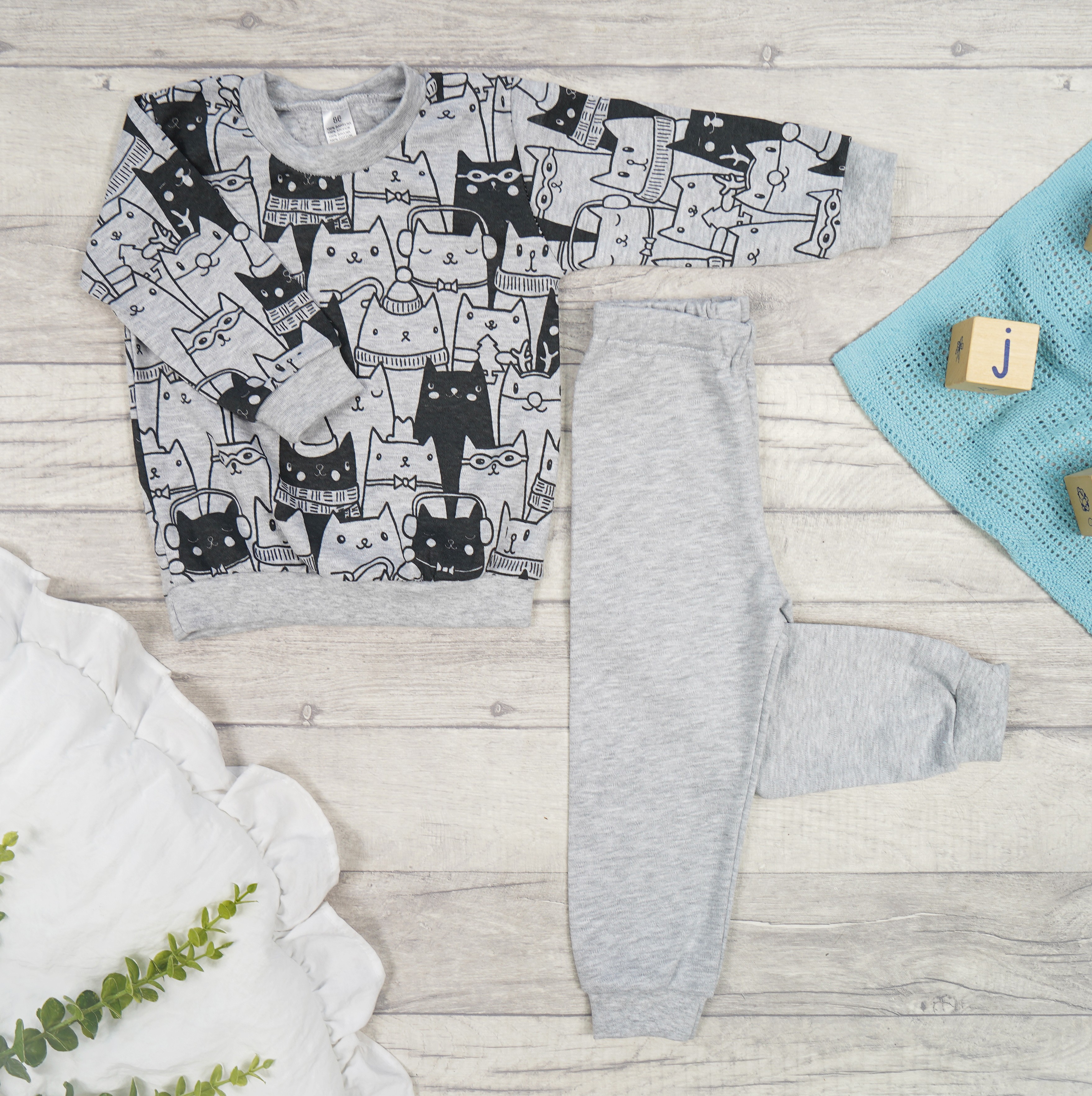 Bawełniana piżama dziecięca w kotki o wygodnym kroju, składająca się z długich spodni i bluzeczki z długim rękawem. Bluza uszyta z jasnej dzianiny drukowanej w kotki i wykończona elastycznym ściągaczem. Spodenki z gładkiej bawełny w kolorze szarym posiadają gumkę w pasie, która sprawia, że dobrze utrzymują się na sylwetce, nie uciskając ciała. Nogawki spodni wykończone ściągaczem.