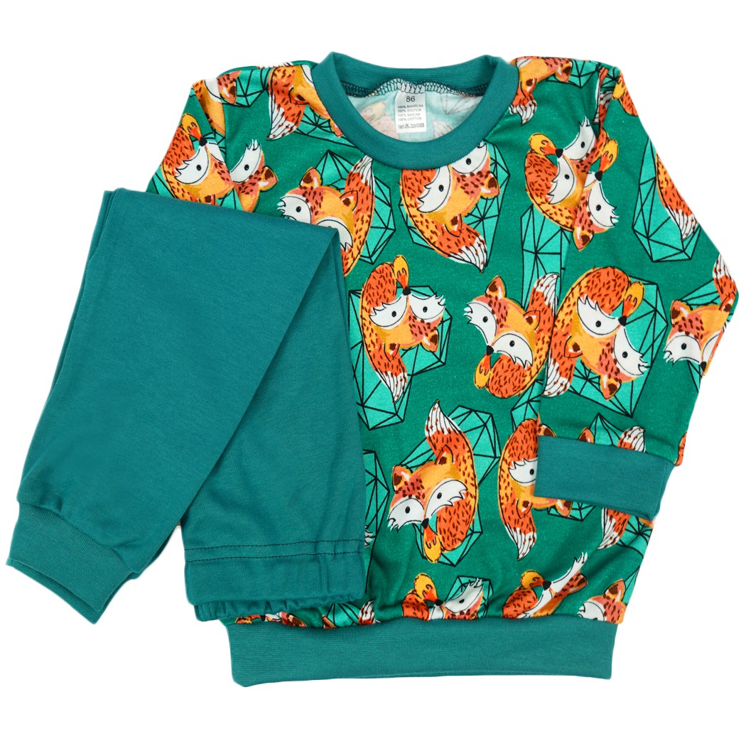 Bawełniana piżama dziecięca w liski o wygodnym kroju, składająca się z długich spodni i bluzeczki z długim rękawem. Bluza uszyta dzianiny drukowanej w liski i wykończona elastycznym ściągaczem. Spodenki z gładkiej bawełny w kolorze butelkowej zieleni posiadają gumkę w pasie, która sprawia, że dobrze utrzymują się na sylwetce, nie uciskając ciała. Nogawki spodni wykończone ściągaczem.