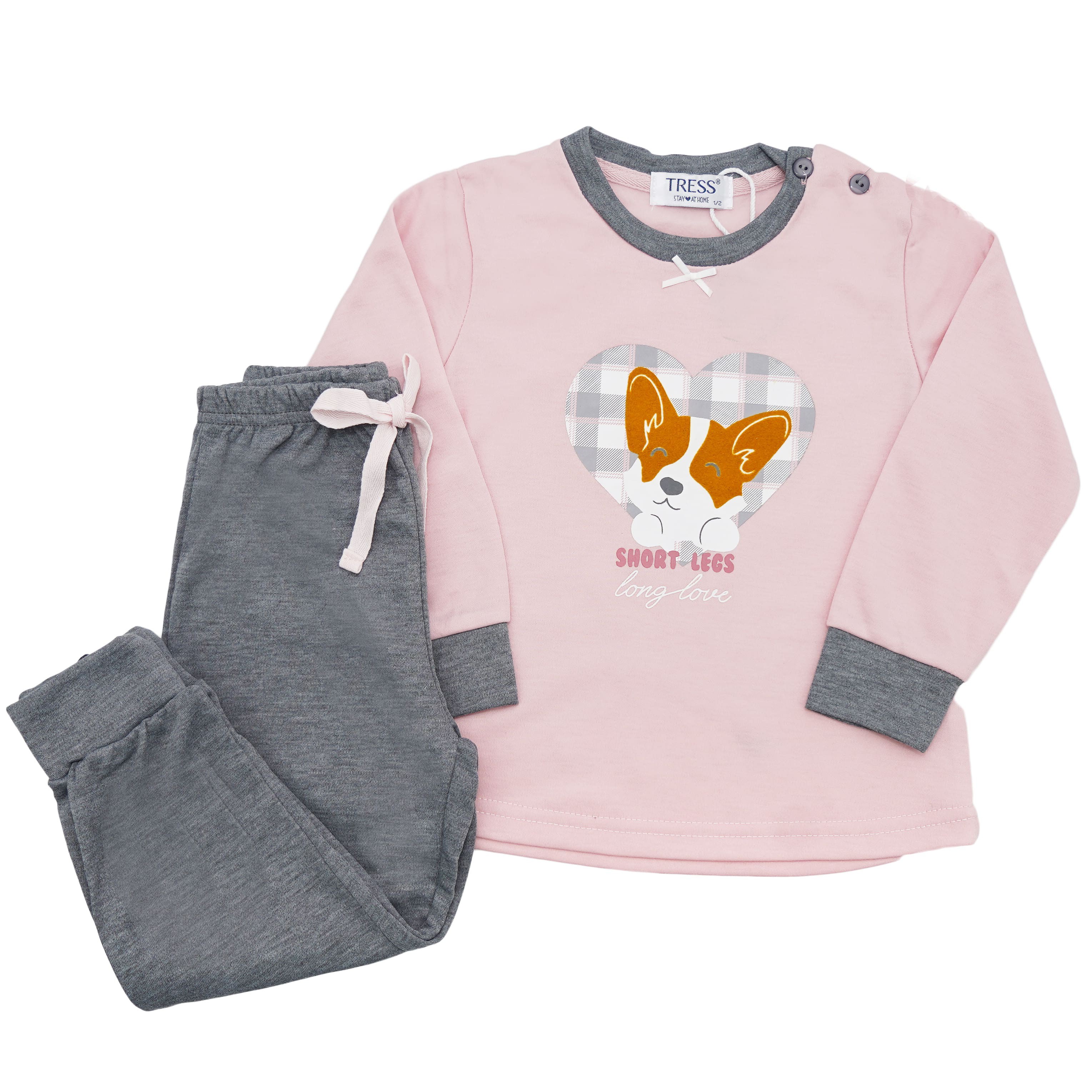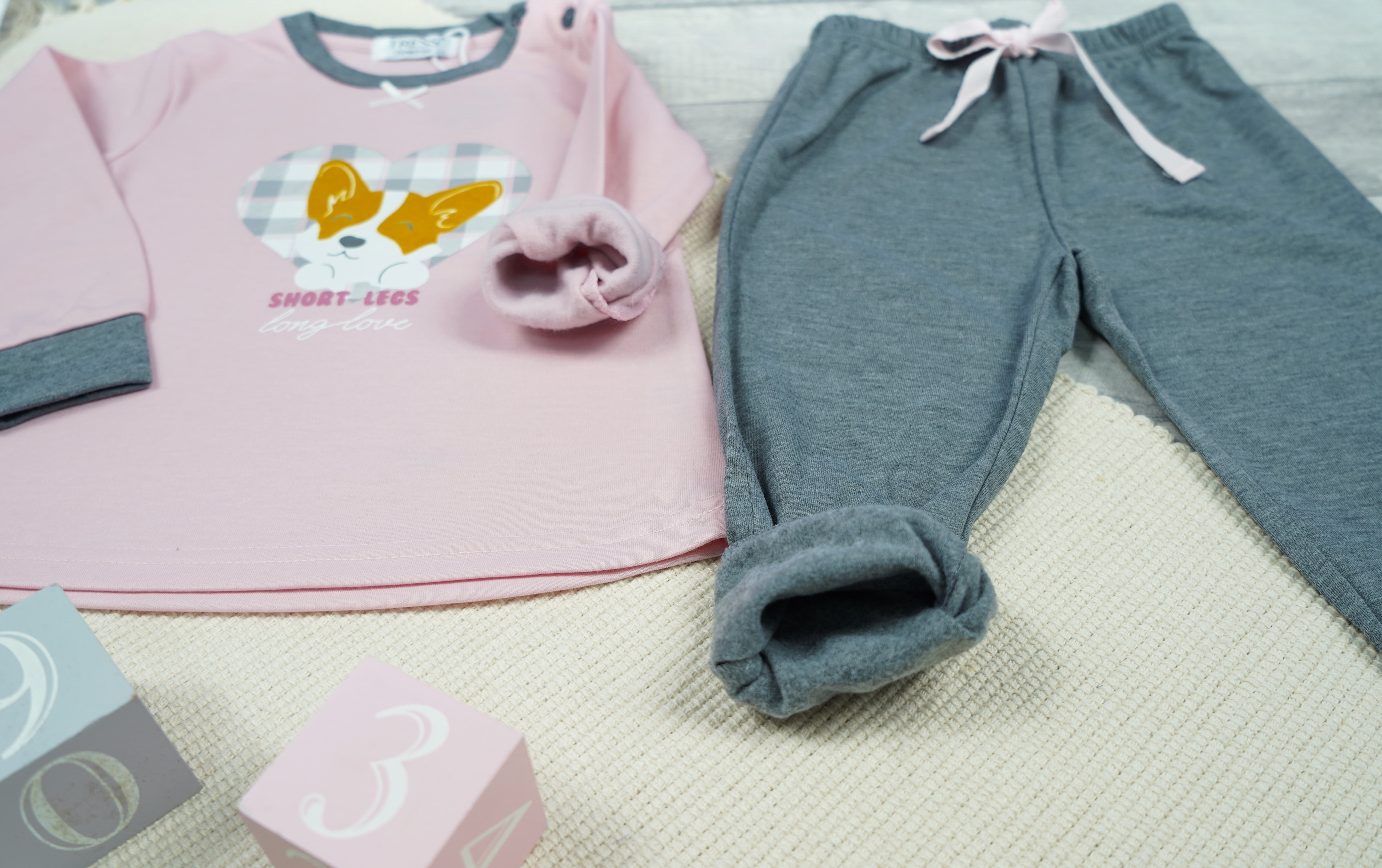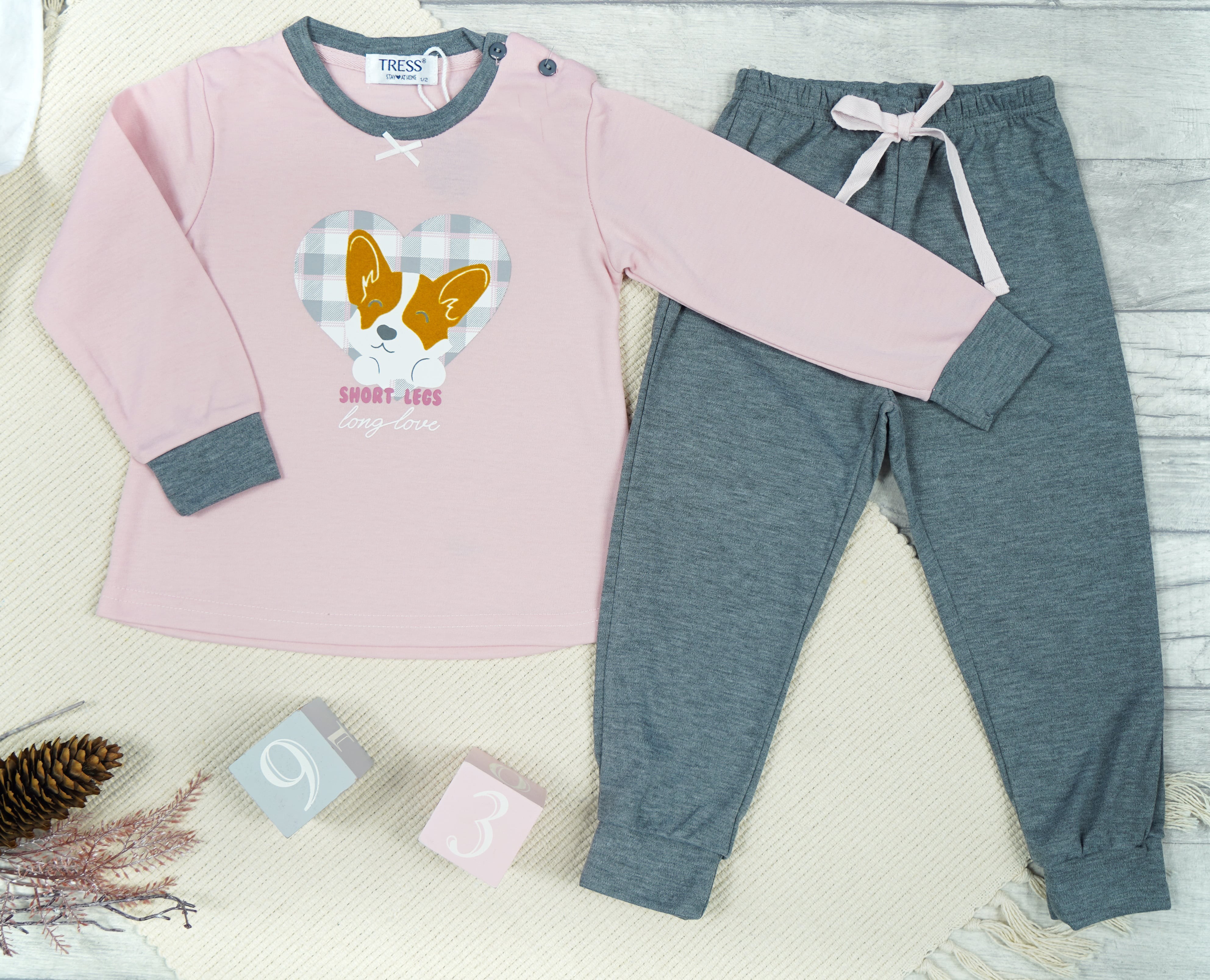 PIŻAMA dziecięca ciepła na meszku pudrowy róż z pieskiem długi rękaw szare spodnie