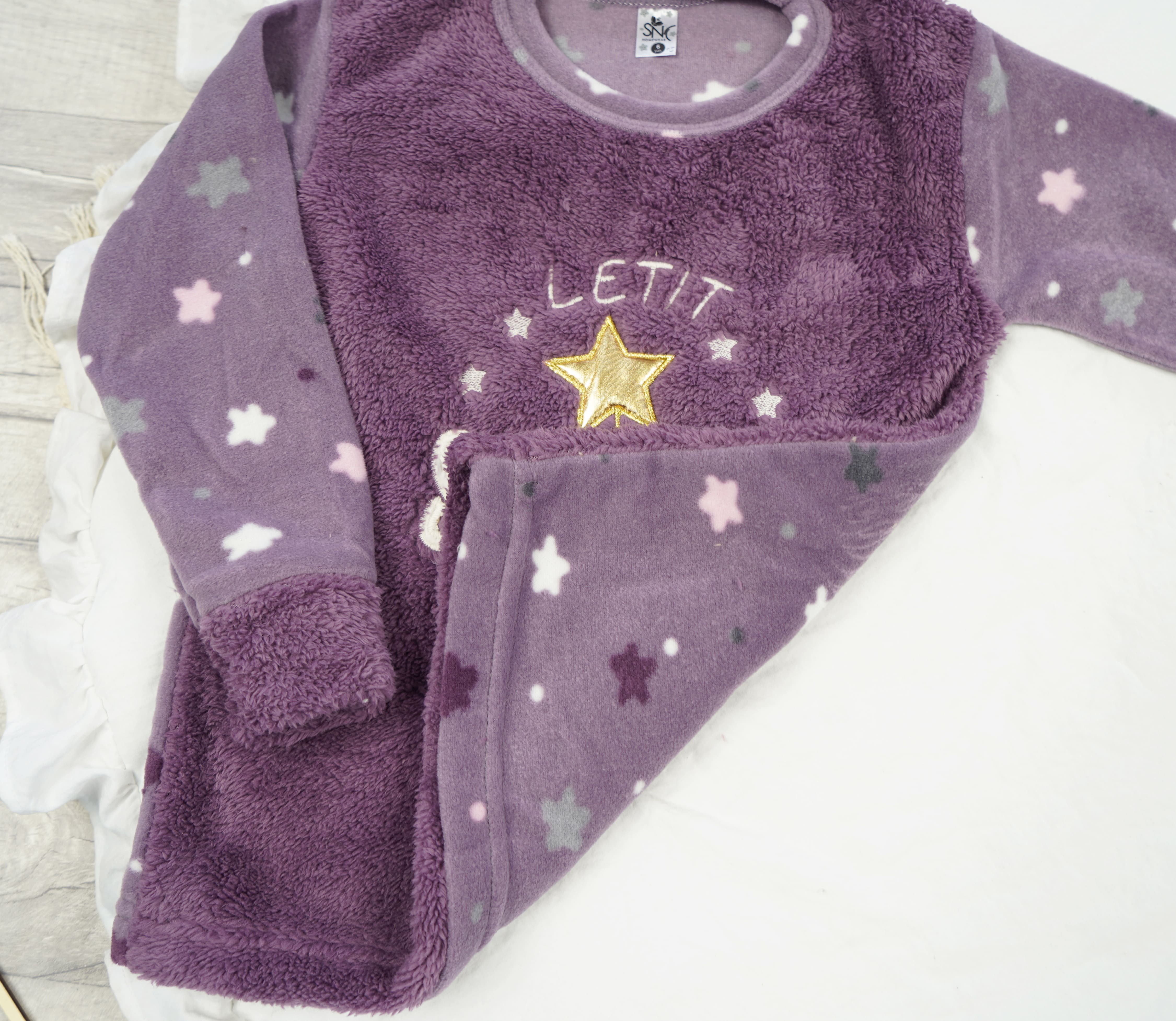 Polarowo- pluszowa piżama dziecięca o wygodnym kroju, składająca się z długich spodni i bluzeczki z długim rękawem. Bluza uszyta z miękkiego polaru w gwiazdki z pluszowym wykończeniem. Spodenki posiadają gumkę w pasie, która sprawia, że dobrze utrzymują się na sylwetce, nie uciskając ciała. Proste nogawki spodni, wykończone pluszowym mankietem.